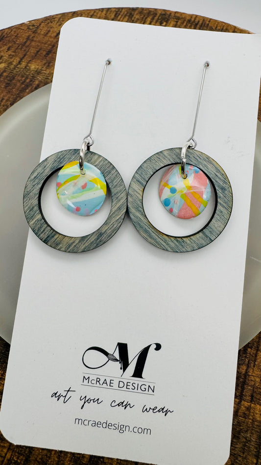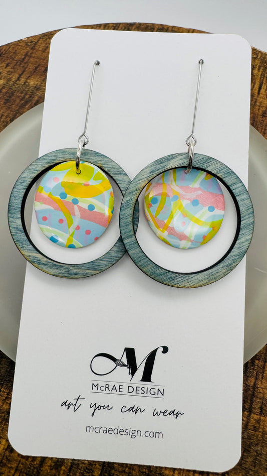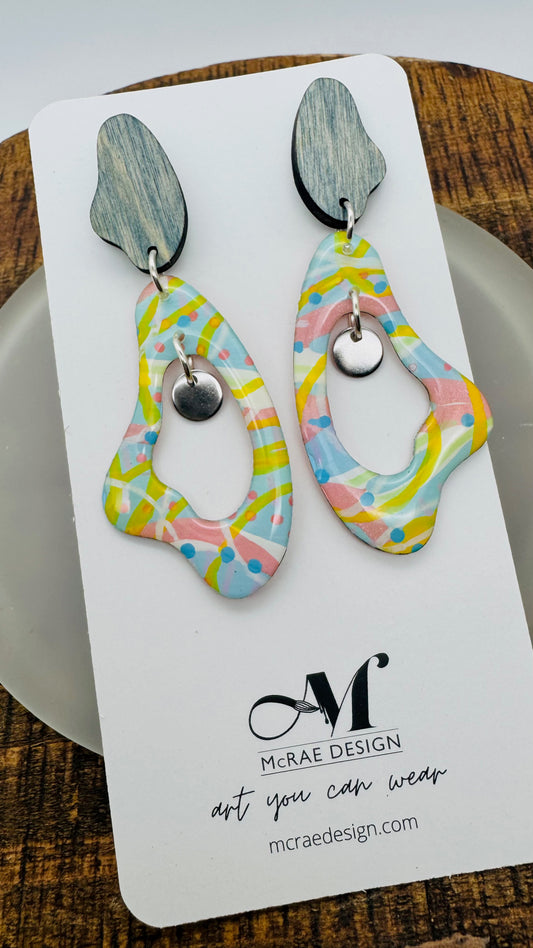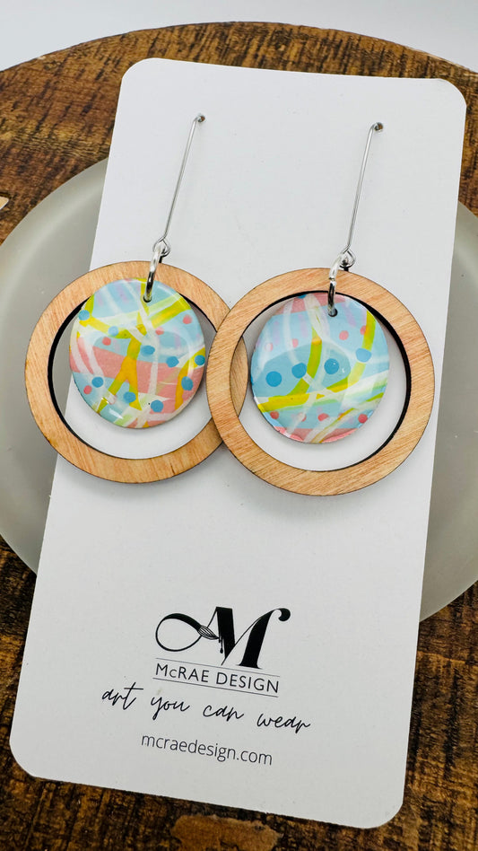 Each pair in the Fade Into You collection begins as an original painting — layered brushstrokes on paper in pale Carolina blue, metallic pastel pink, and subtle hints of yellow. Fine white lines and tiny blue dots weave through the compositions like memory traces, each one preserved under a glassy resin finish.