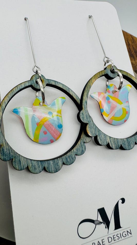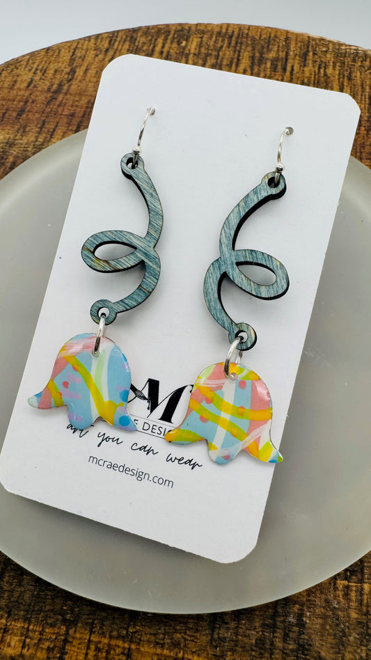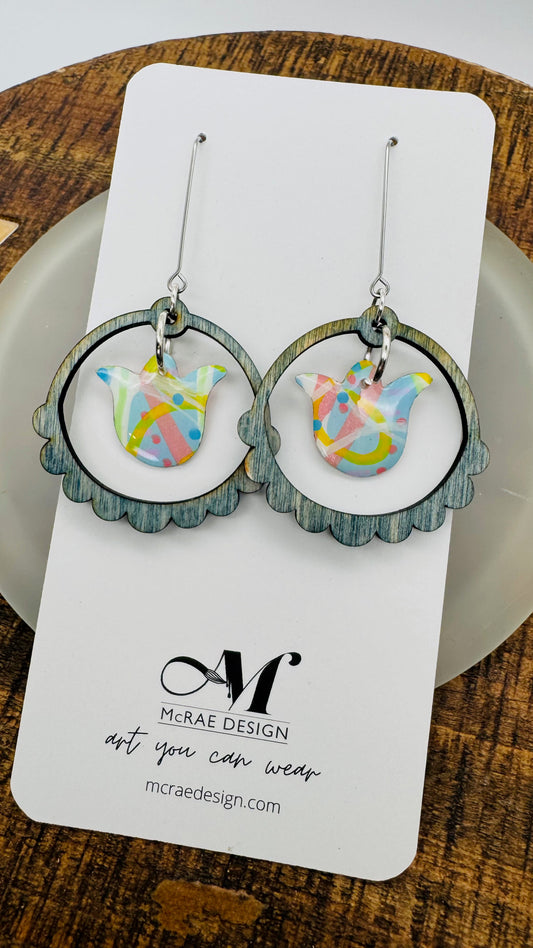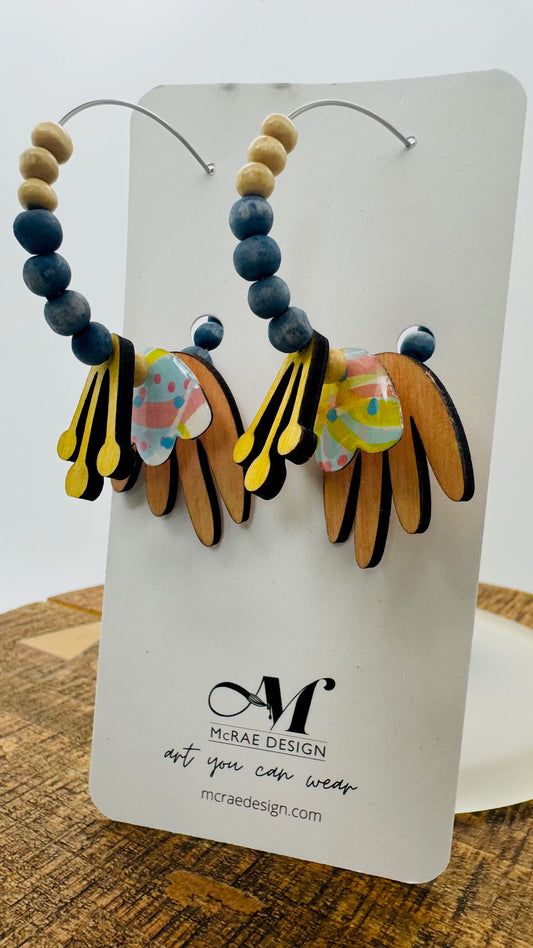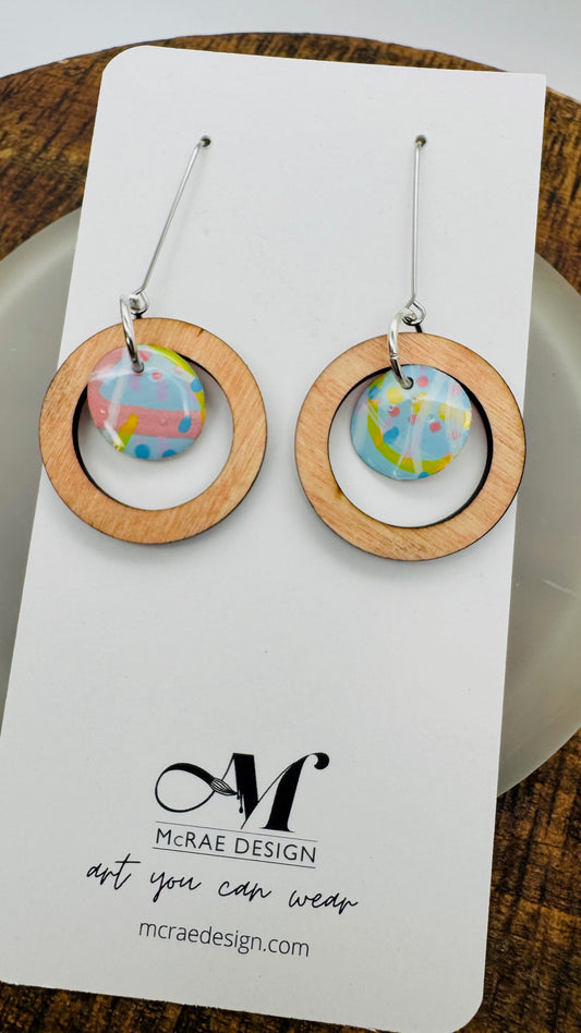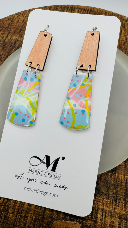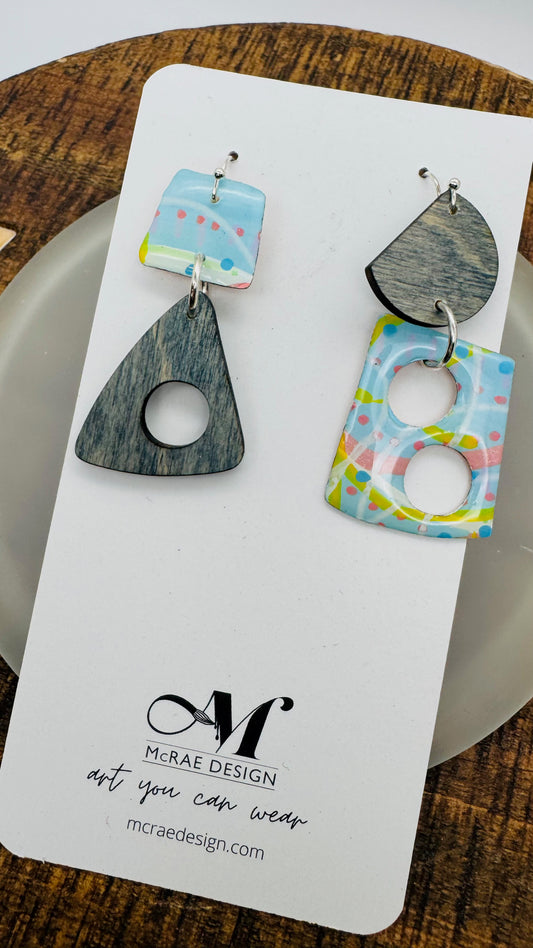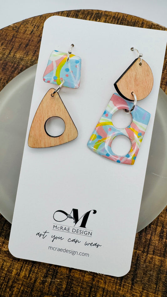 Hand-cut and shaped into lightweight earrings, every piece is a miniature canvas — adorned with natural wooden beads and soft-hued wooden accents in dusty blue and barely-there pink. The palette and textures echo the faded pages of old journals, cassette liner notes, and the quiet glow of a 90s bedroom window.