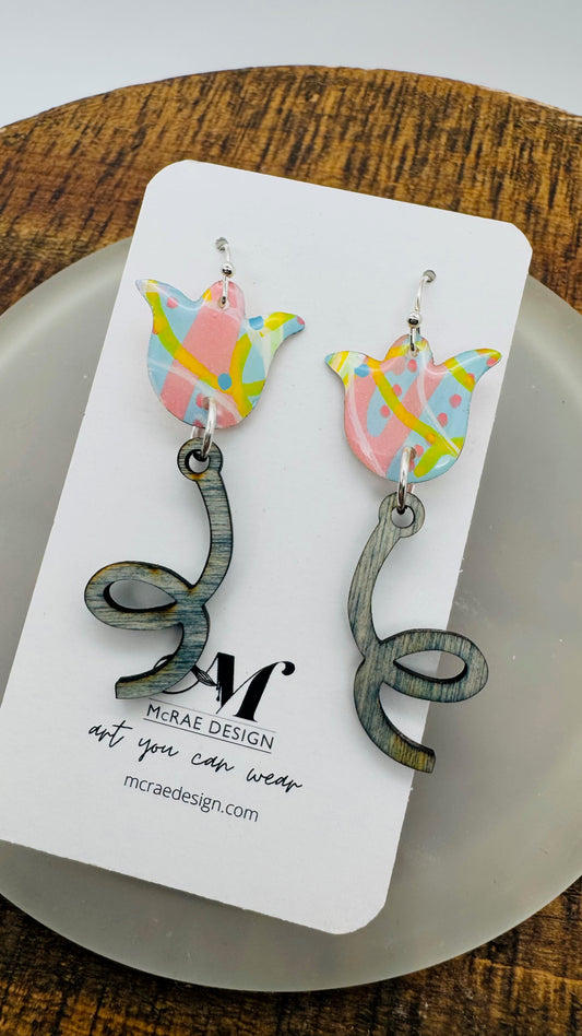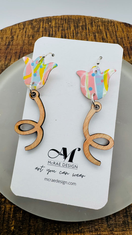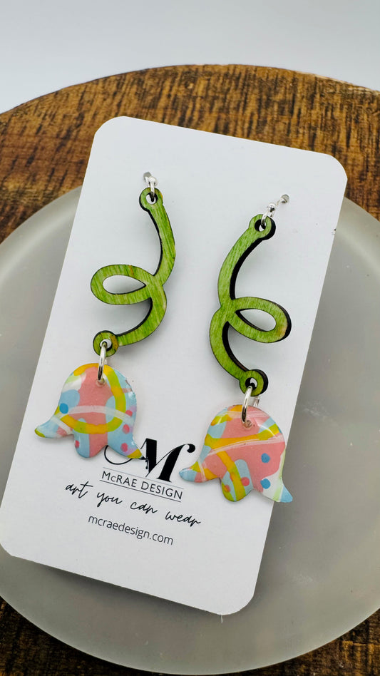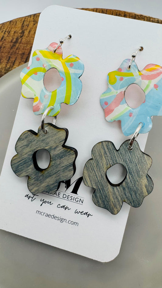 Hand-cut and shaped into lightweight earrings, every piece is a miniature canvas — adorned with natural wooden beads and soft-hued wooden accents in dusty blue and barely-there pink. The palette and textures echo the faded pages of old journals, cassette liner notes, and the quiet glow of a 90s bedroom window.