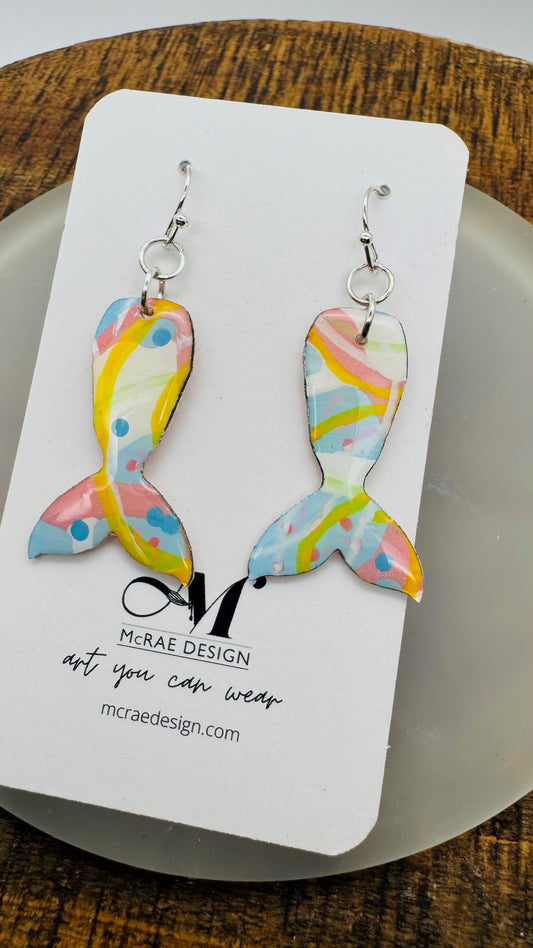 Each pair in the Fade Into You collection begins as an original painting — layered brushstrokes on paper in pale Carolina blue, metallic pastel pink, and subtle hints of yellow. Fine white lines and tiny blue dots weave through the compositions like memory traces, each one preserved under a glassy resin finish.