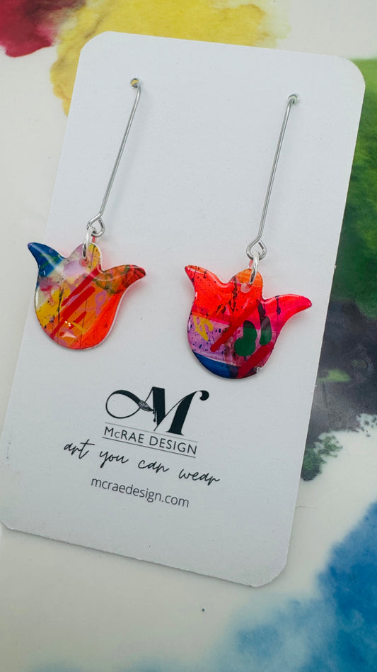 Crafted from paper and carefully sealed in glossy resin for durability and shine, these lightweight earrings are as comfortable as they are eye-catching. No two pairs are exactly alike—each one is a unique, one-of-a-kind statement in color and form.