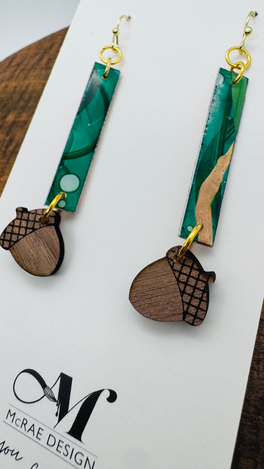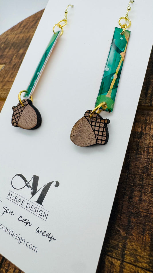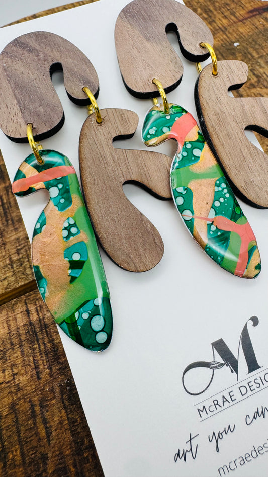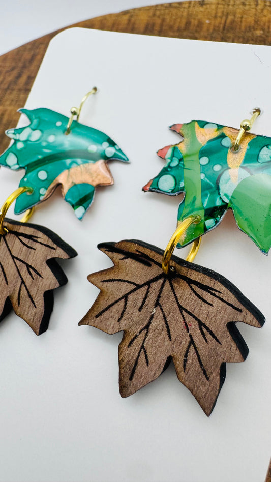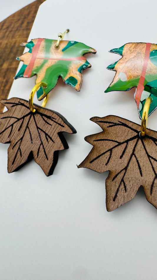 The Woodland Whimsy collection captures the magic of the forest in every detail. Each piece begins as an original painting on paper, alive with vibrant colors and organic textures. These artworks are then hand-cut into delicate leaf shapes and paired with the natural elegance of laser-cut black walnut. The fusion of painted patterns with the rich grain of wood creates jewelry that feels both modern and timeless—an homage to autumn’s beauty and nature’s artistry.