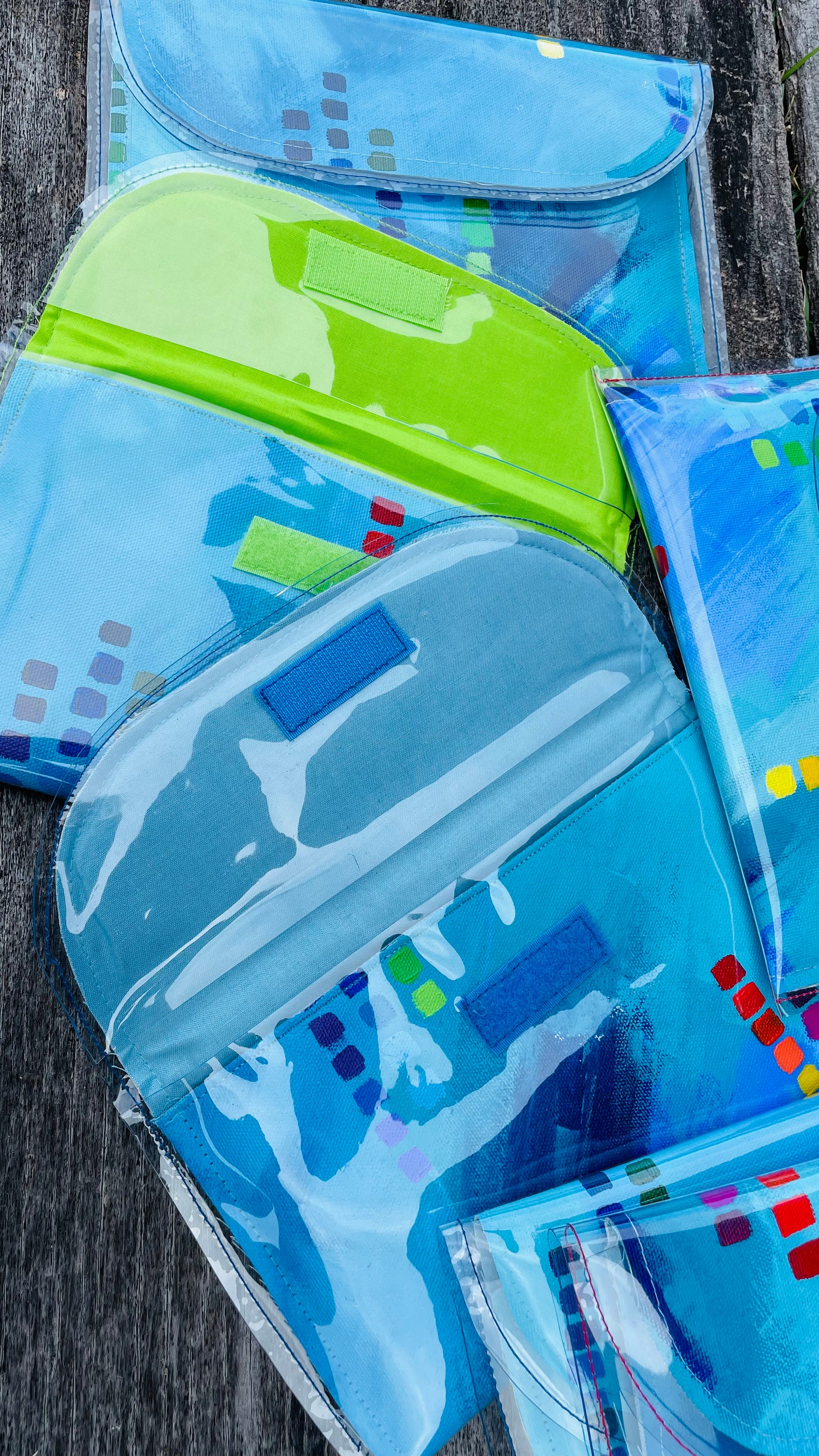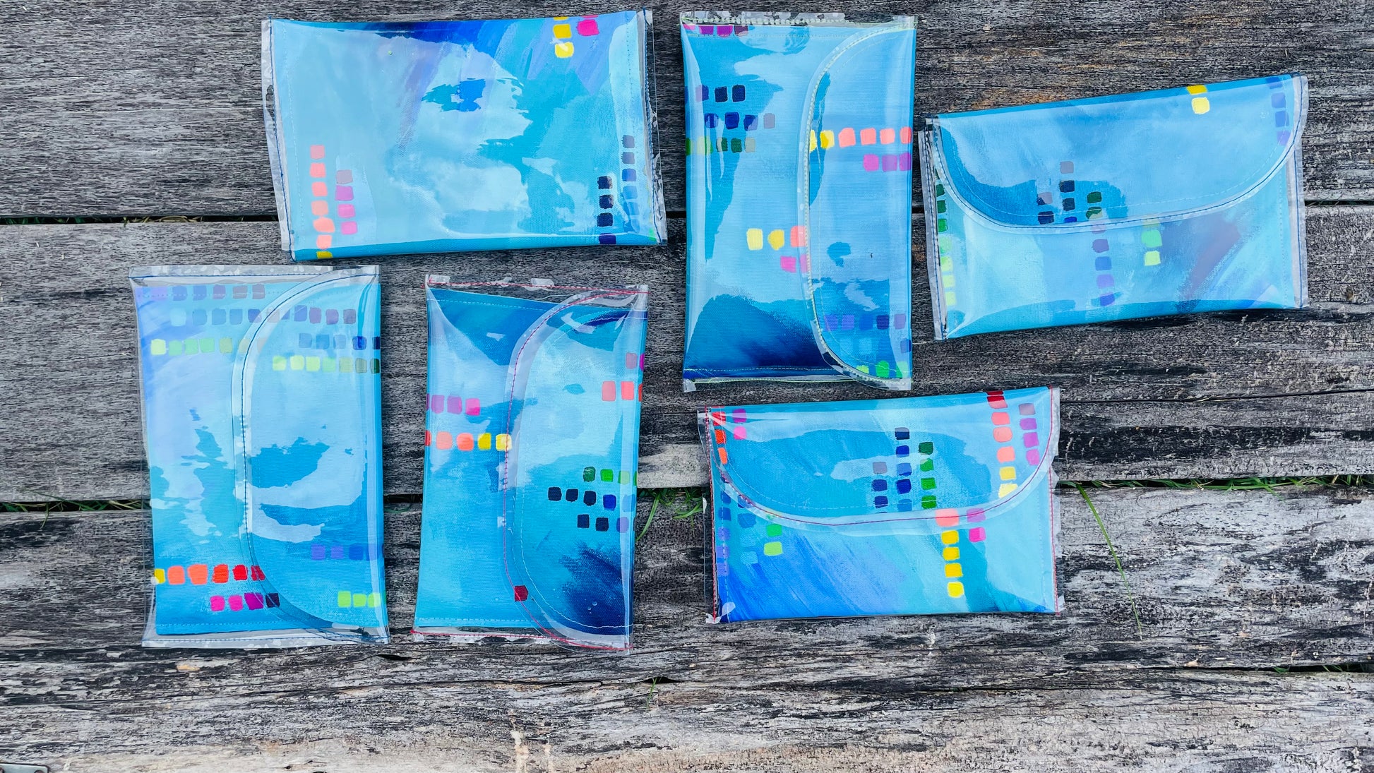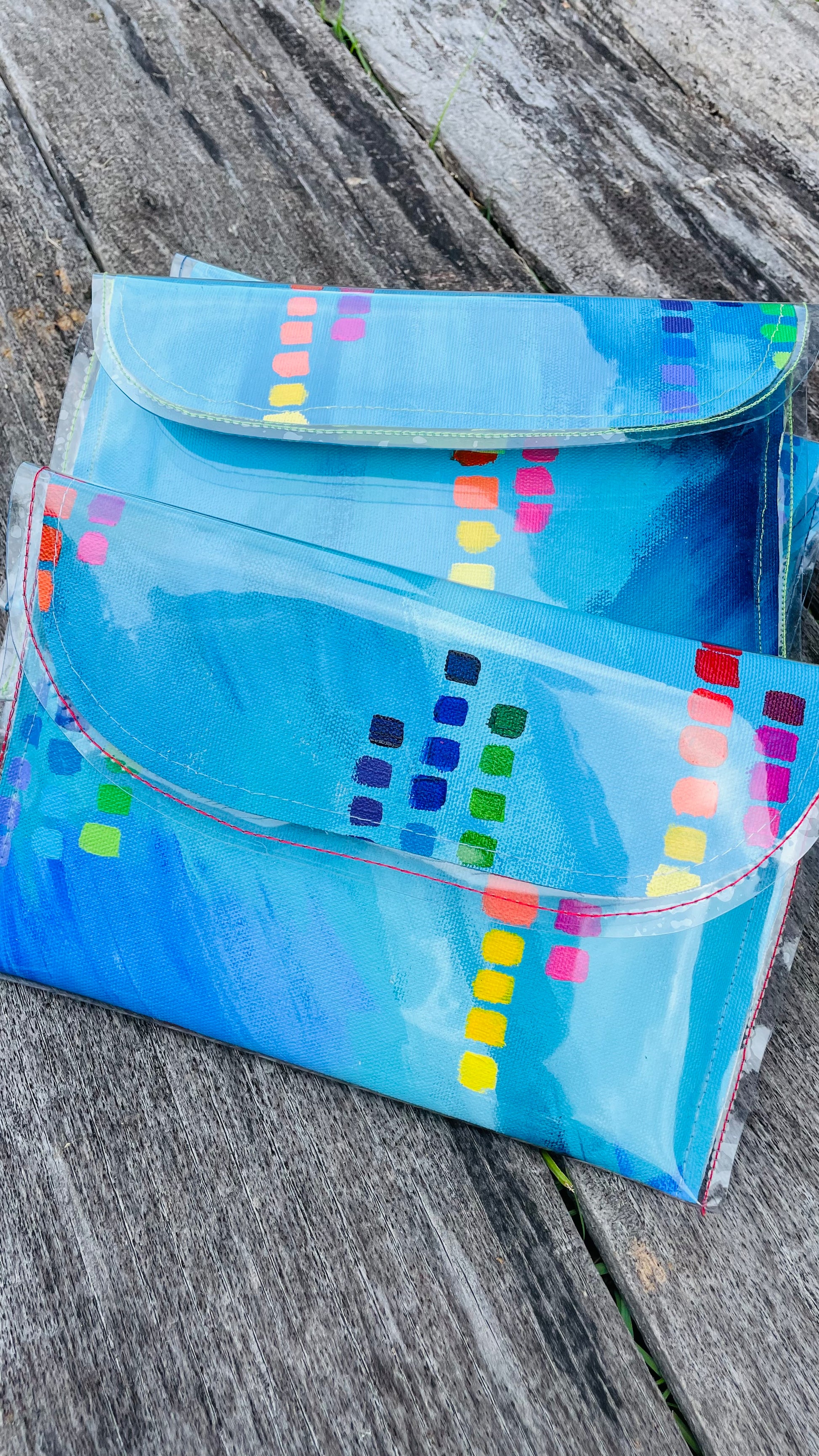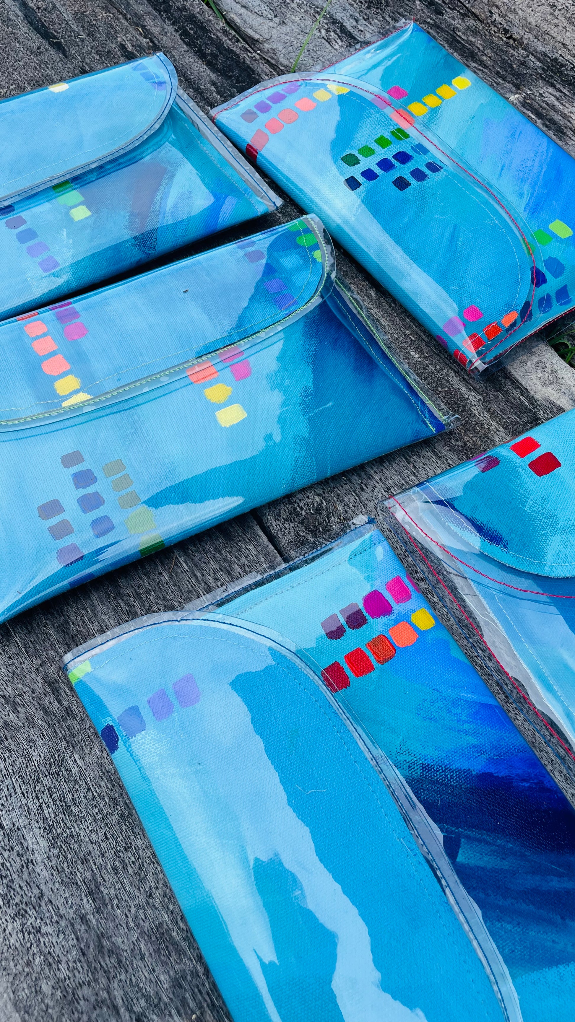 The original painting features every color of blue, with rainbow style blocking as accents. The purses are lined with sky blue or lime green. Perfect for any time of the year. Only 10 purses were created from this painting. Each purse is one-of-a-kind and perfect for a night out or to toss into a larger bag. Just big enough to to hold your phone, wallet and keys and maybe some lip gloss.