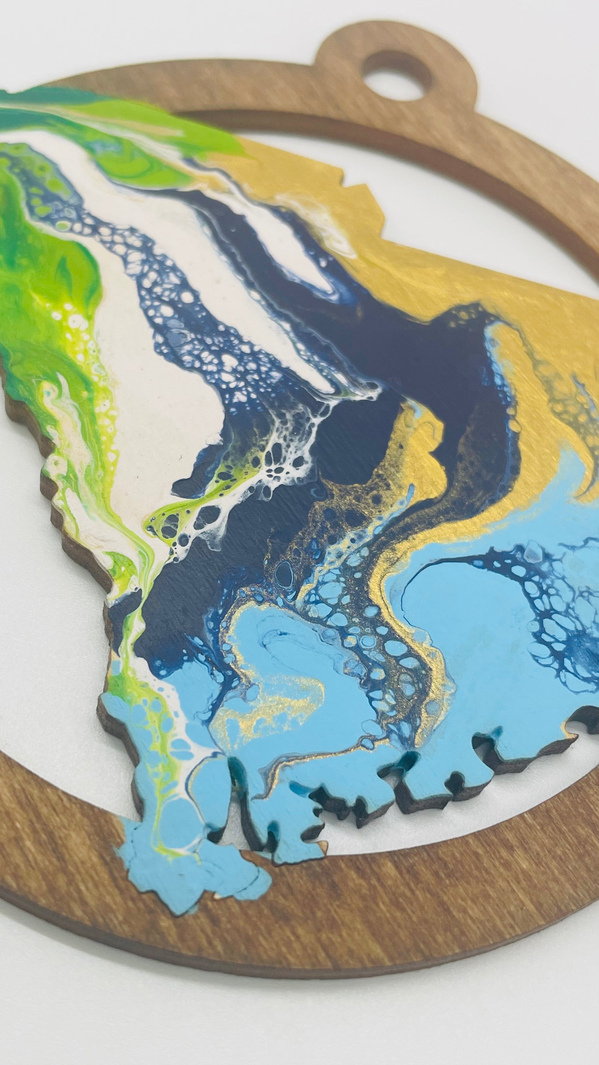 Looking for the perfect gift for a South Carolina fan? Or want the perfect accent of art for your tree - this ornament is it! Every ornament is one-of-a-kind. Each is hand-painted with liquid acrylic using high quality vibrant blues and greens with white lacing and metallic gold.