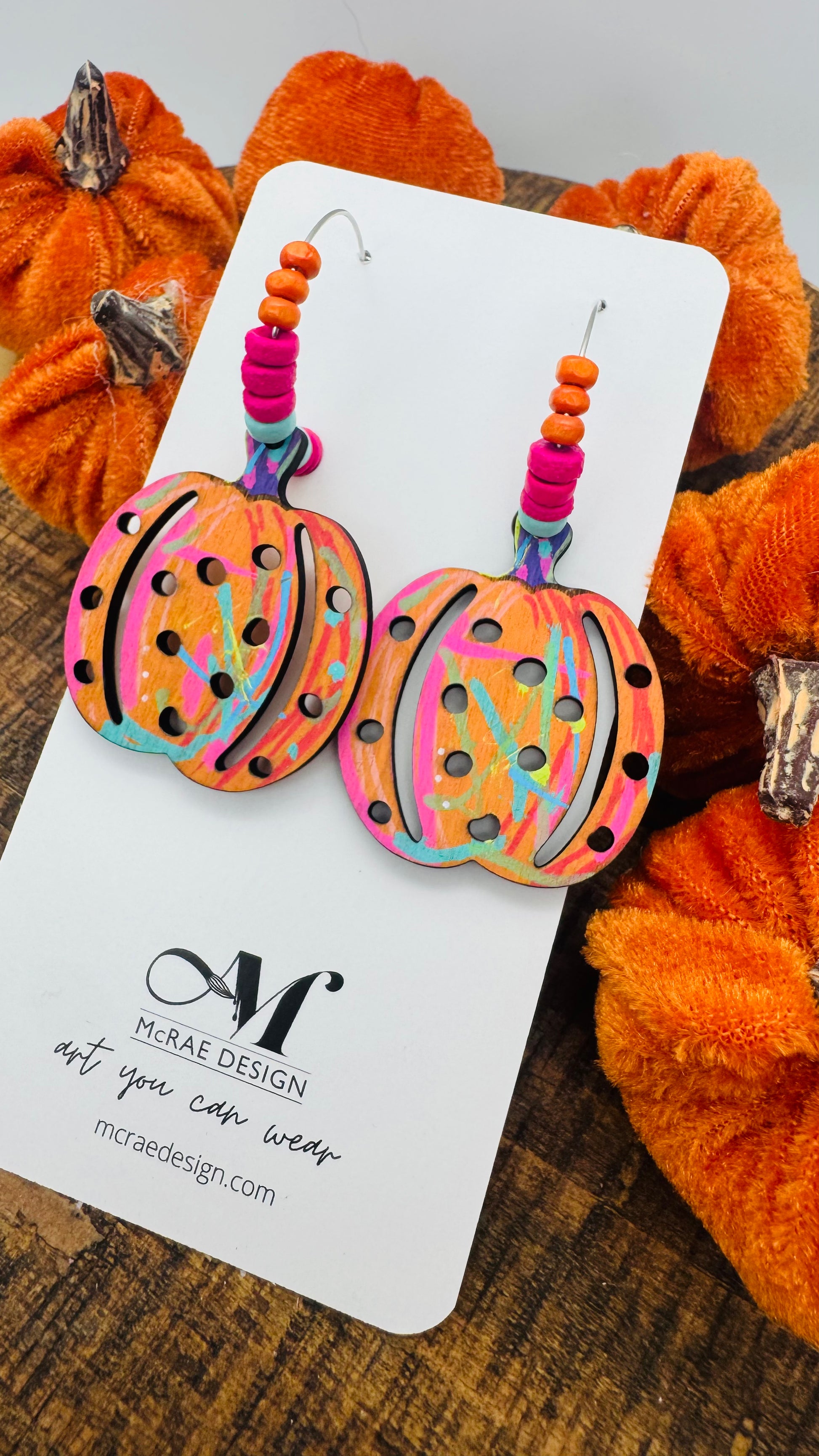 On stainless steel hoops - total length is 3 inches, punkin’ is approximately 1.5 inches. Hand painted on both sides. Accented with wooden and coconut beads