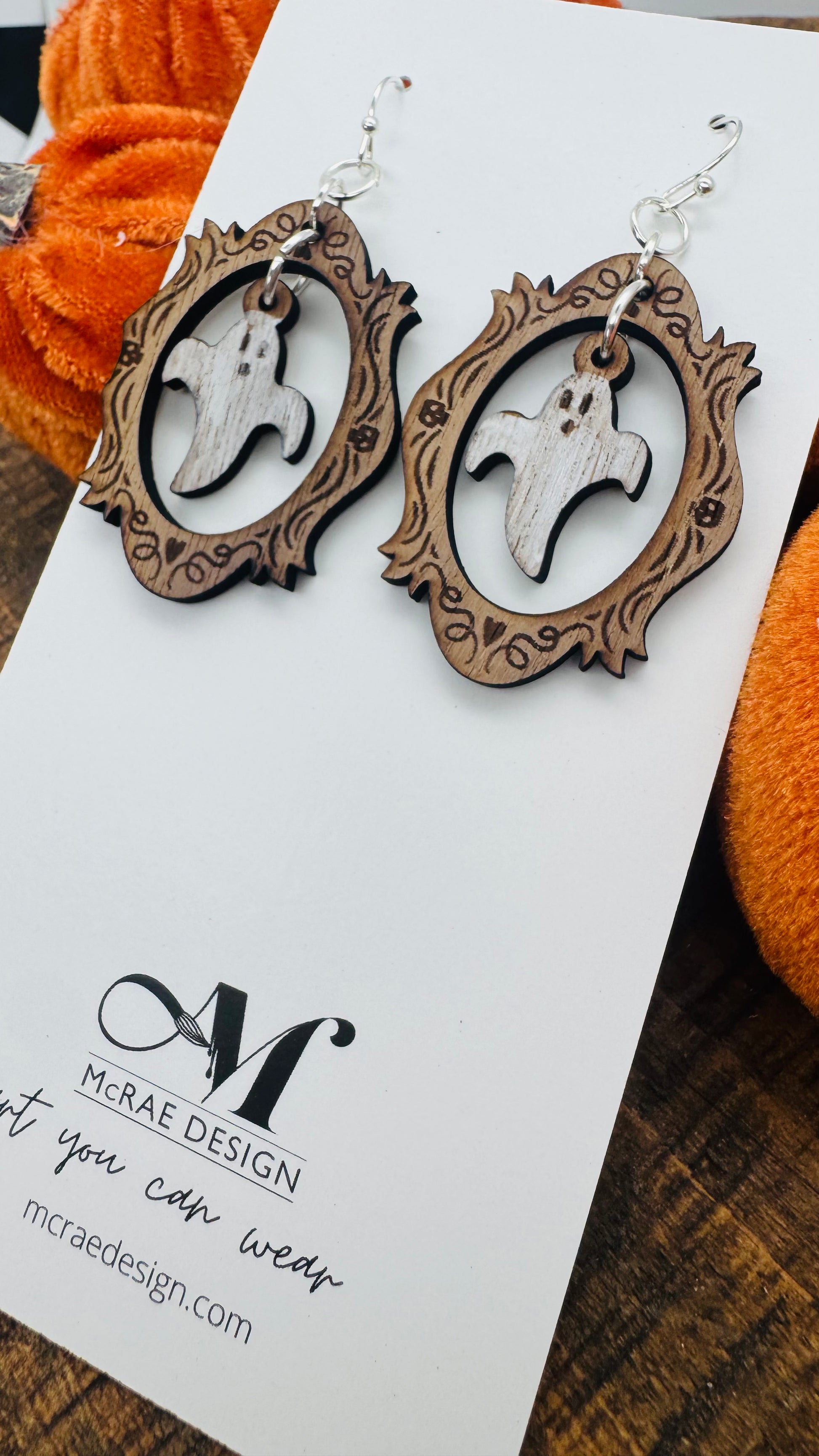 Crafted from rich black walnut and painted on birchwood, these lightweight designs blend playful charm with intricate detail. From sugar skulls to whimsical little framed ghosts and colorful polka-dotted pumpkins, no two pairs are ever exactly alike.