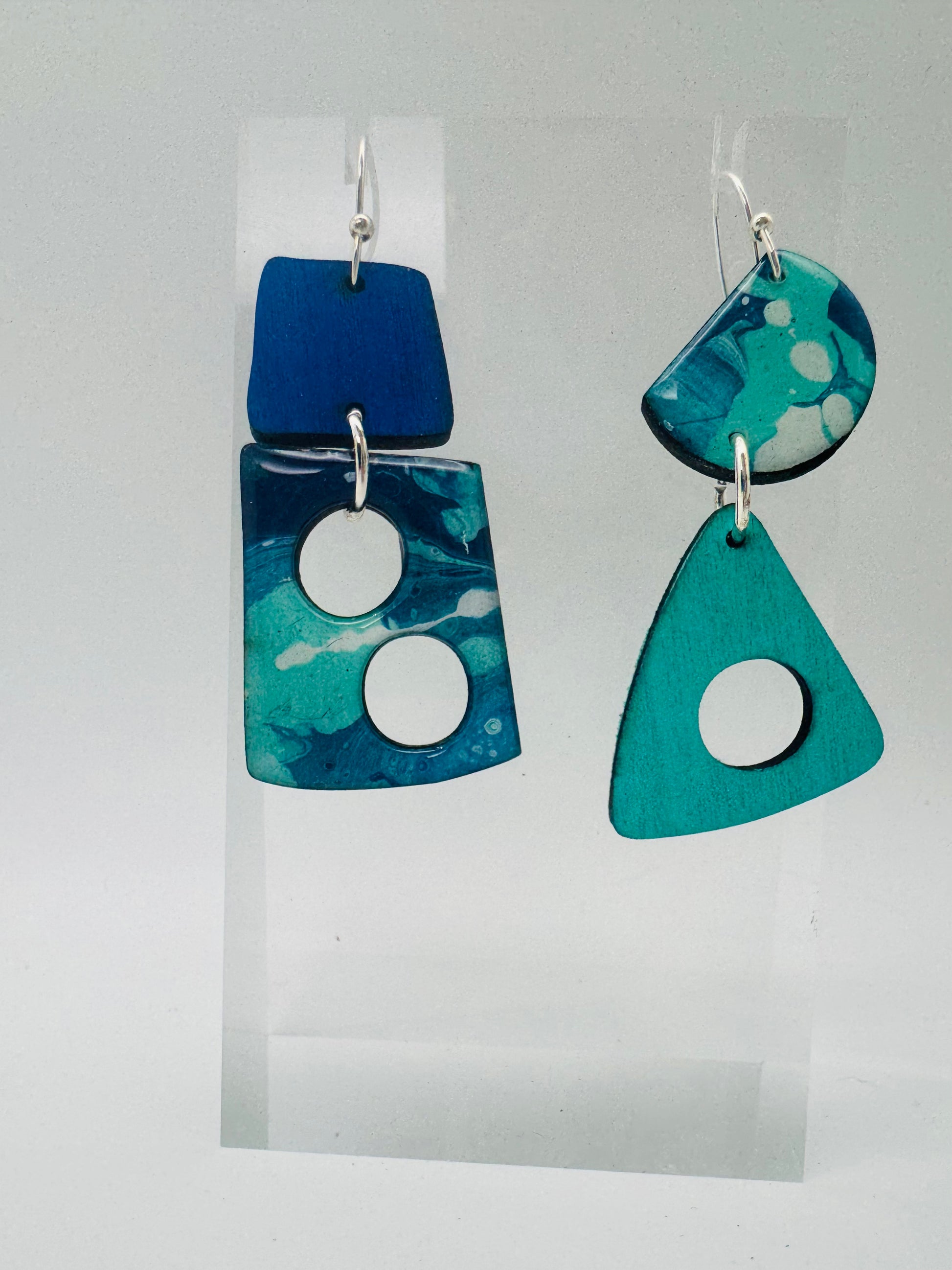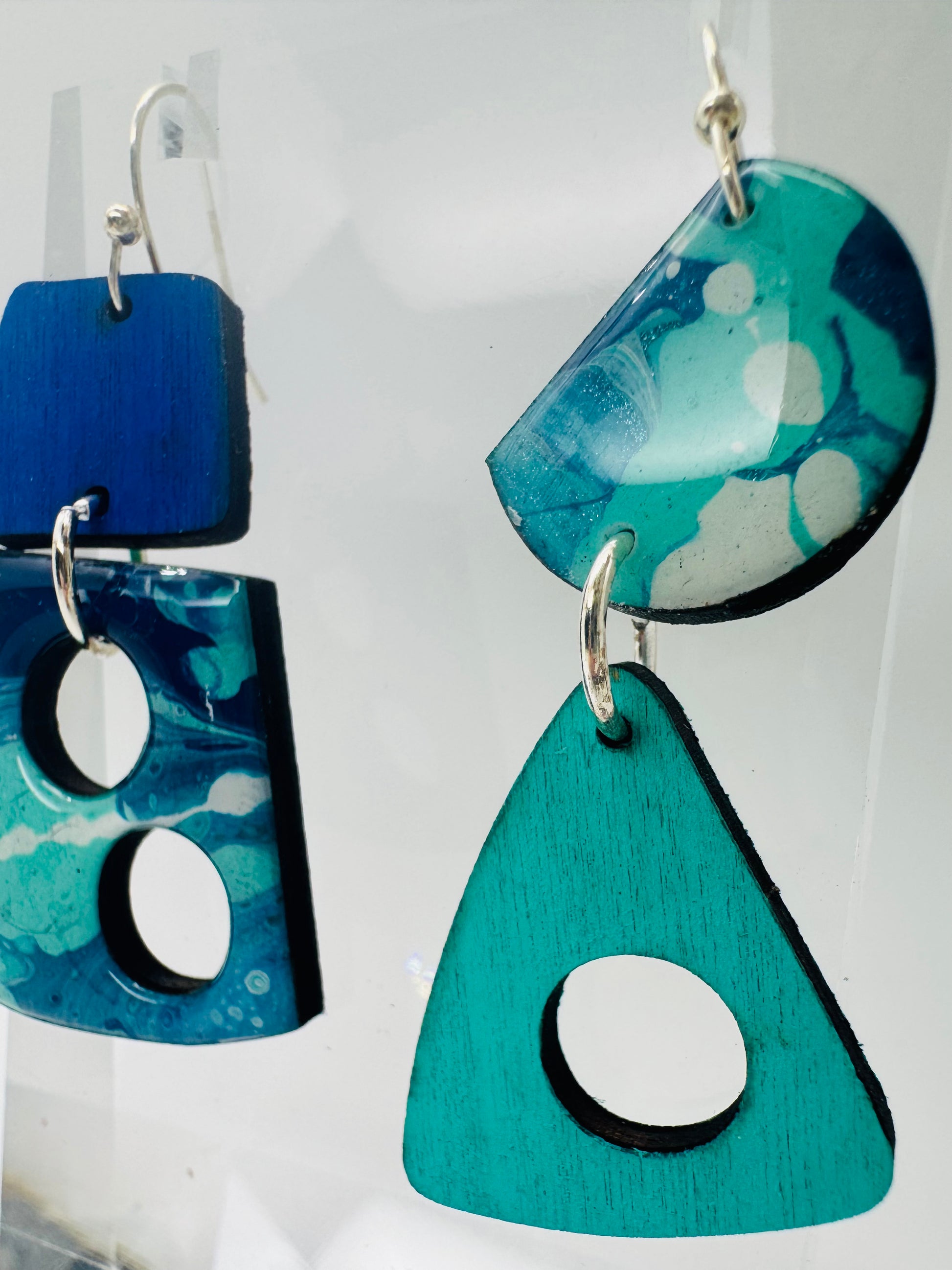 Hand-painted and full of fluid motion, the Drift Collection captures the rhythm of water and the calm of the coast. Each earring is painted on birch wood, then cut and finished to highlight the natural flow of color — no two pairs ever the same. Deep teals and ocean blues blend and swirl like waves finding their way to shore.