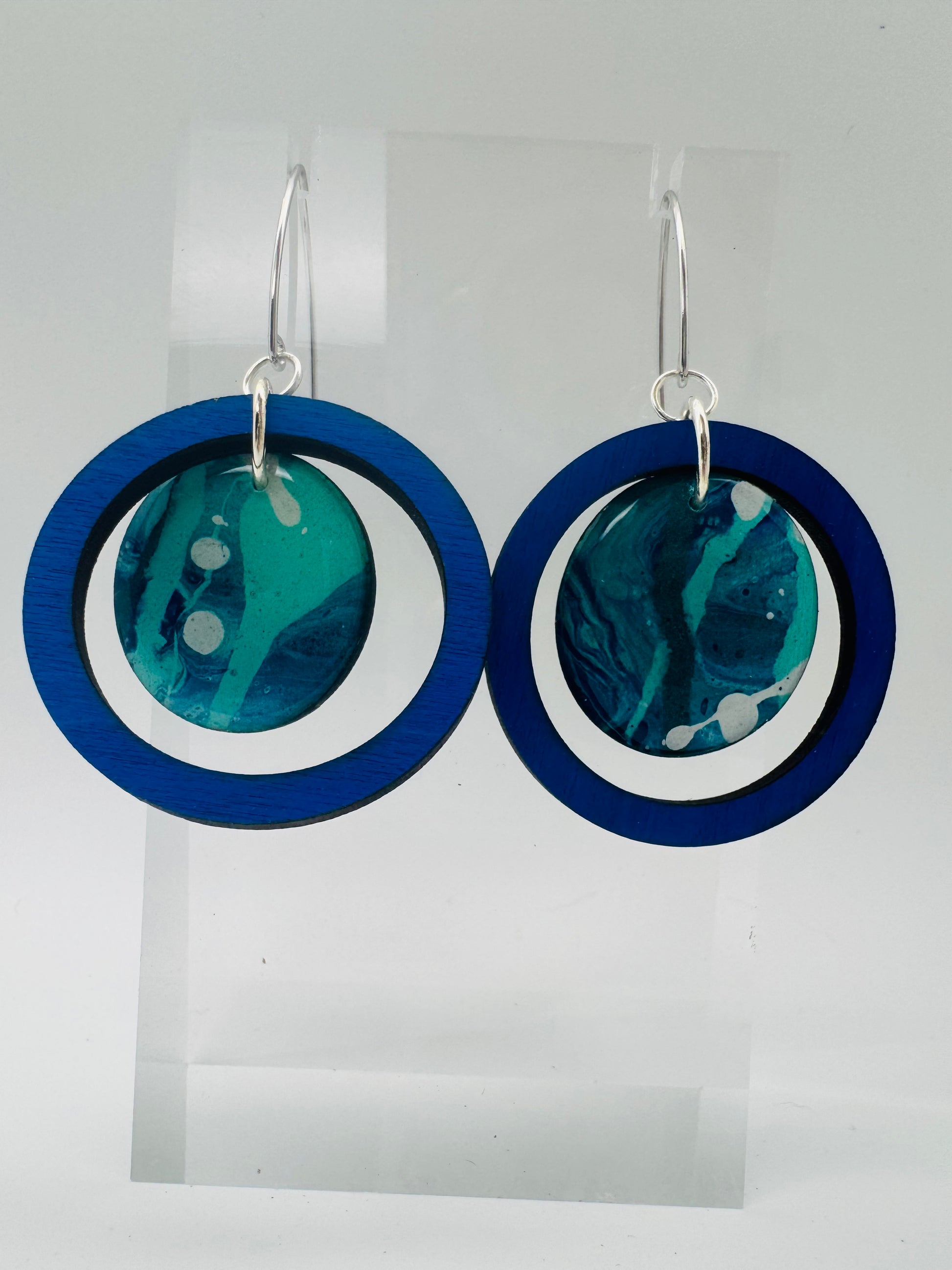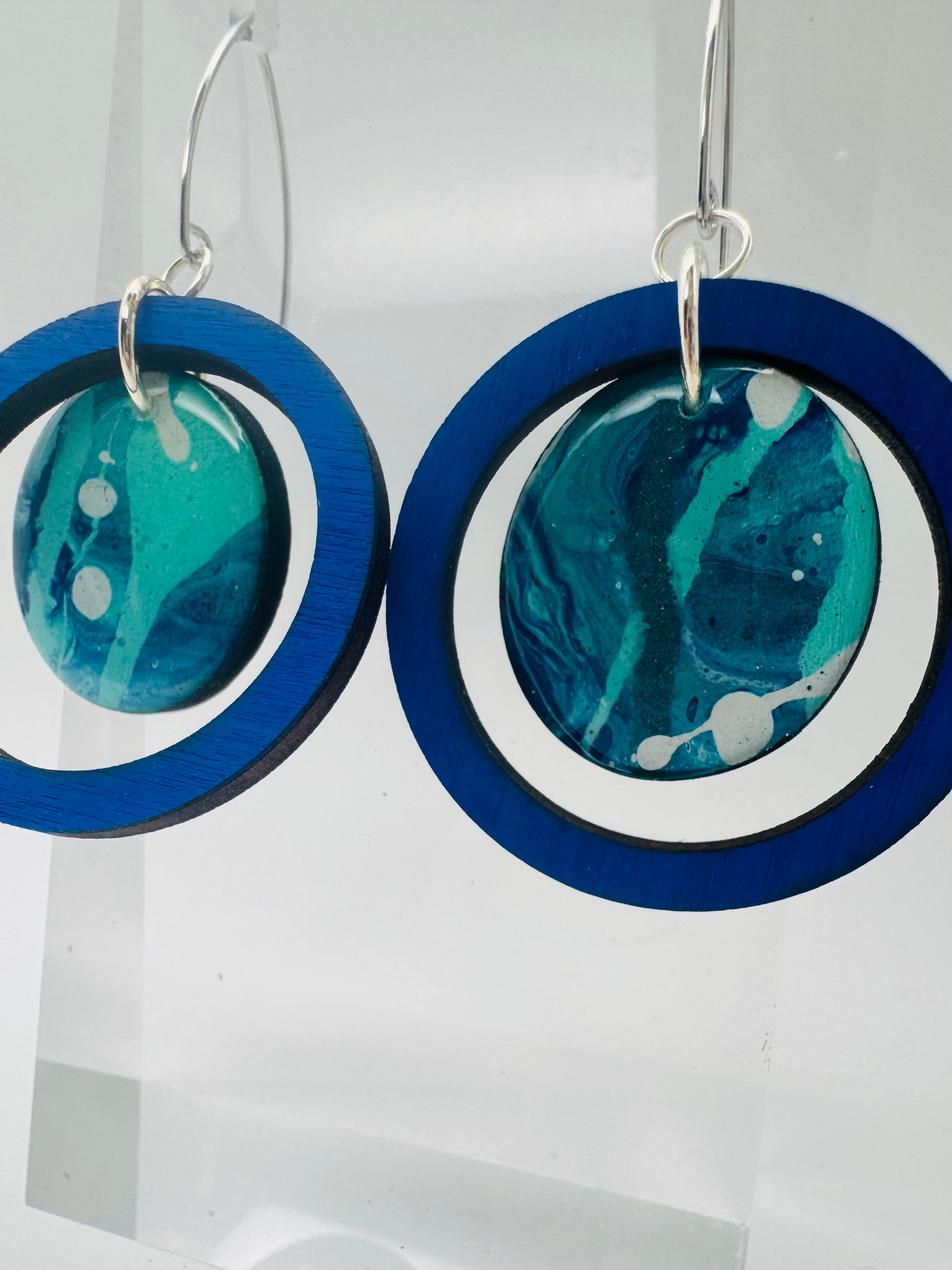 Hand-painted and full of fluid motion, the Drift Collection captures the rhythm of water and the calm of the coast. Each earring is painted on birch wood, then cut and finished to highlight the natural flow of color — no two pairs ever the same. Deep teals and ocean blues blend and swirl like waves finding their way to shore.