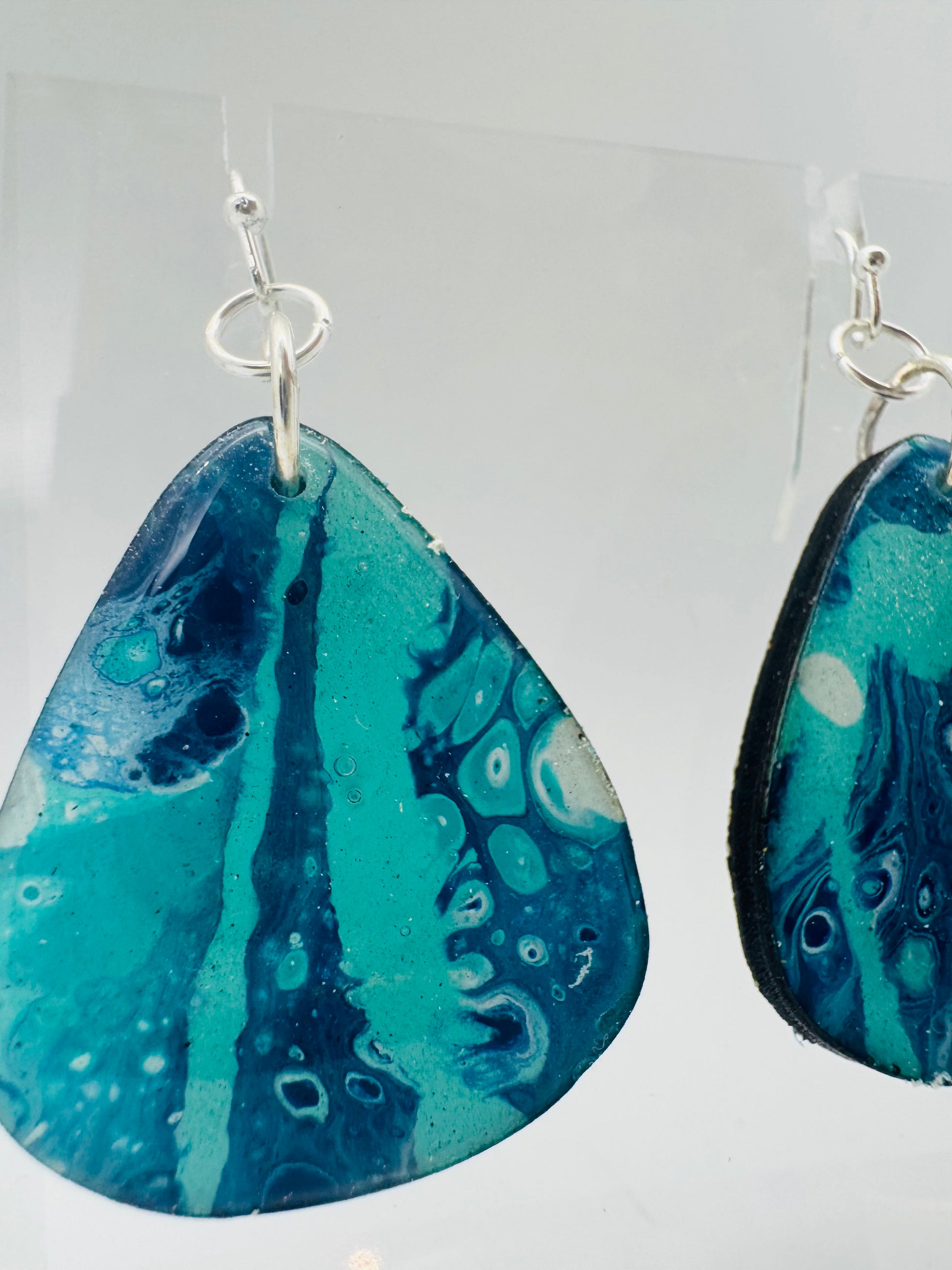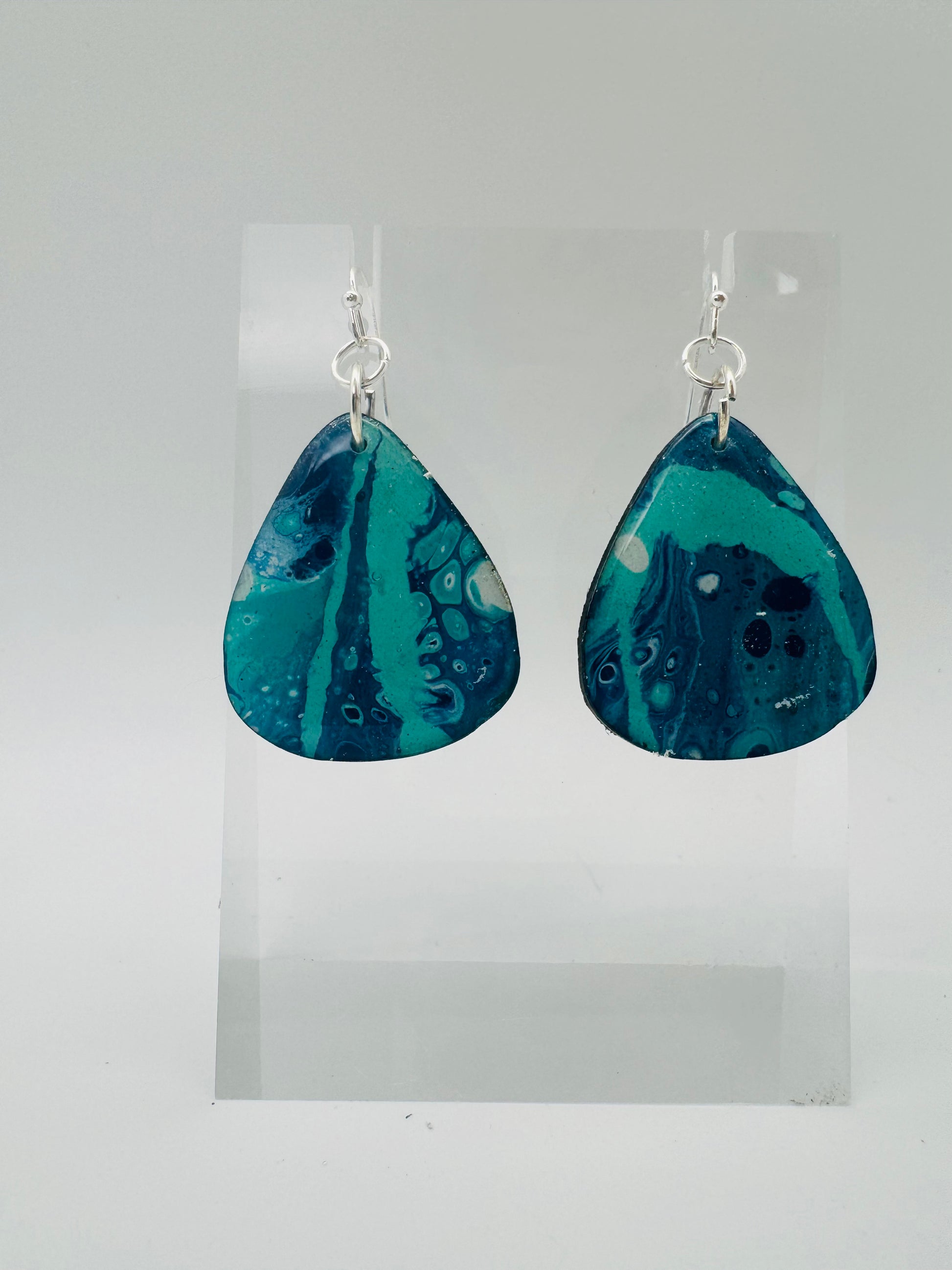 Hand-painted and full of fluid motion, the Drift Collection captures the rhythm of water and the calm of the coast. Each earring is painted on birch wood, then cut and finished to highlight the natural flow of color — no two pairs ever the same. Deep teals and ocean blues blend and swirl like waves finding their way to shore.