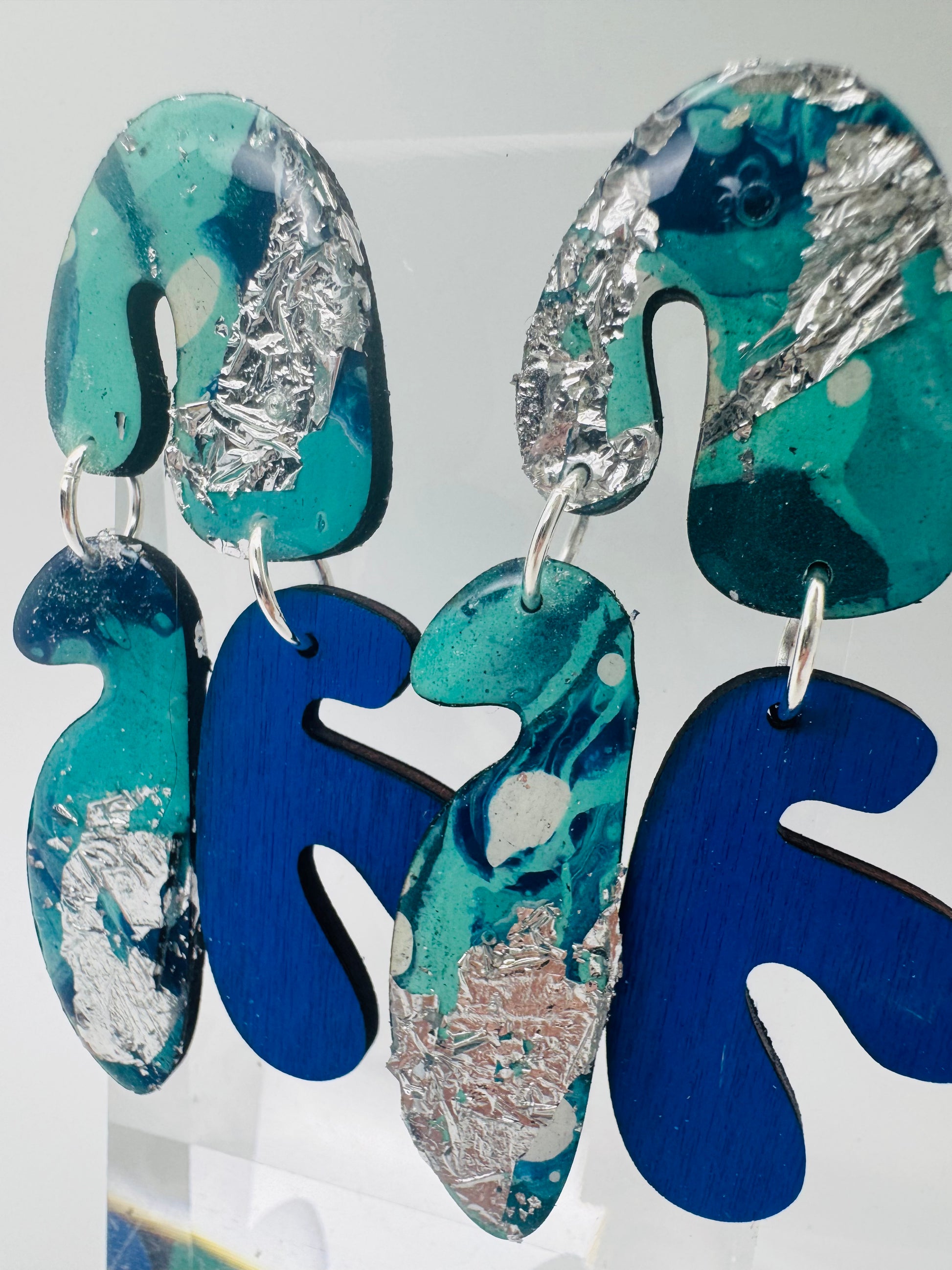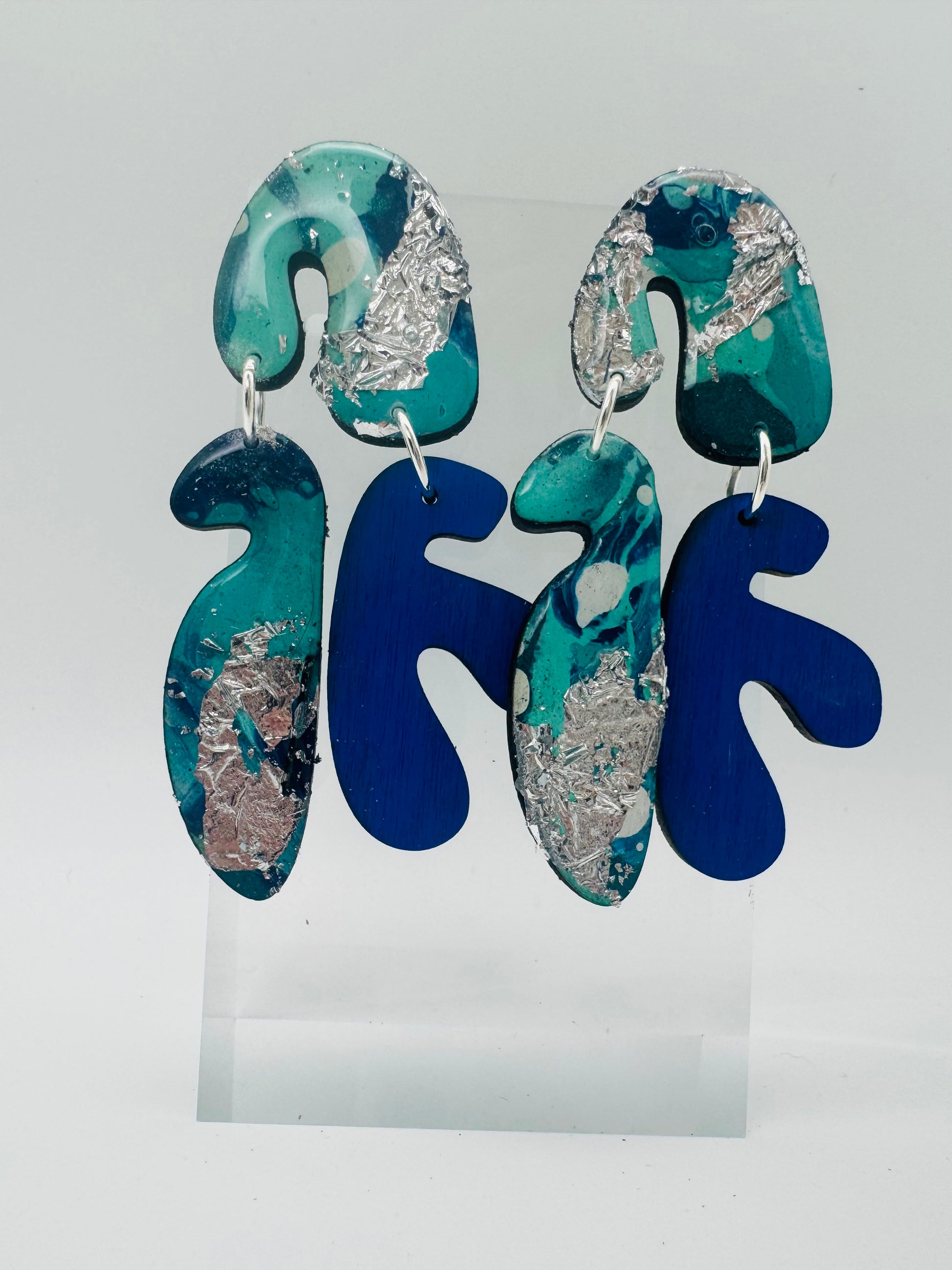 Hand-painted and full of fluid motion, the Drift Collection captures the rhythm of water and the calm of the coast. Each earring is painted on birch wood, then cut and finished to highlight the natural flow of color — no two pairs ever the same. Deep teals and ocean blues blend and swirl like waves finding their way to shore.