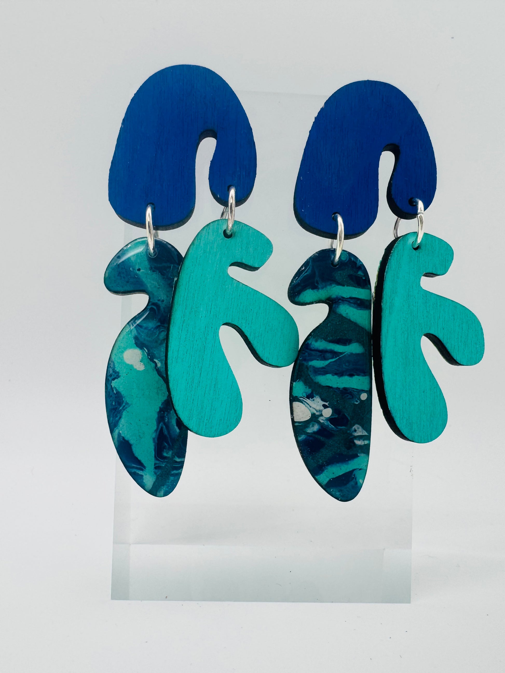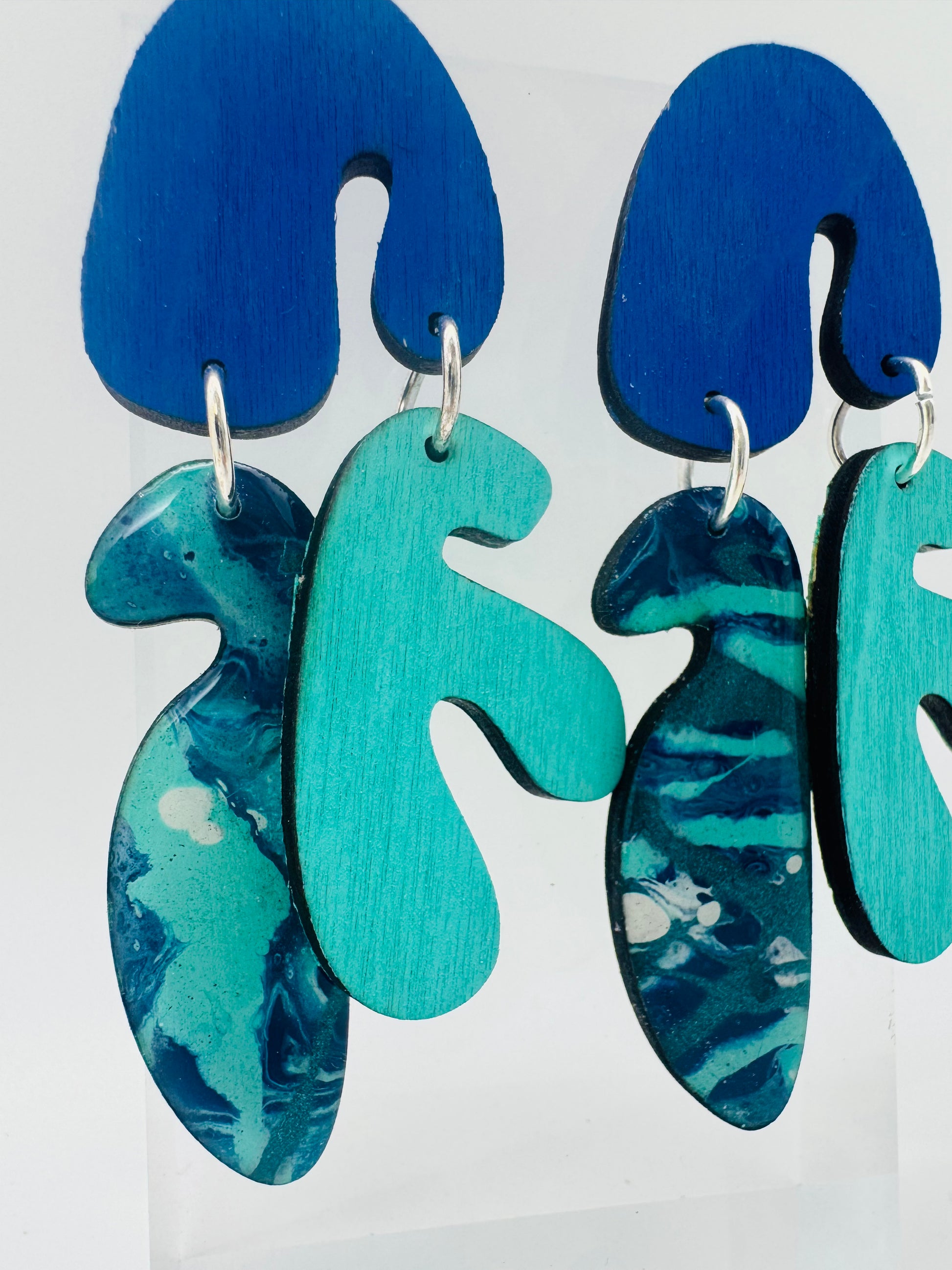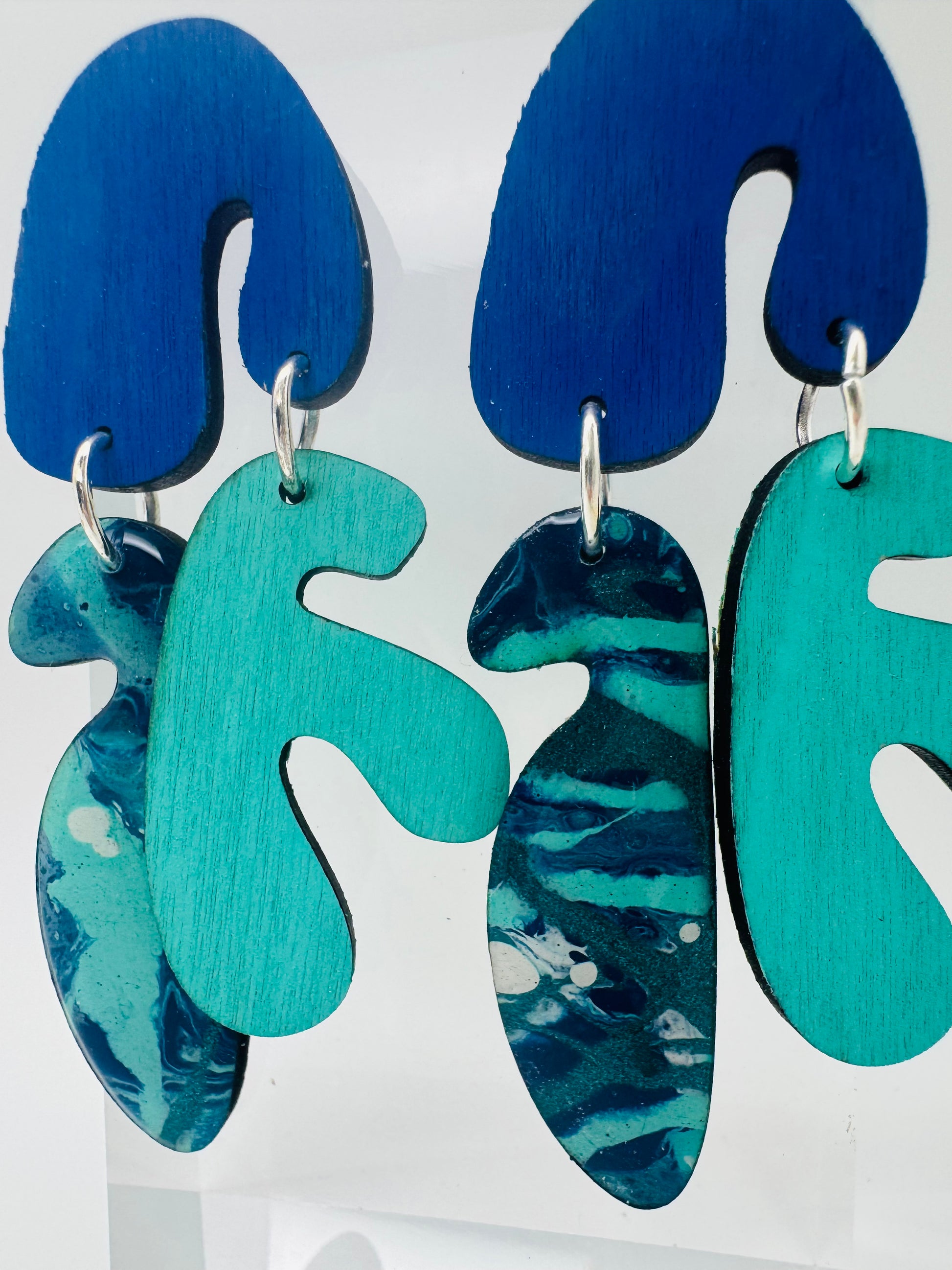 Hand-painted and full of fluid motion, the Drift Collection captures the rhythm of water and the calm of the coast. Each earring is painted on birch wood, then cut and finished to highlight the natural flow of color — no two pairs ever the same. Deep teals and ocean blues blend and swirl like waves finding their way to shore.