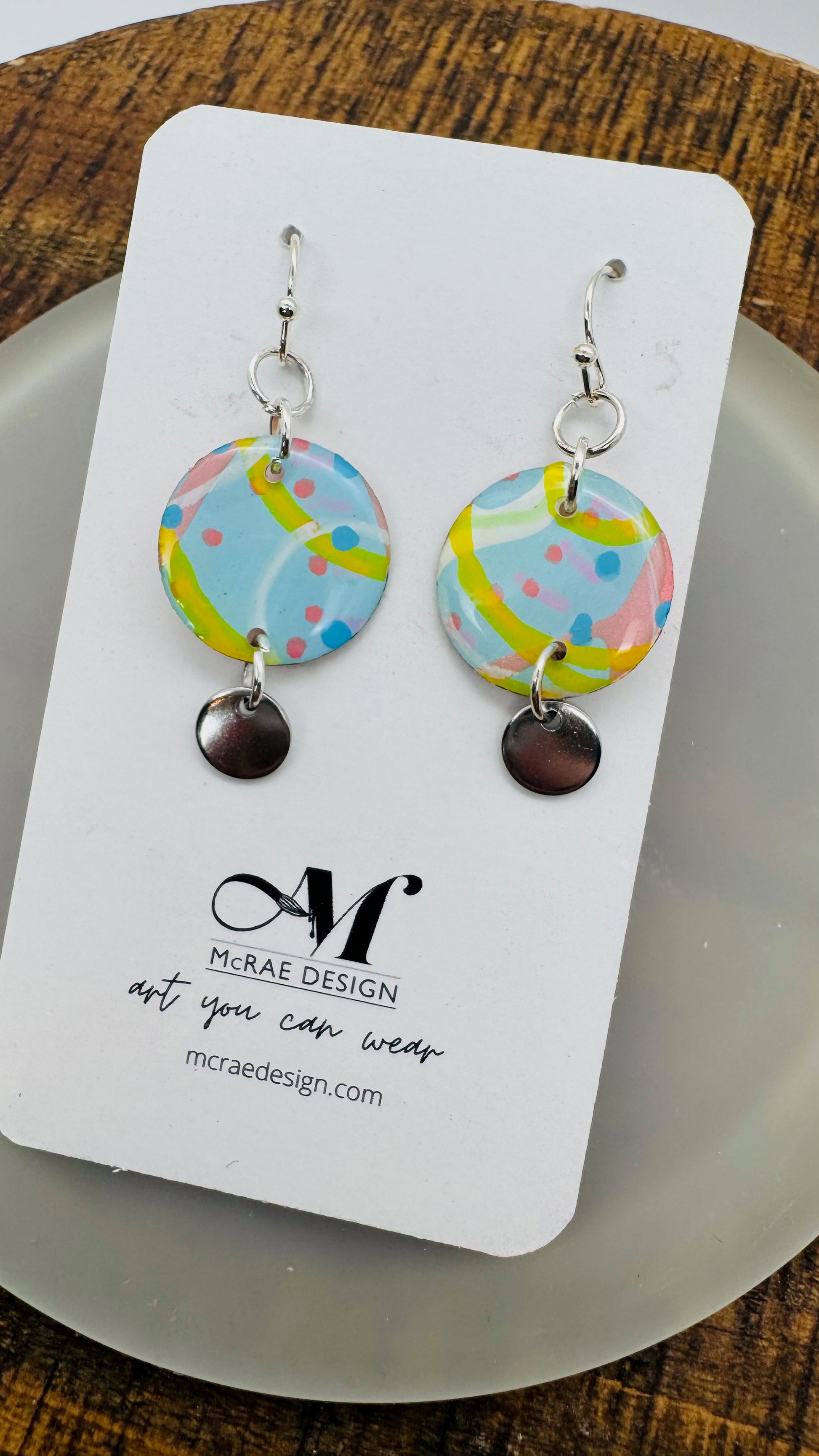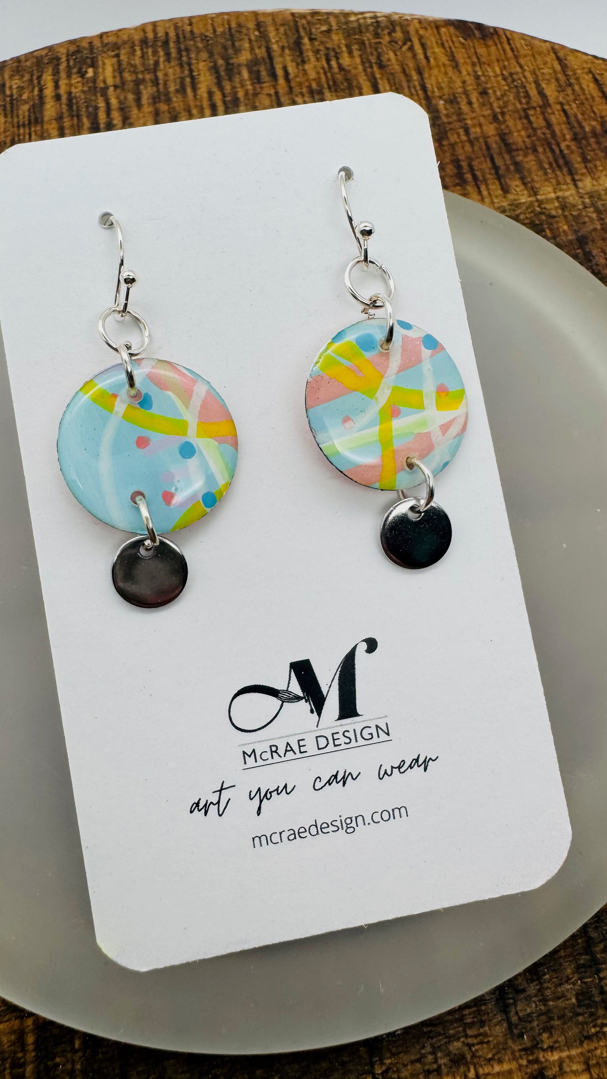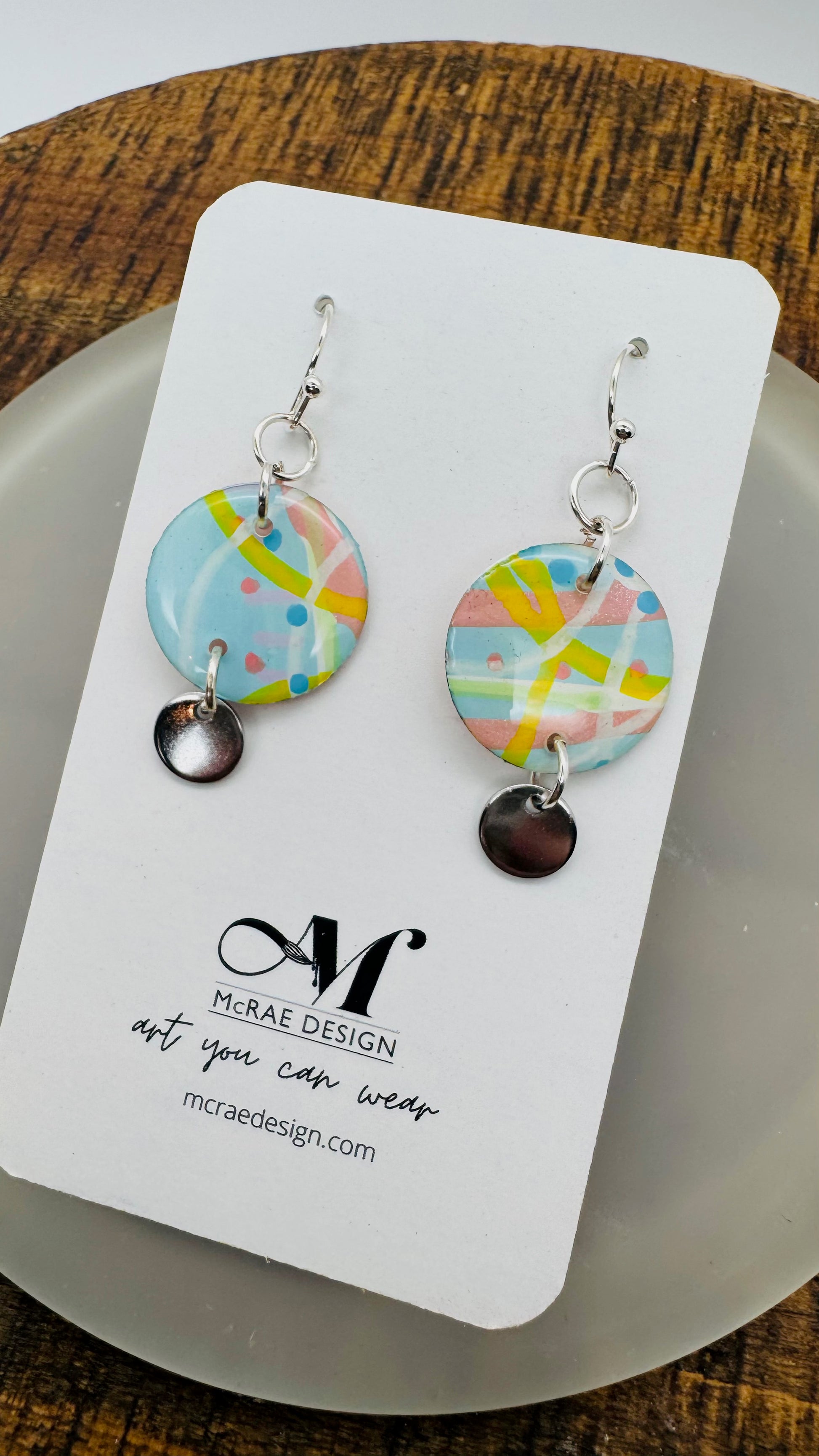 Each pair in the Fade Into You collection begins as an original painting — layered brushstrokes on paper in pale Carolina blue, metallic pastel pink, and subtle hints of yellow. Fine white lines and tiny blue dots weave through the compositions like memory traces, each one preserved under a glassy resin finish.