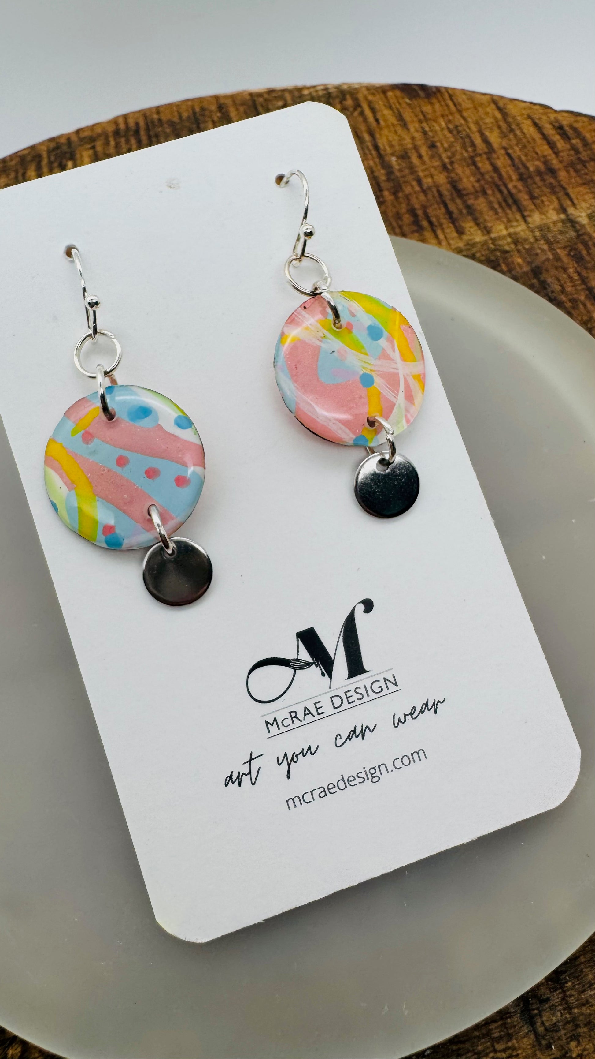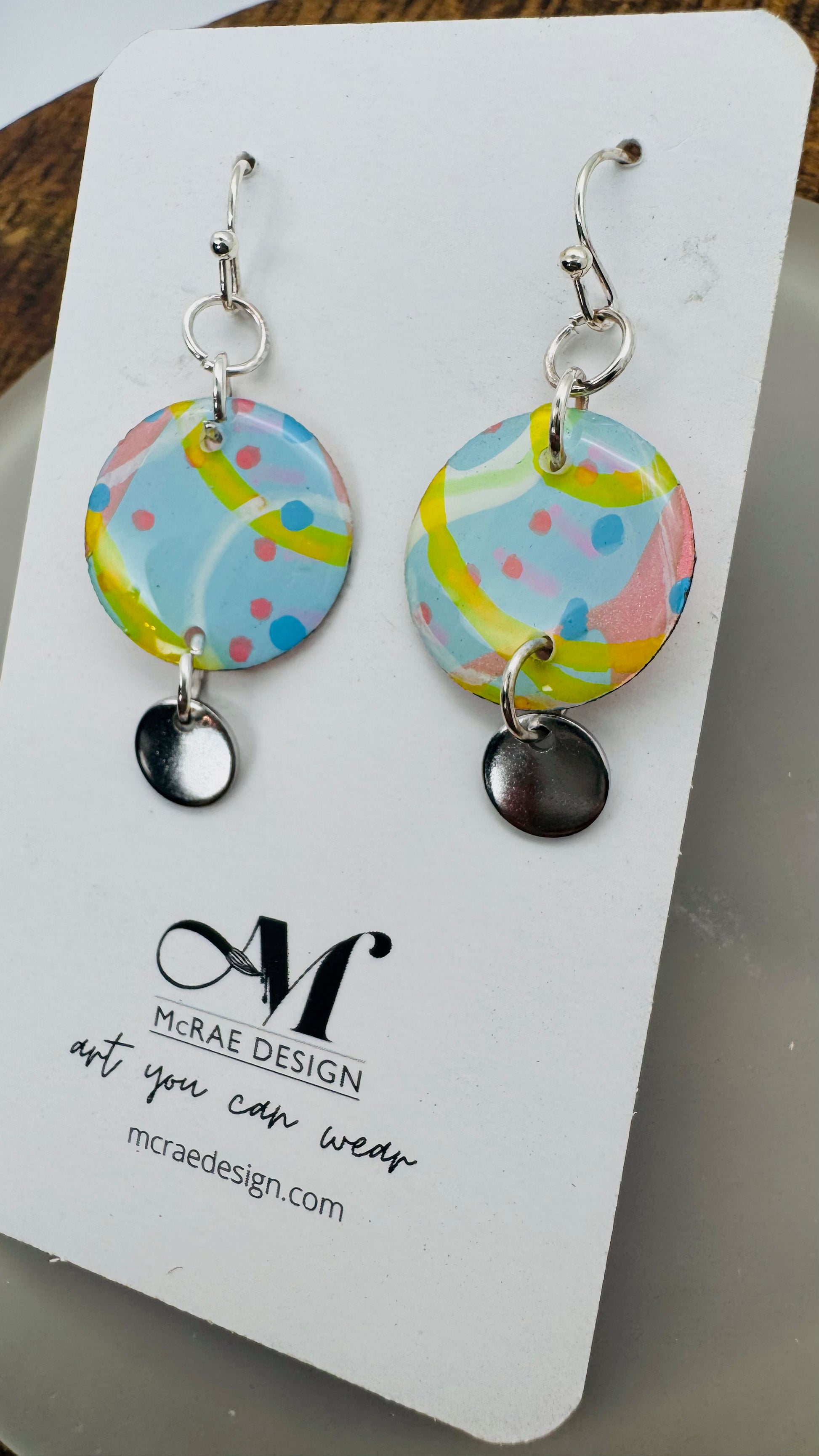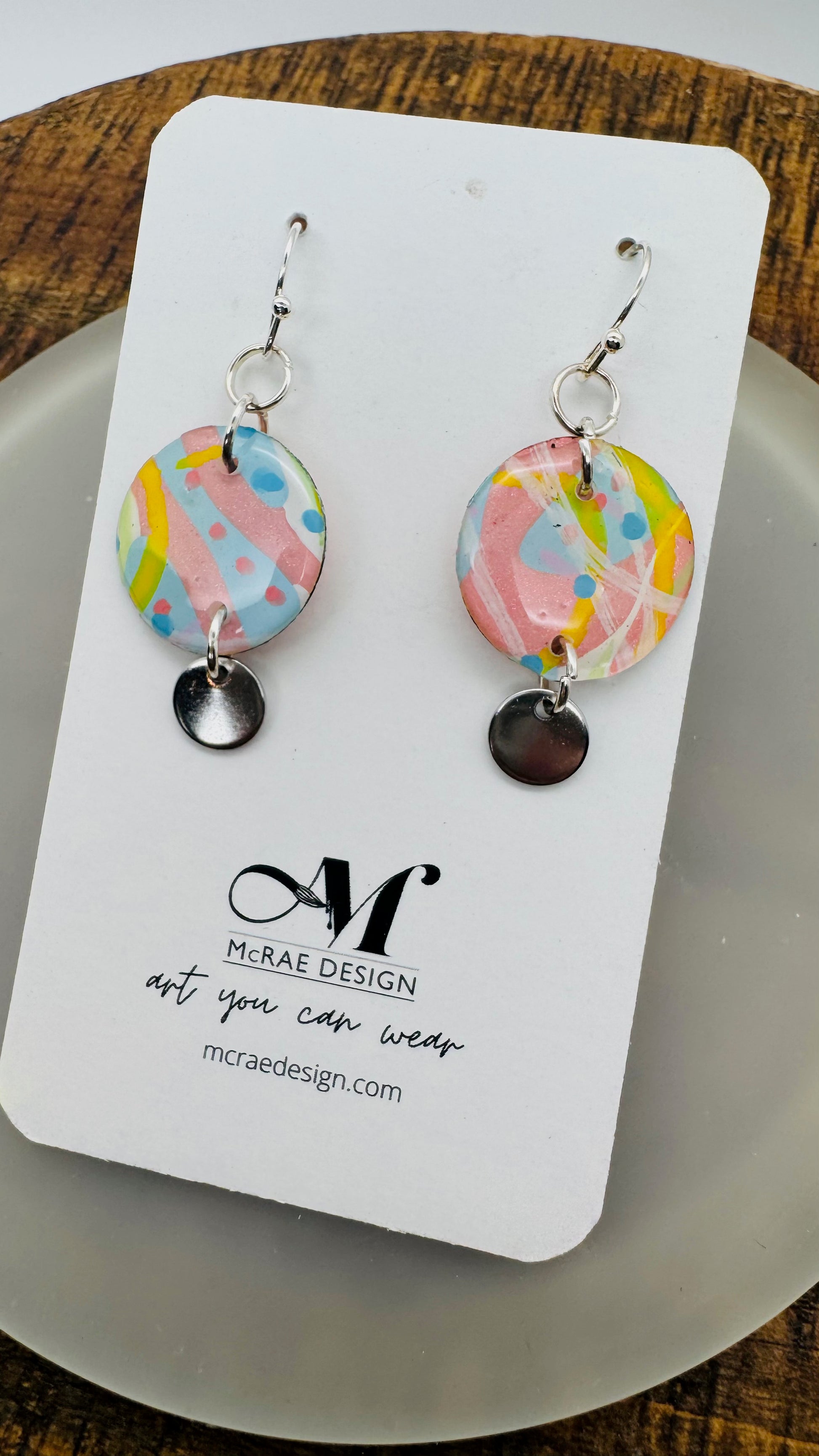 Each pair in the Fade Into You collection begins as an original painting — layered brushstrokes on paper in pale Carolina blue, metallic pastel pink, and subtle hints of yellow. Fine white lines and tiny blue dots weave through the compositions like memory traces, each one preserved under a glassy resin finish.