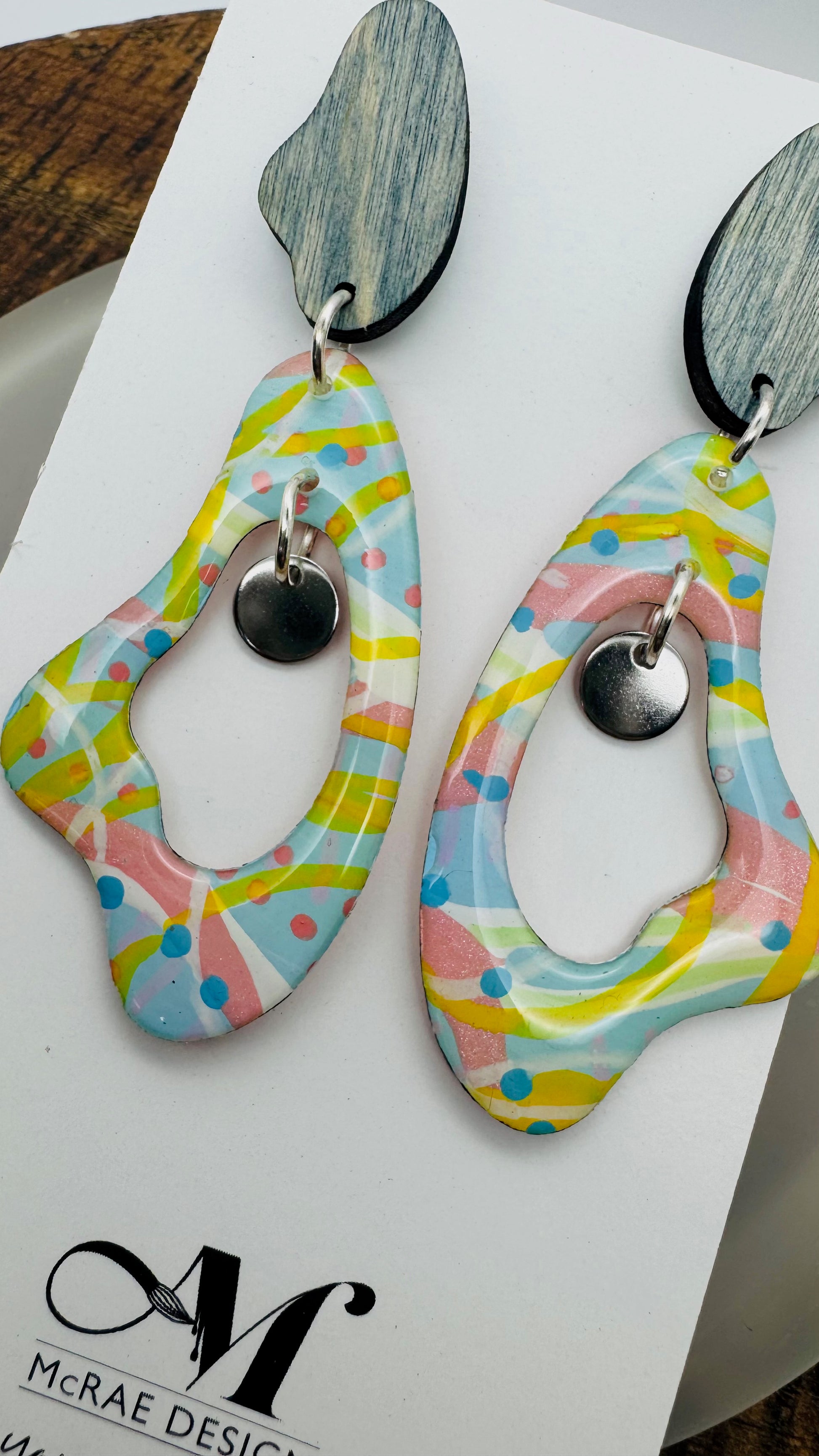Each pair in the Fade Into You collection begins as an original painting — layered brushstrokes on paper in pale Carolina blue, metallic pastel pink, and subtle hints of yellow. Fine white lines and tiny blue dots weave through the compositions like memory traces, each one preserved under a glassy resin finish.