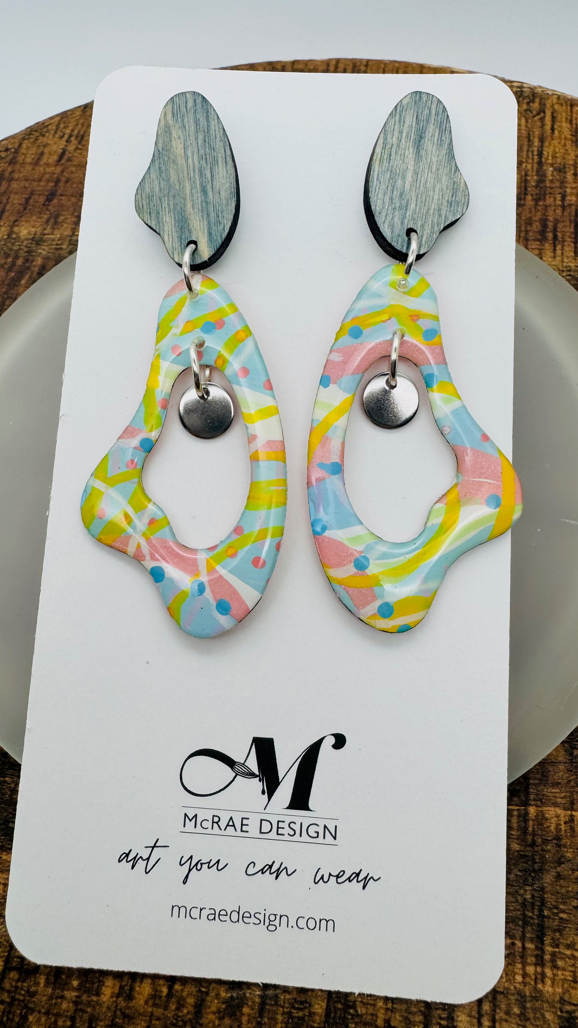 Hand-cut and shaped into lightweight earrings, every piece is a miniature canvas — adorned with natural wooden beads and soft-hued wooden accents in dusty blue and barely-there pink. The palette and textures echo the faded pages of old journals, cassette liner notes, and the quiet glow of a 90s bedroom window.