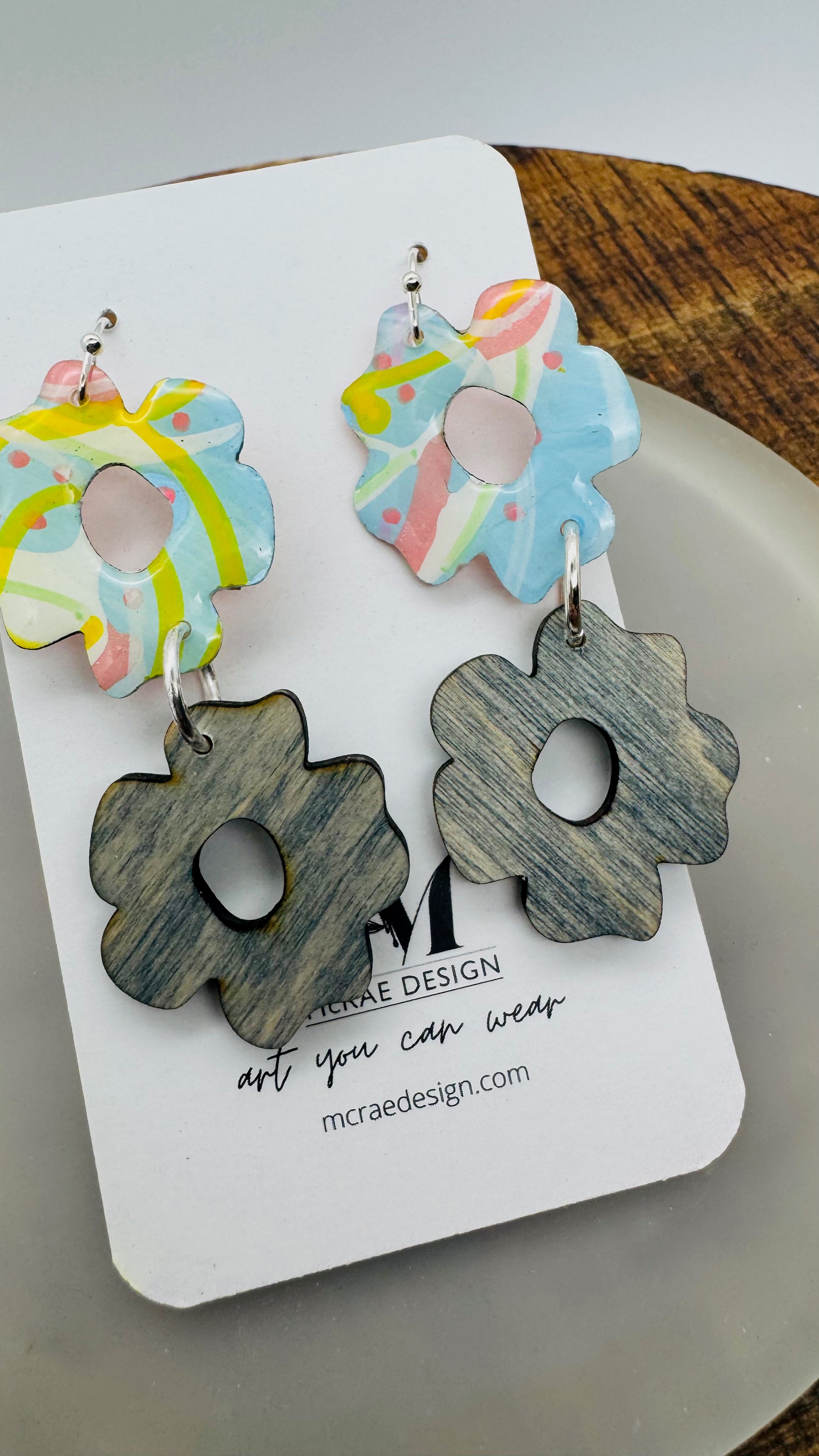 Hand-cut and shaped into lightweight earrings, every piece is a miniature canvas — adorned with natural wooden beads and soft-hued wooden accents in dusty blue and barely-there pink. The palette and textures echo the faded pages of old journals, cassette liner notes, and the quiet glow of a 90s bedroom window.