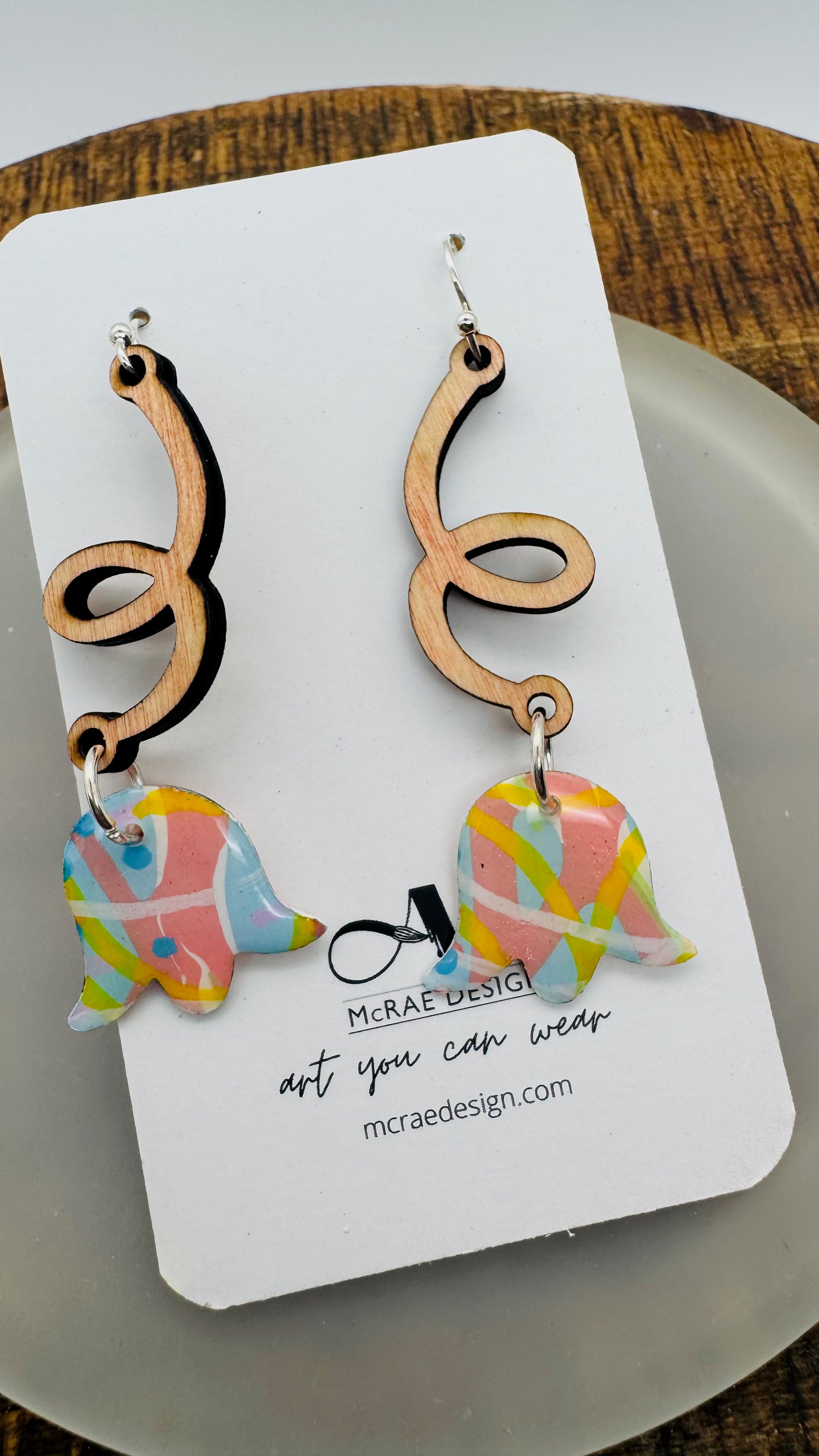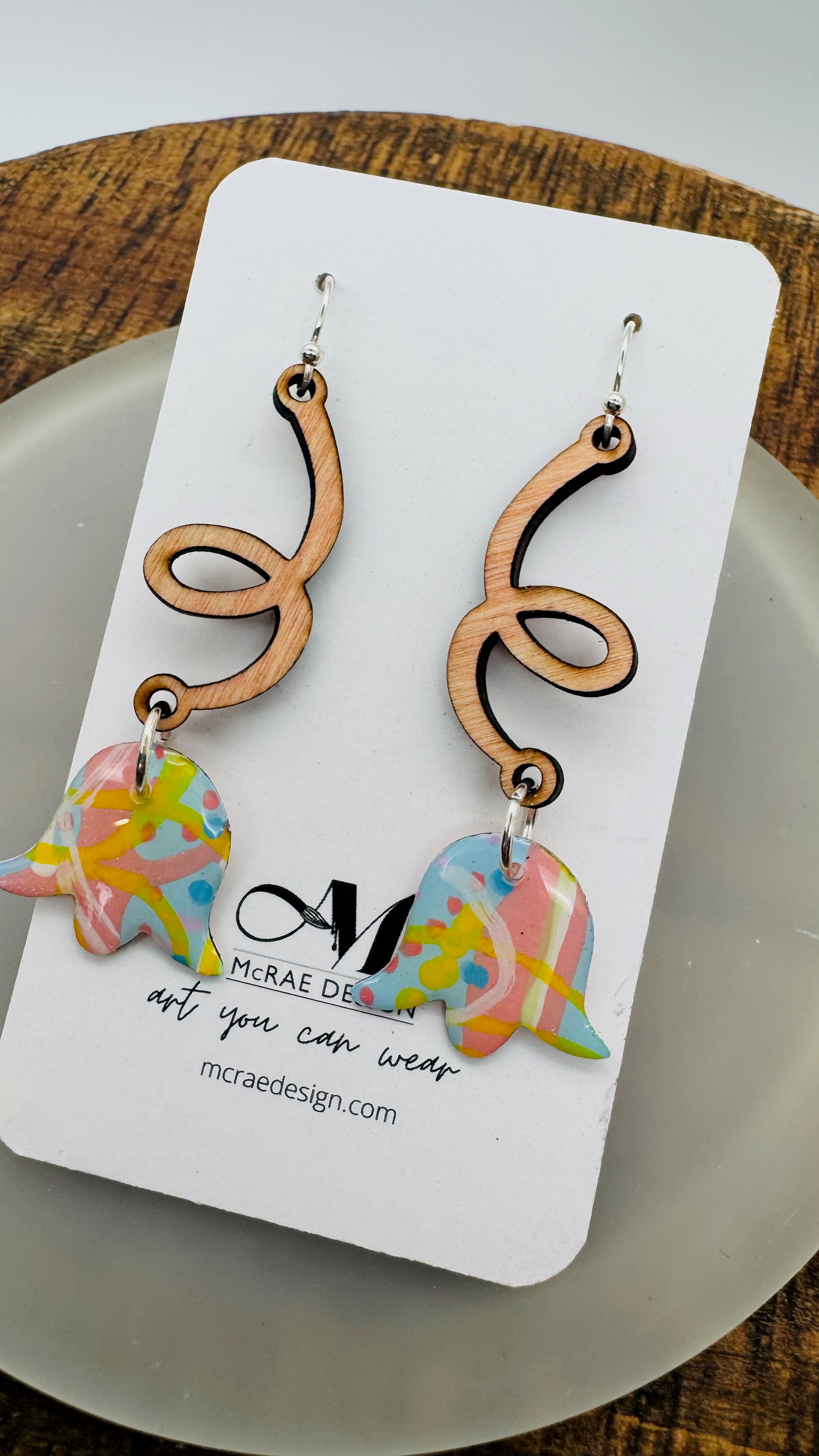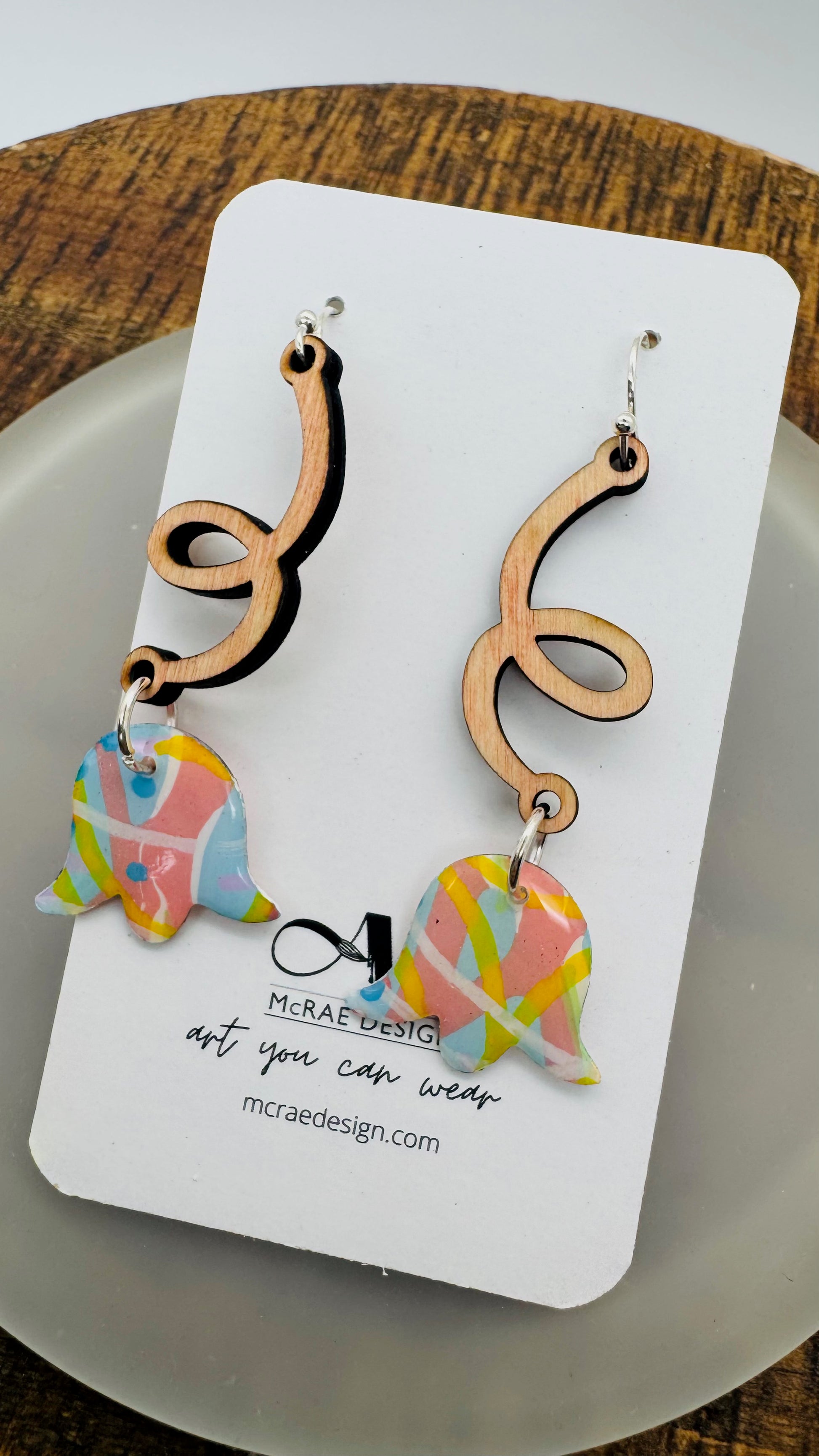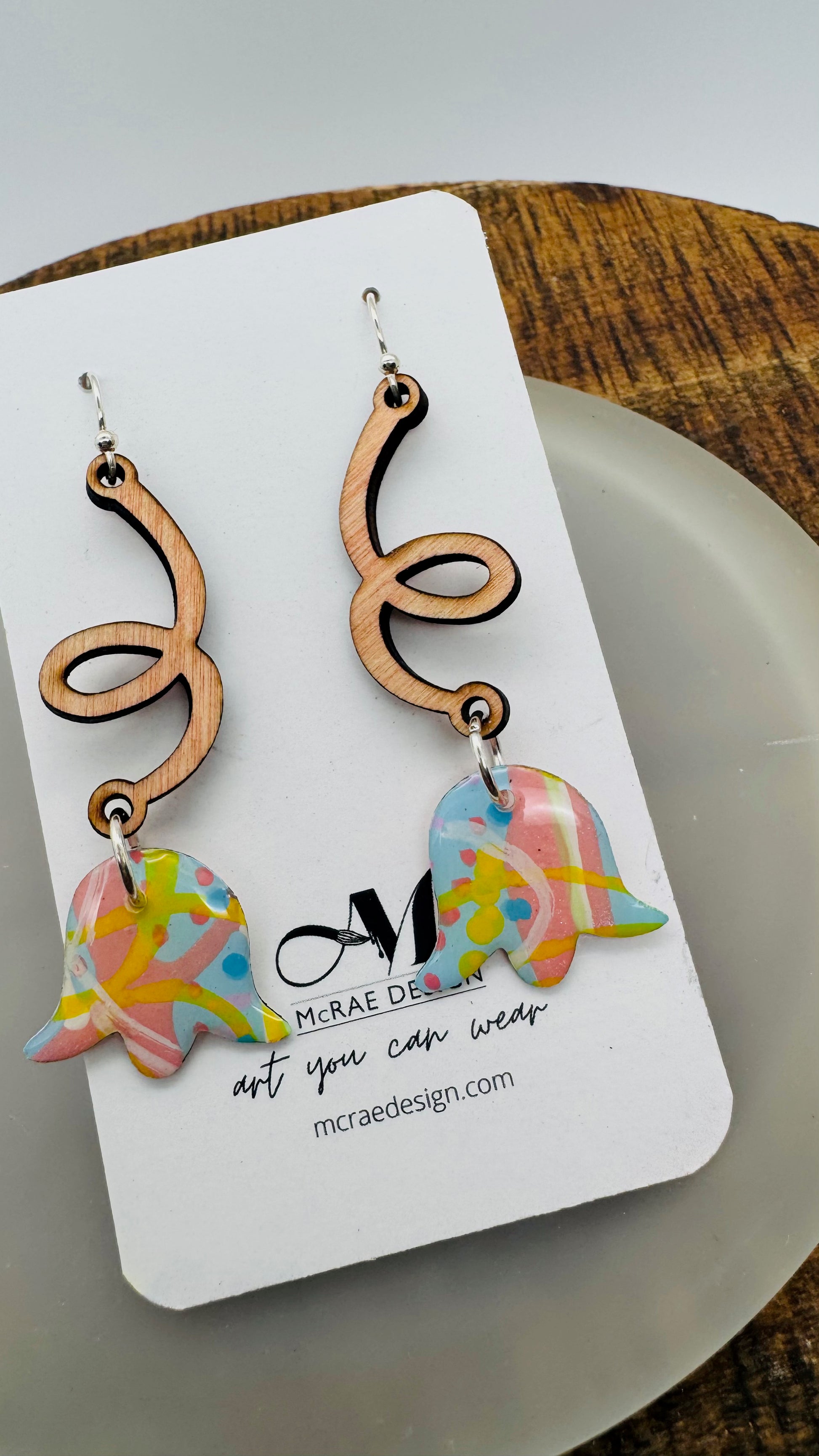 Hand-cut and shaped into lightweight earrings, every piece is a miniature canvas — adorned with natural wooden beads and soft-hued wooden accents in dusty blue and barely-there pink. The palette and textures echo the faded pages of old journals, cassette liner notes, and the quiet glow of a 90s bedroom window.