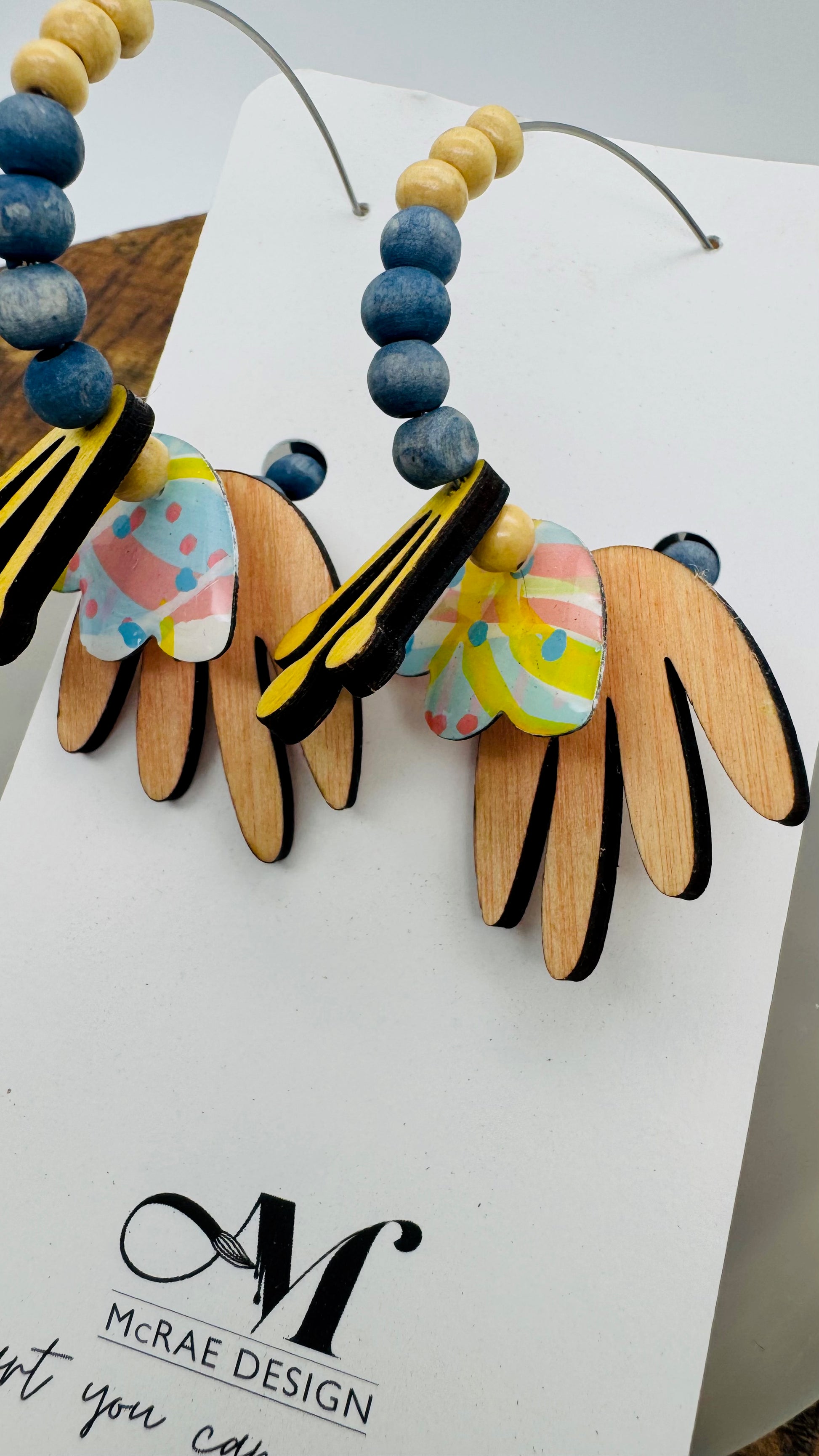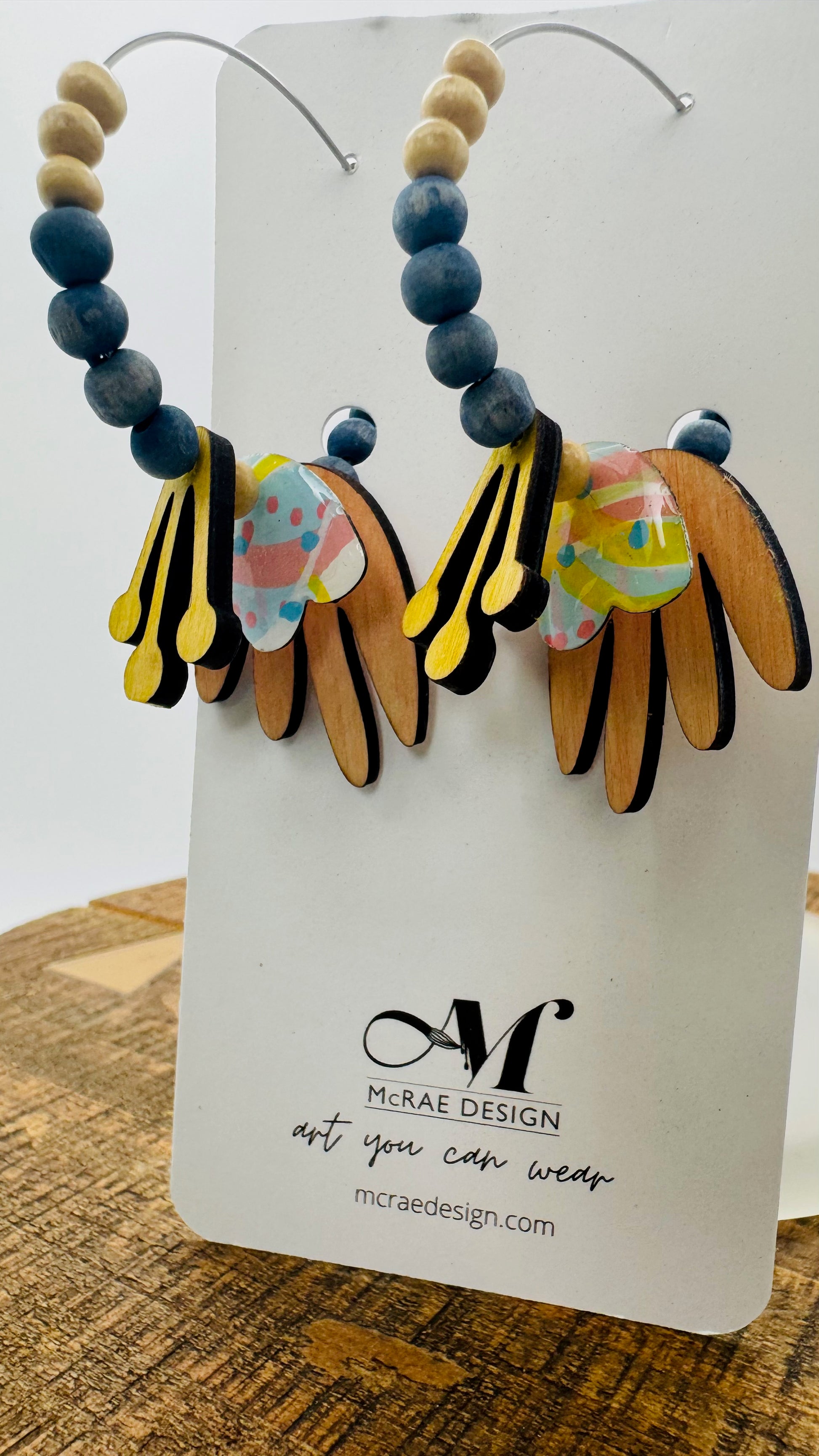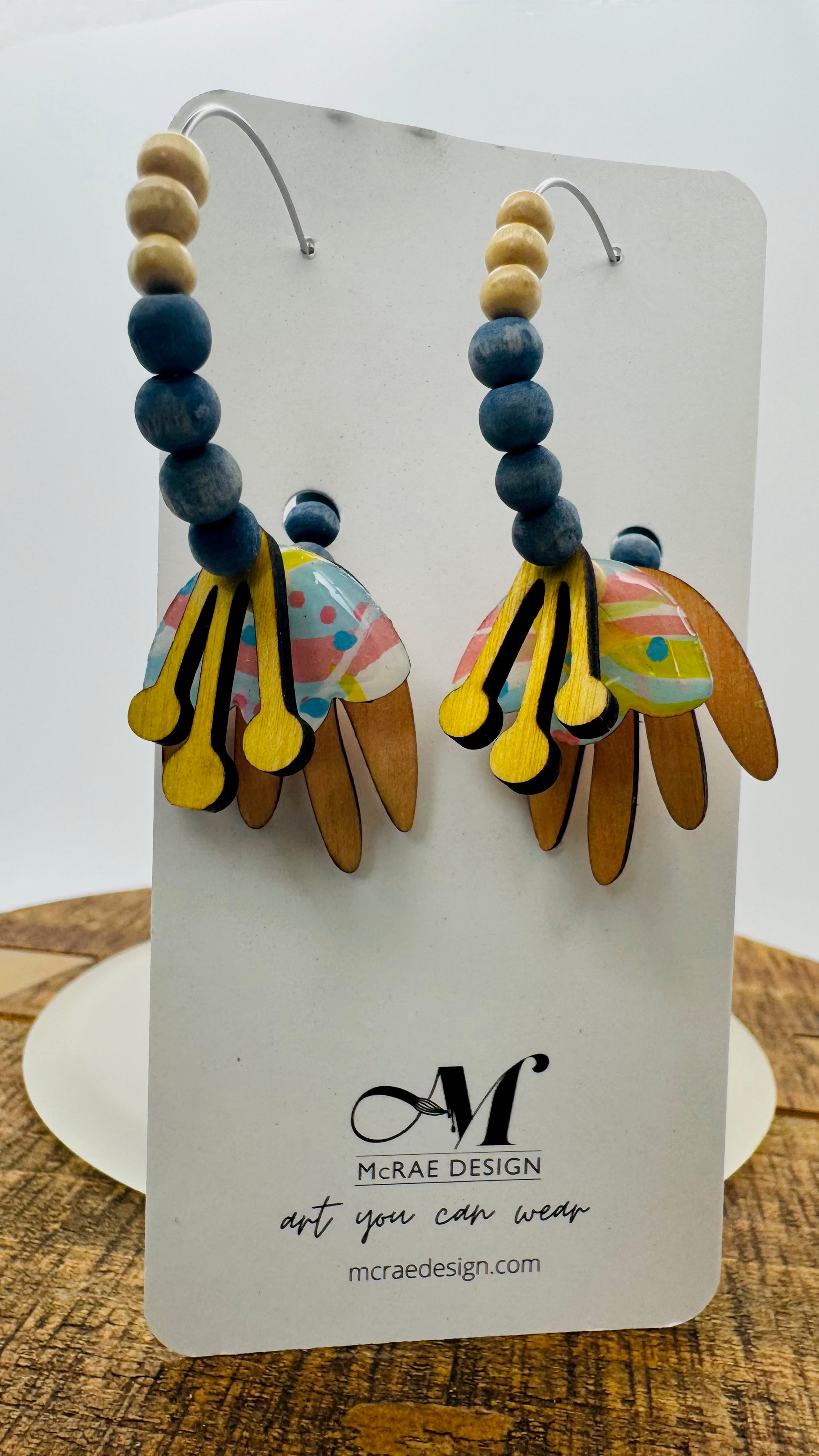 Hand-cut and shaped into lightweight earrings, every piece is a miniature canvas — adorned with natural wooden beads and soft-hued wooden accents in dusty blue and barely-there pink. The palette and textures echo the faded pages of old journals, cassette liner notes, and the quiet glow of a 90s bedroom window.