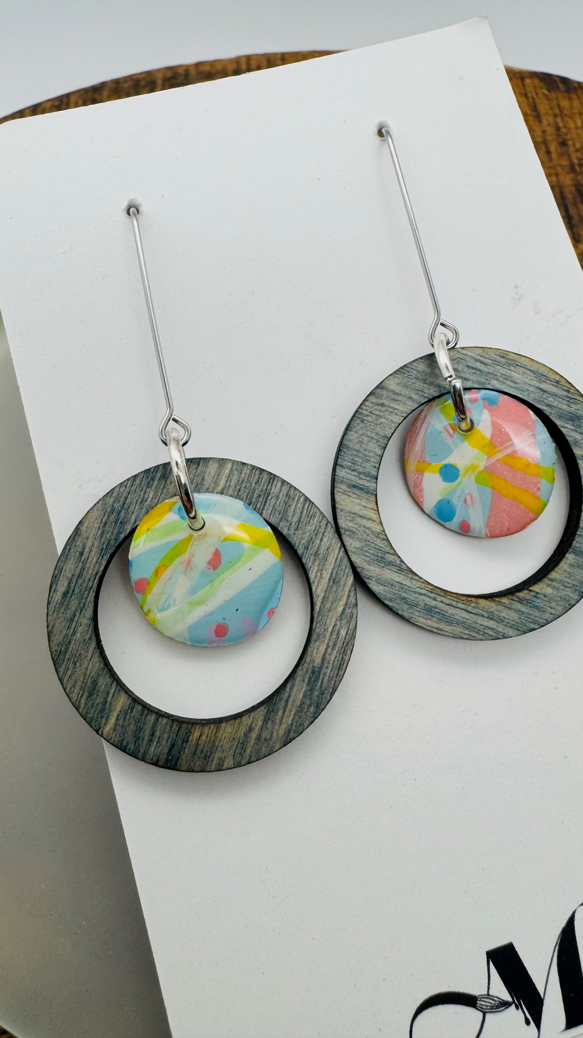 Hand-cut and shaped into lightweight earrings, every piece is a miniature canvas — adorned with natural wooden beads and soft-hued wooden accents in dusty blue and barely-there pink. The palette and textures echo the faded pages of old journals, cassette liner notes, and the quiet glow of a 90s bedroom window.