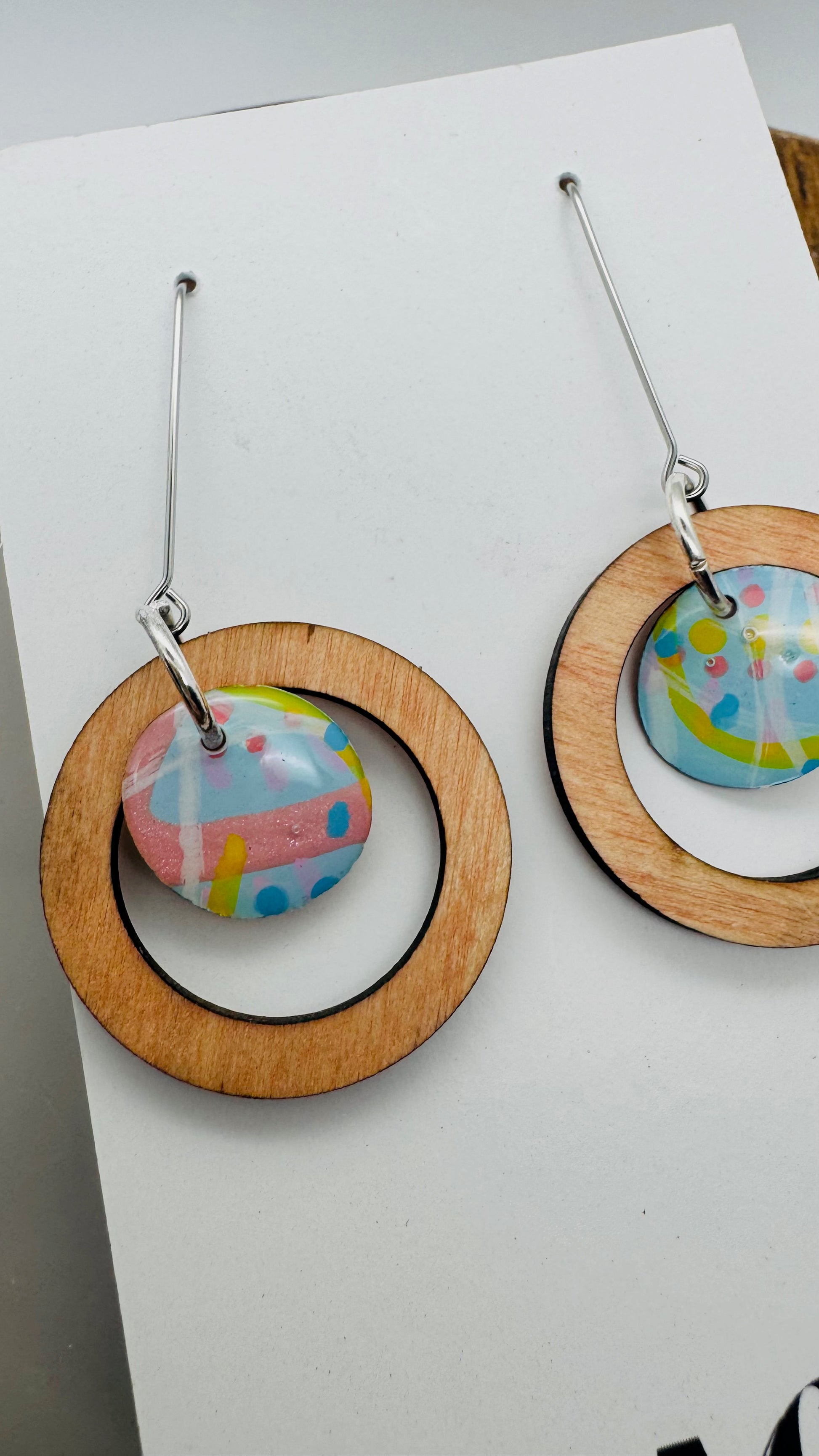 Hand-cut and shaped into lightweight earrings, every piece is a miniature canvas — adorned with natural wooden beads and soft-hued wooden accents in dusty blue and barely-there pink. The palette and textures echo the faded pages of old journals, cassette liner notes, and the quiet glow of a 90s bedroom window.