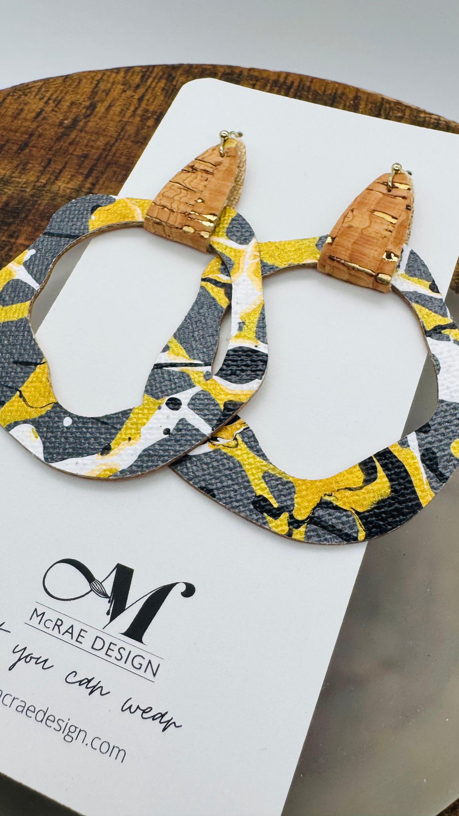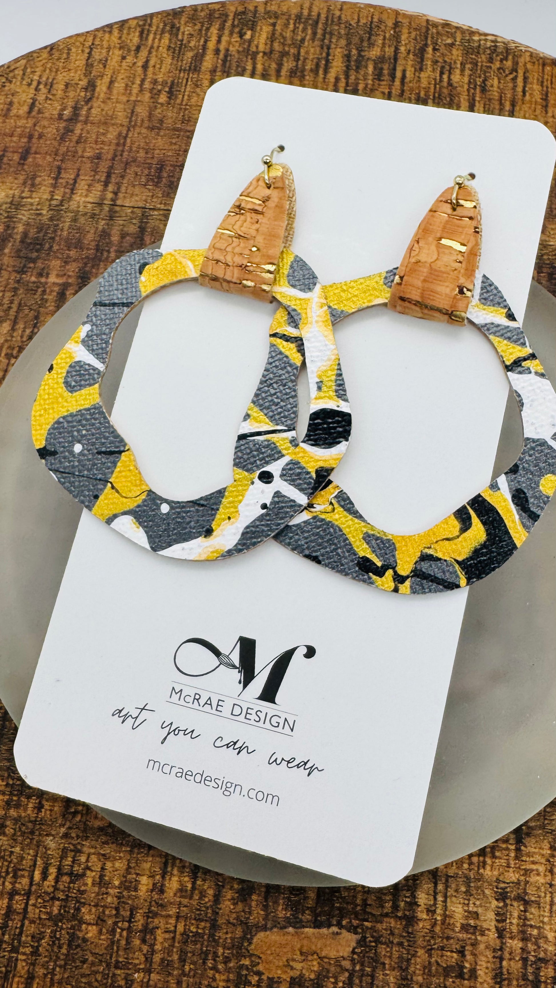 Painted on CANVAS backed with metallic cork. On 14K plated nickel-free hooks. Total length is approximately 3 inches.