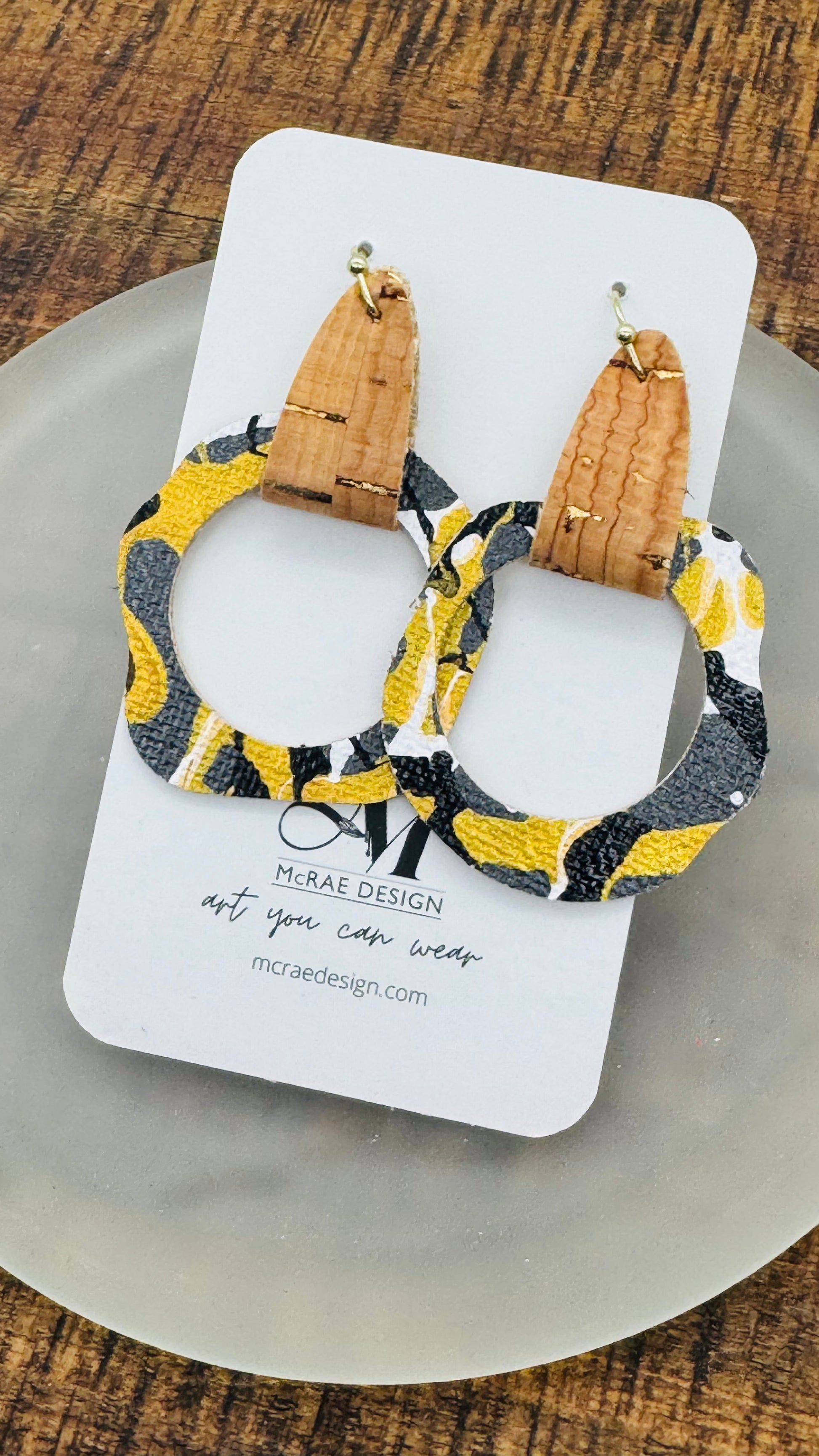 Painted on CANVAS backed with metallic cork. On 14K plated nickel-free hooks. Total length is approximately 1.5 inches.