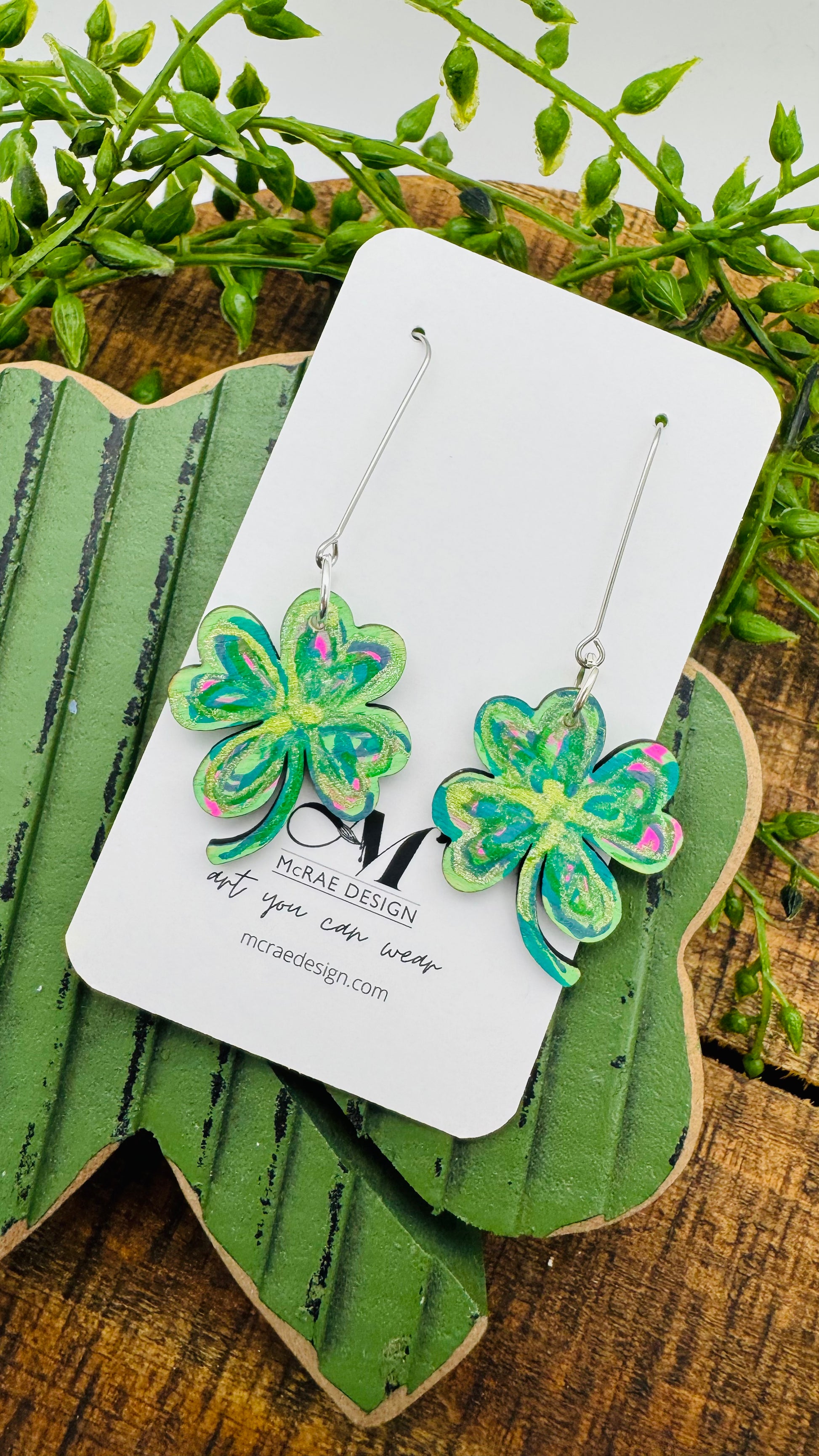 1 inch wooden four leaf clover on long threader style hook. Total length is 2.5 inches