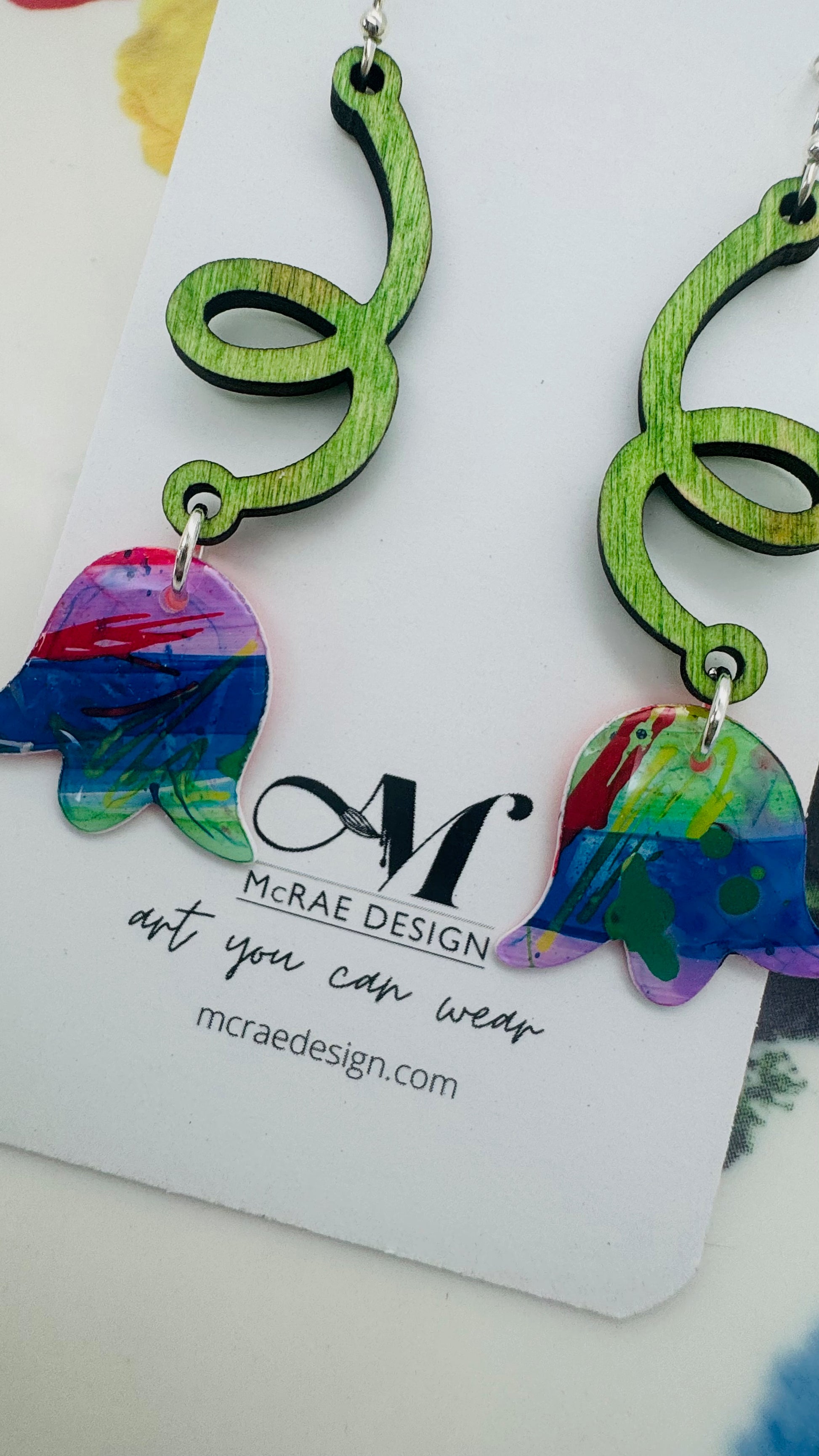 Infused with a pop art spirit, these earrings explode with a rainbow of hues—bright, punchy, and full of personality. Accents of hand-dyed wooden pieces and natural wooden beads add texture and contrast, grounding the electric palette with earthy warmth.