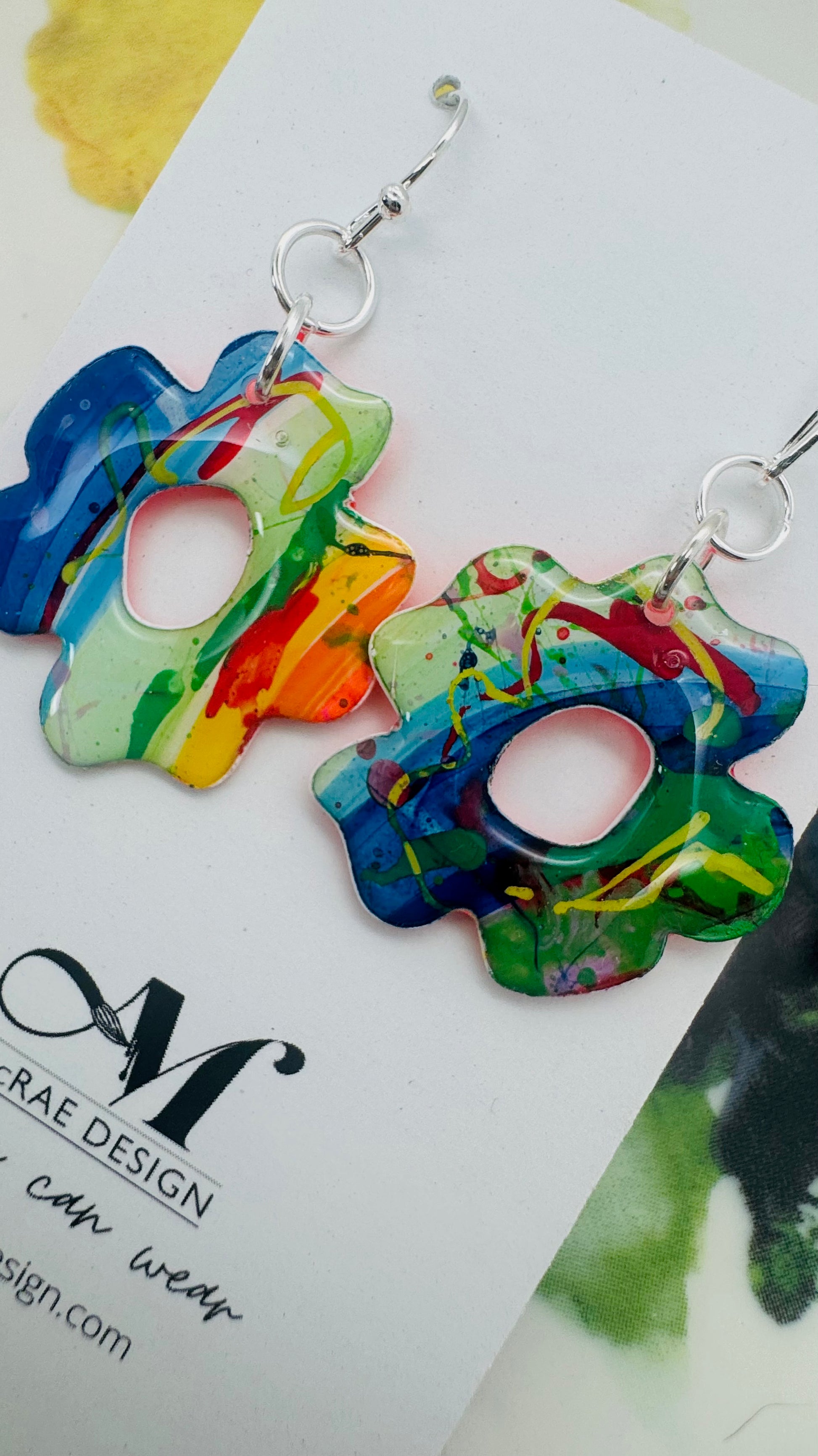 Crafted from paper and carefully sealed in glossy resin for durability and shine, these lightweight earrings are as comfortable as they are eye-catching. No two pairs are exactly alike—each one is a unique, one-of-a-kind statement in color and form.