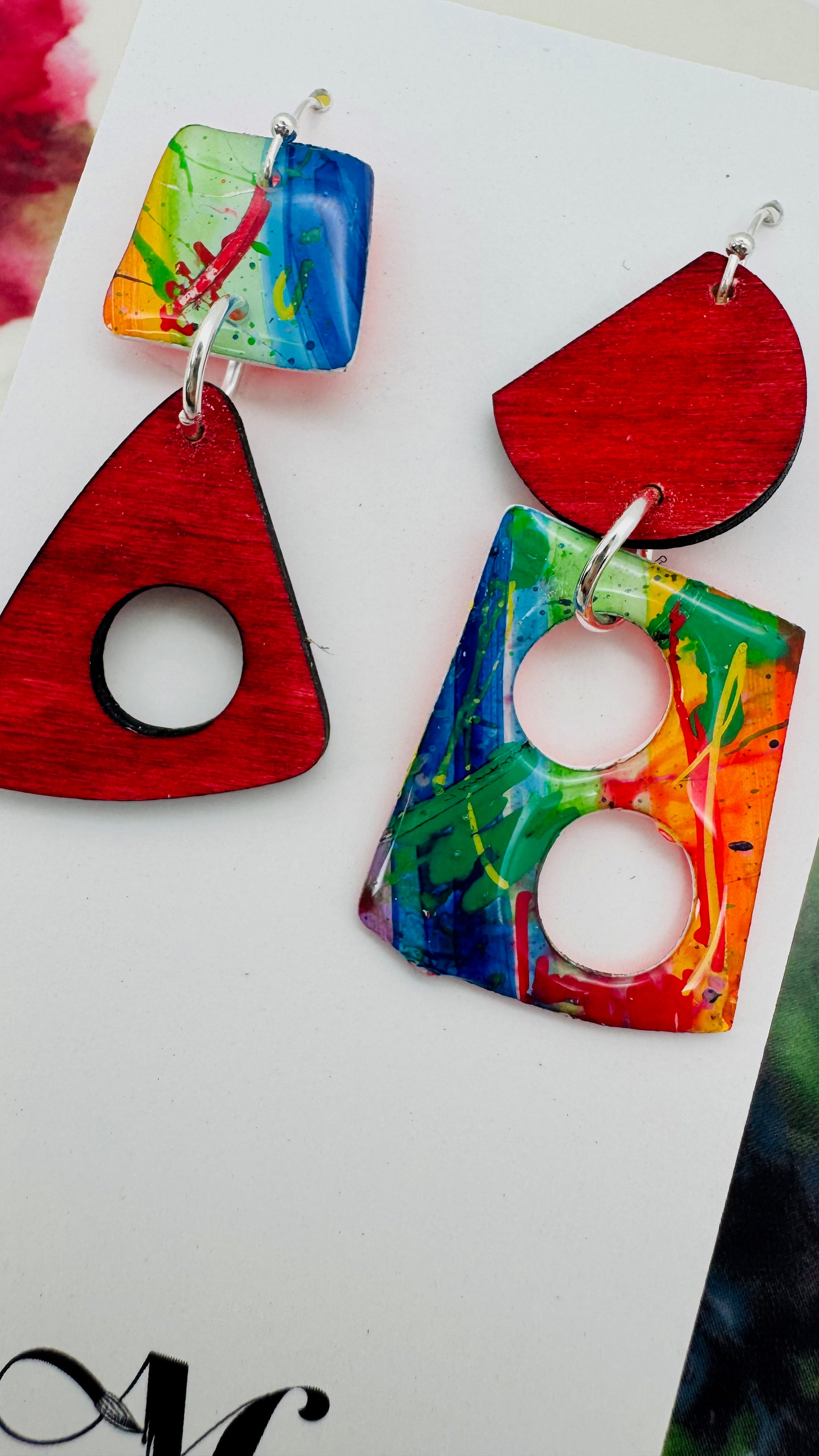 Crafted from paper and carefully sealed in glossy resin for durability and shine, these lightweight earrings are as comfortable as they are eye-catching. No two pairs are exactly alike—each one is a unique, one-of-a-kind statement in color and form.