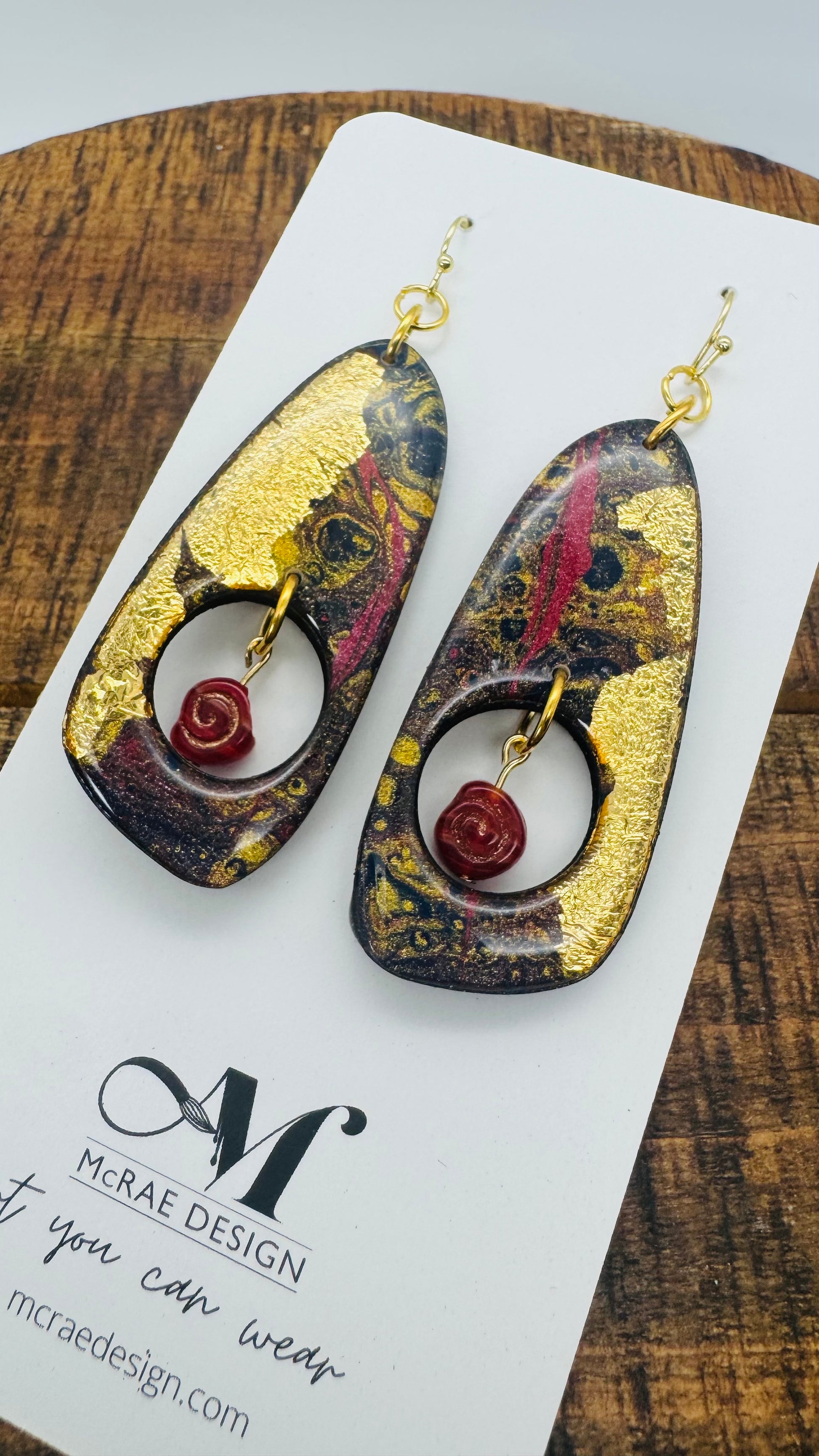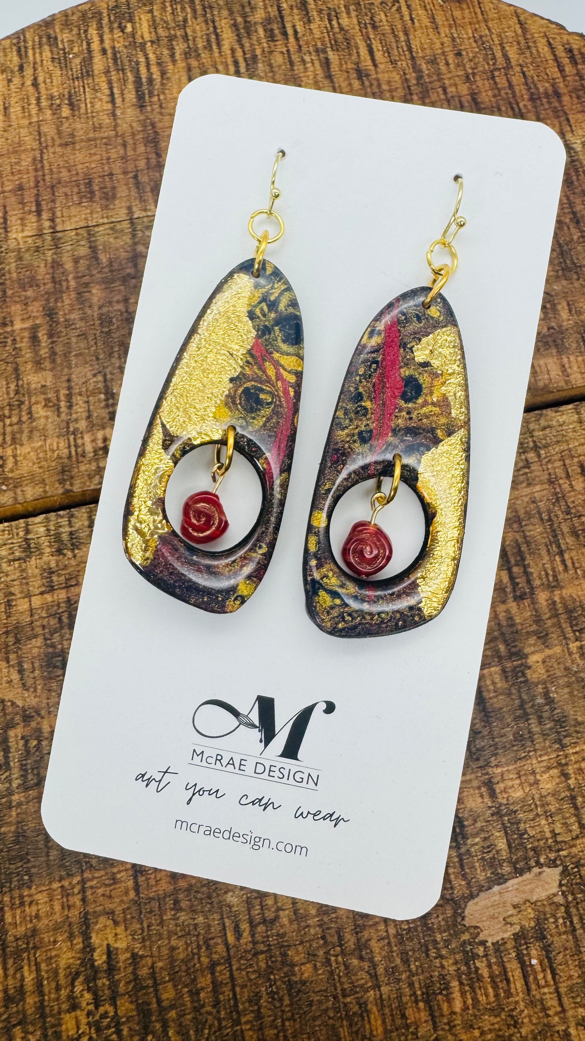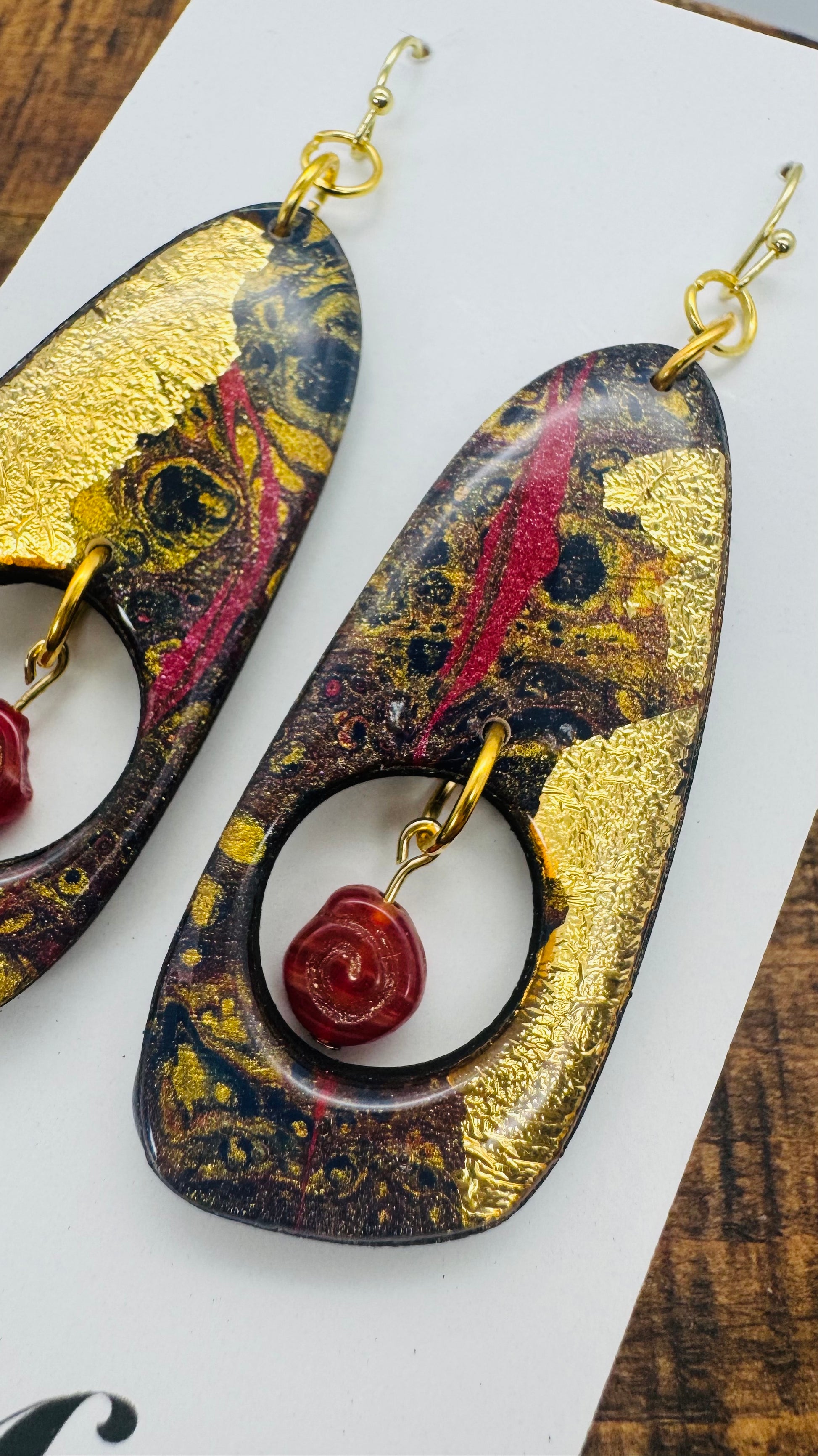 Each piece is hand-painted on black walnut and accented with shimmering gold leaf, creating a one-of-a-kind balance of organic form and radiant shine. These earrings catch the light—and the compliments—with every turn.
