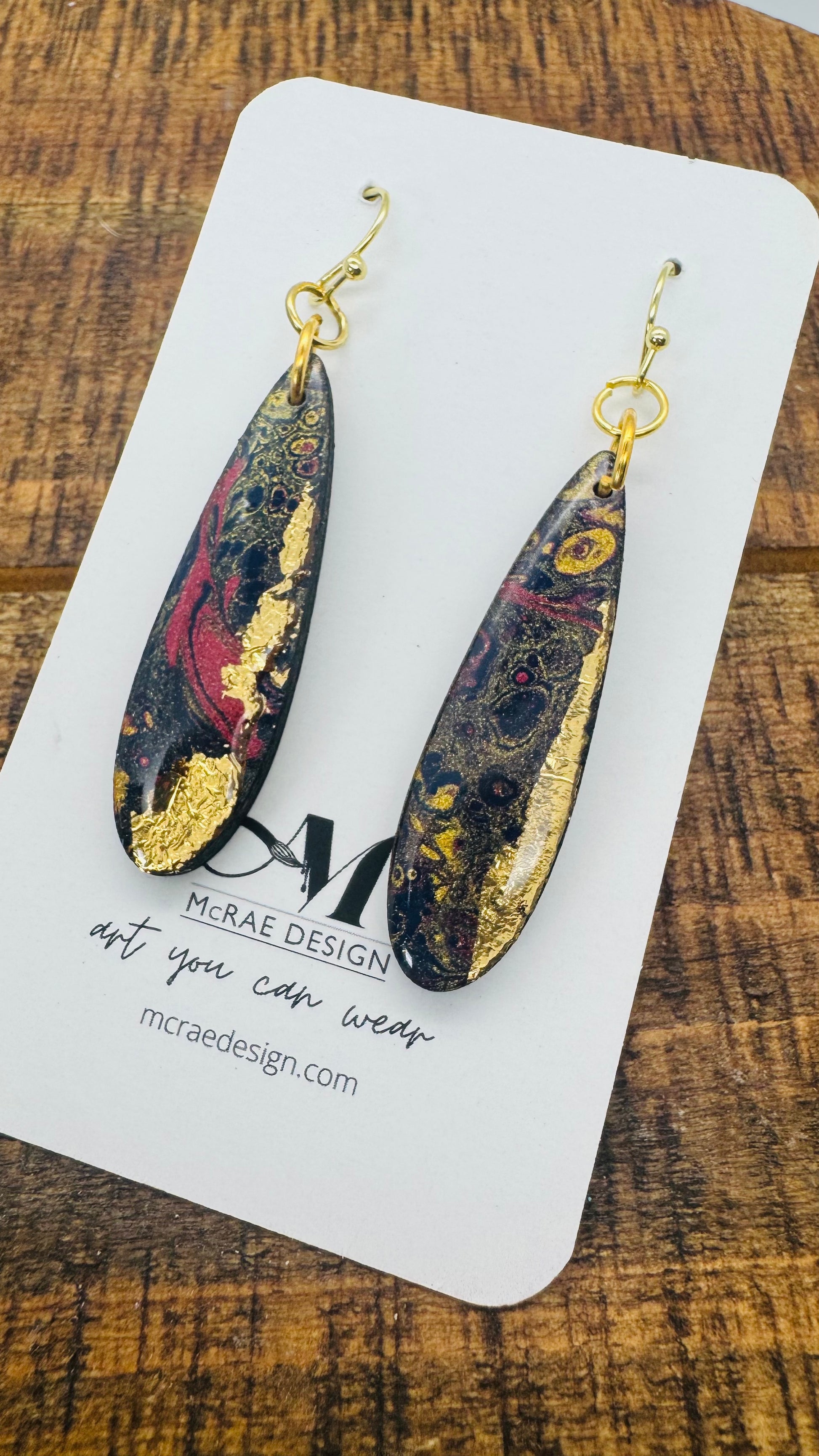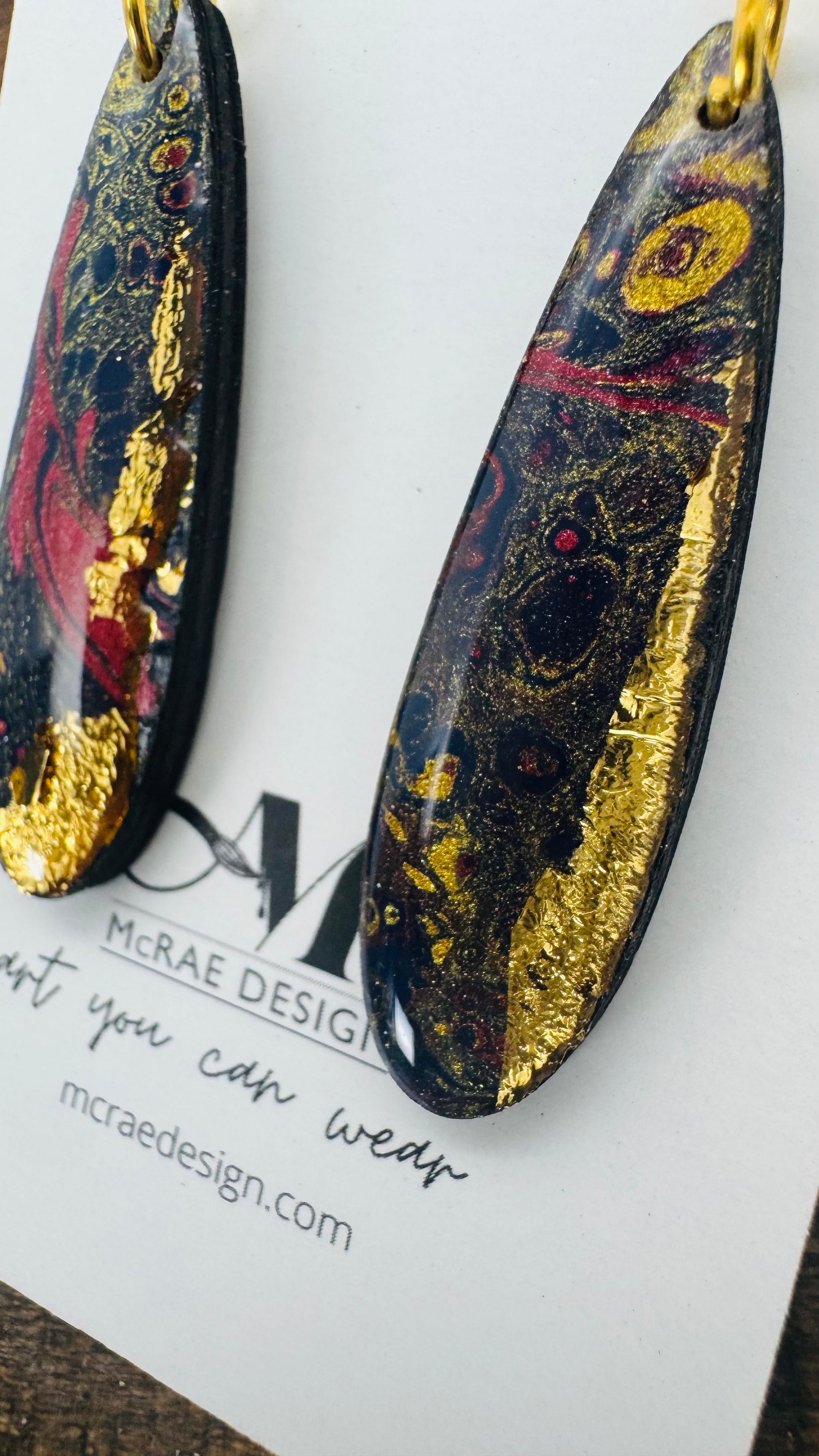 Each piece is hand-painted on black walnut and accented with shimmering gold leaf, creating a one-of-a-kind balance of organic form and radiant shine. These earrings catch the light—and the compliments—with every turn.
