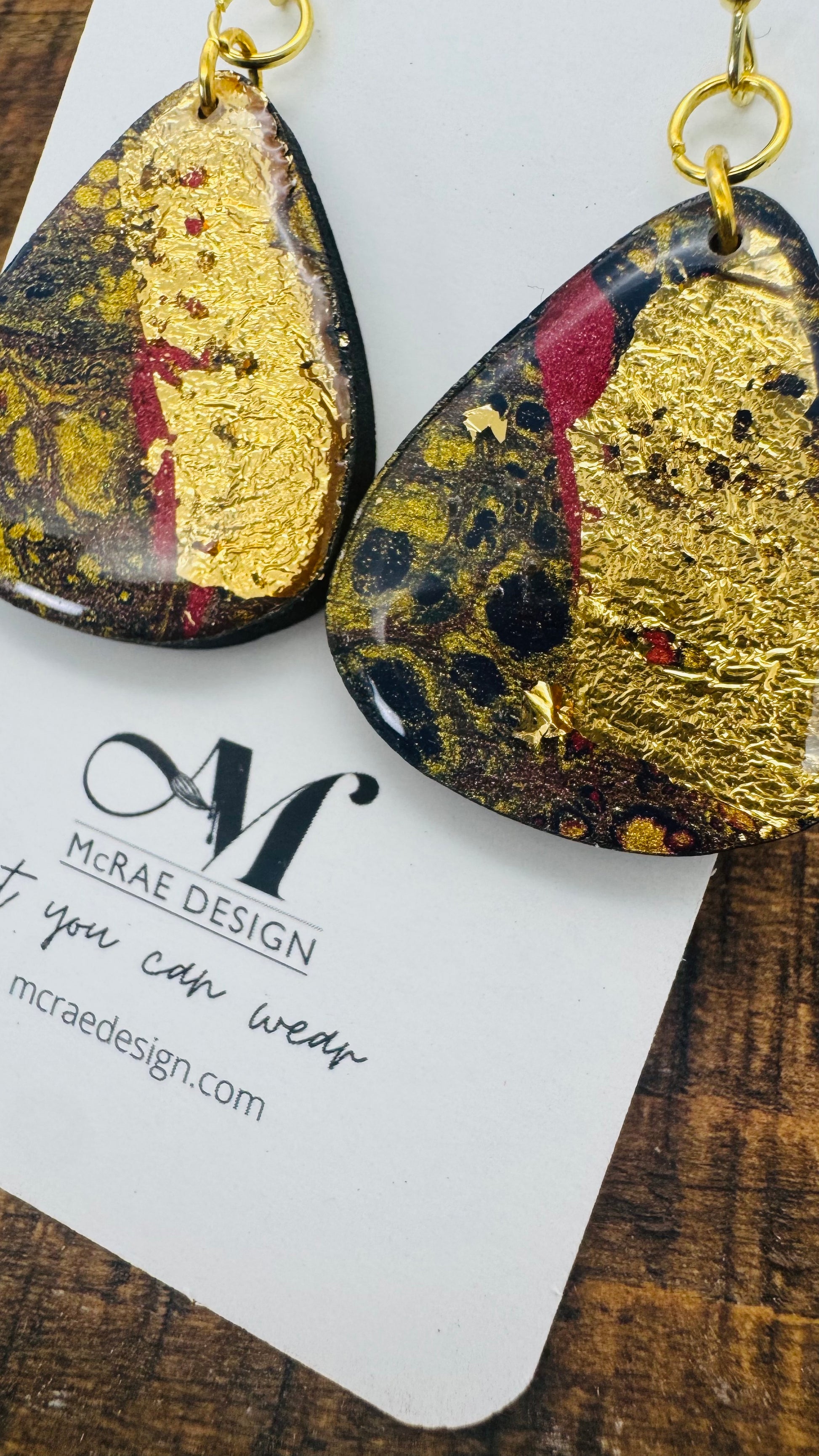 Each piece is hand-painted on black walnut and accented with shimmering gold leaf, creating a one-of-a-kind balance of organic form and radiant shine. These earrings catch the light—and the compliments—with every turn.