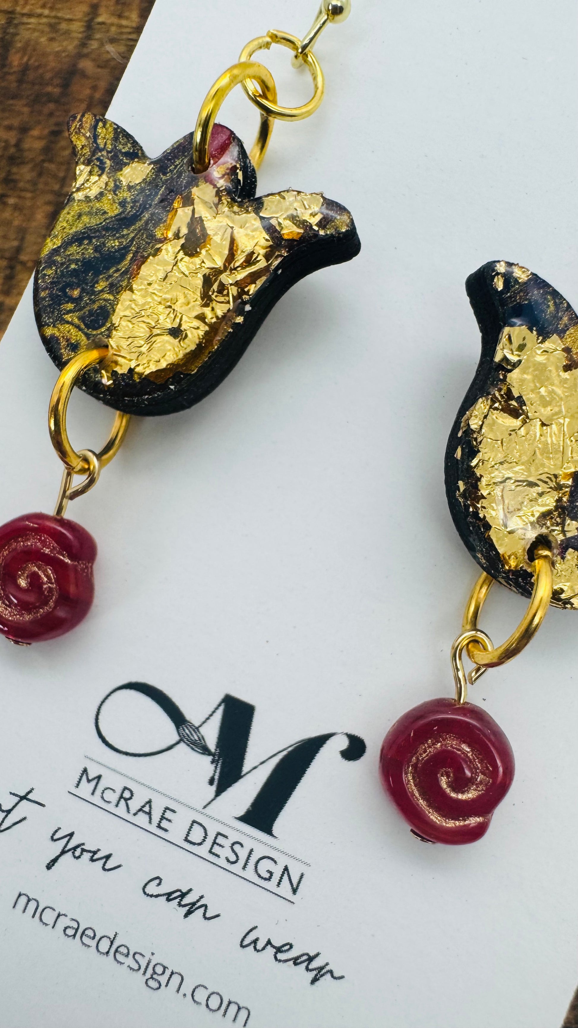 Each piece is hand-painted on black walnut and accented with shimmering gold leaf, creating a one-of-a-kind balance of organic form and radiant shine. These earrings catch the light—and the compliments—with every turn.