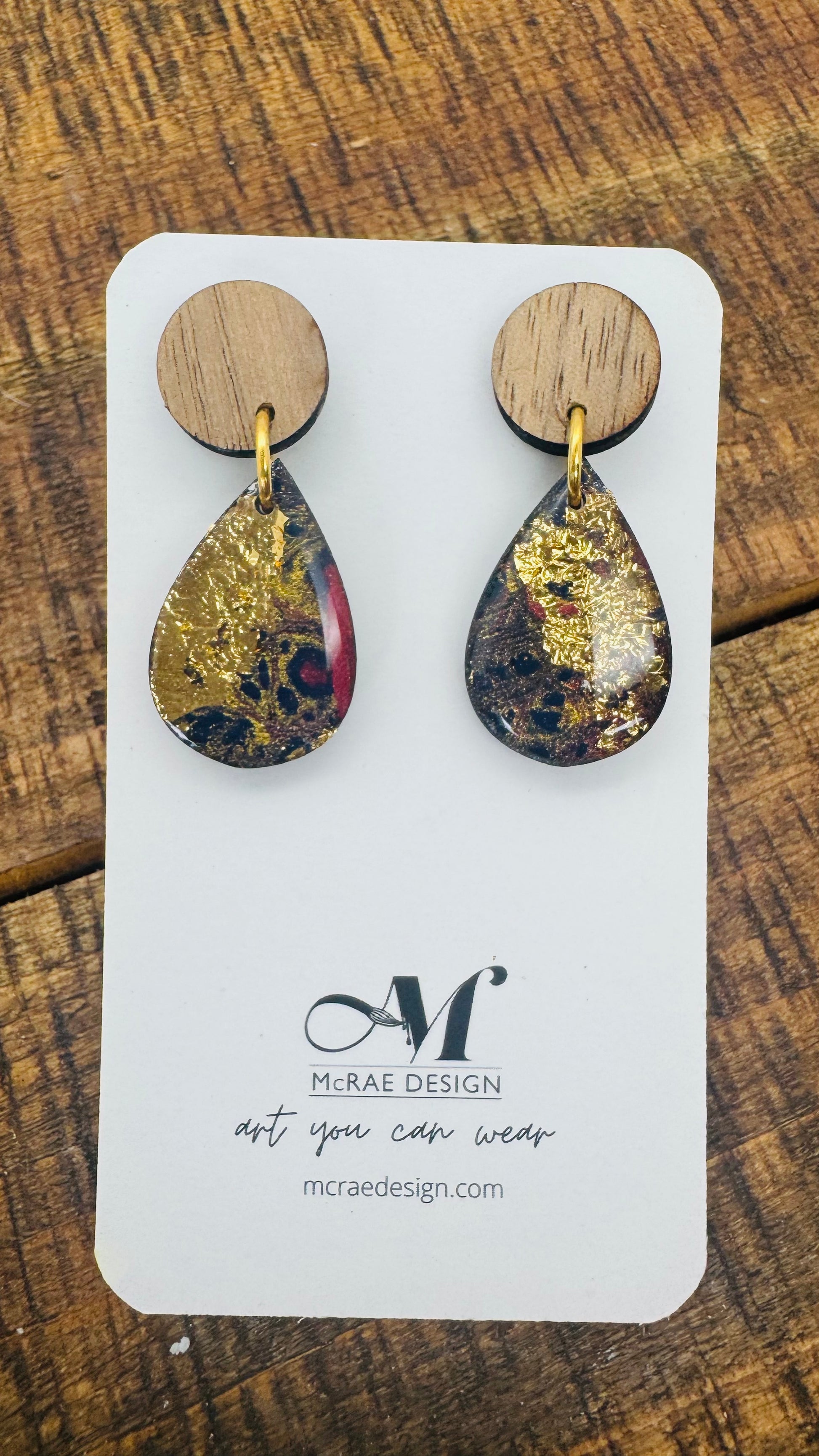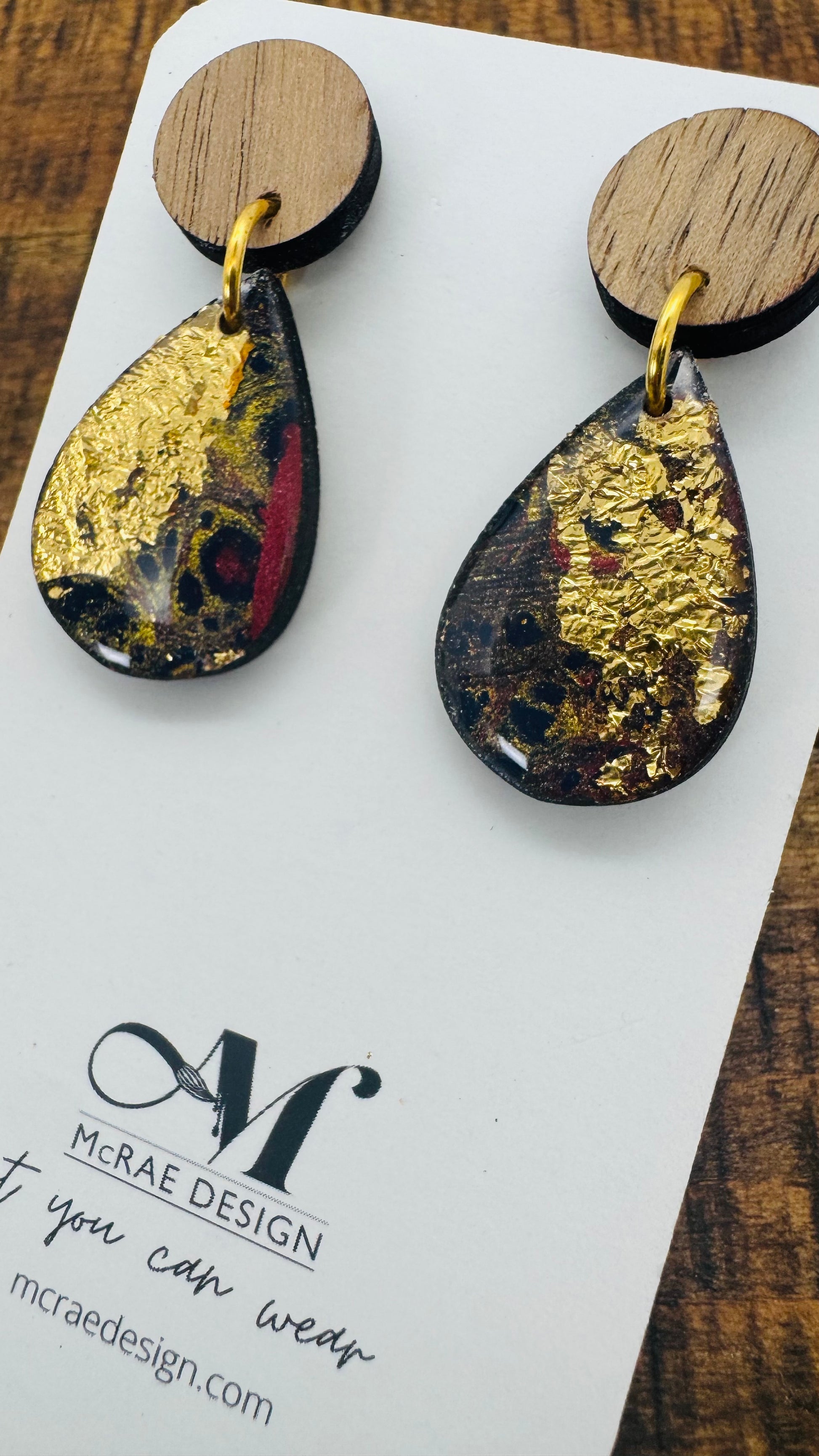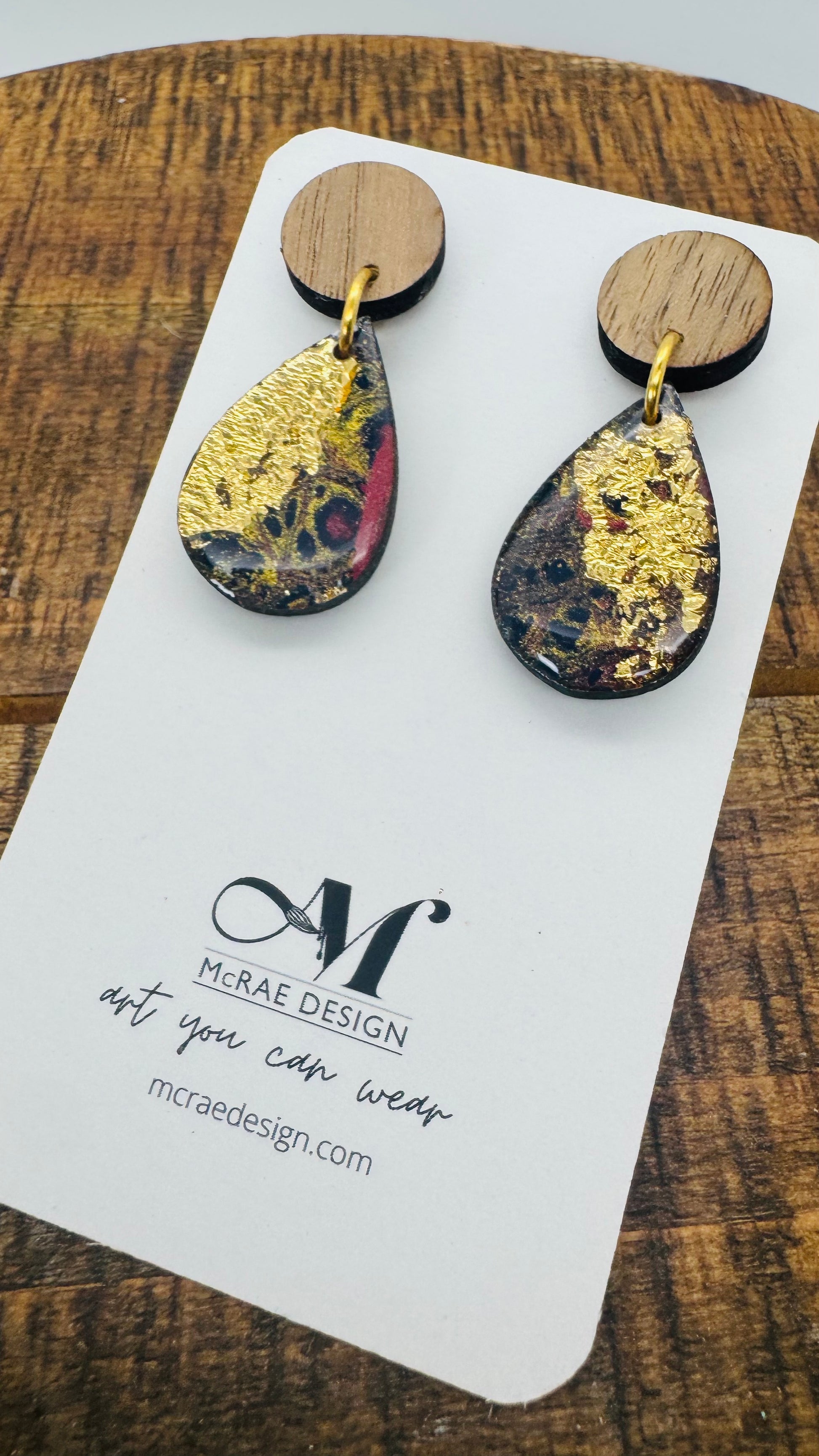 Each piece is hand-painted on black walnut and accented with shimmering gold leaf, creating a one-of-a-kind balance of organic form and radiant shine. These earrings catch the light—and the compliments—with every turn.