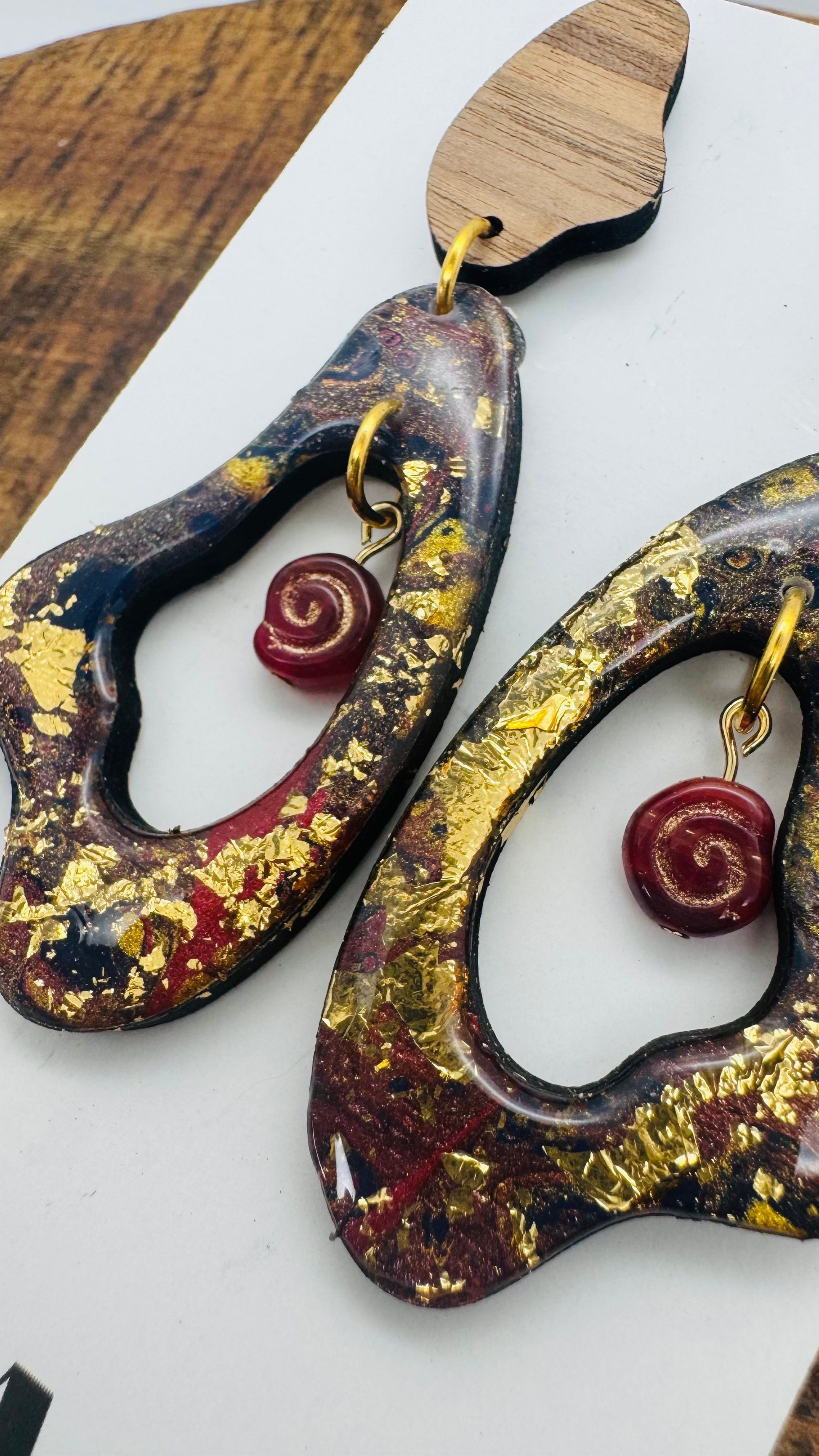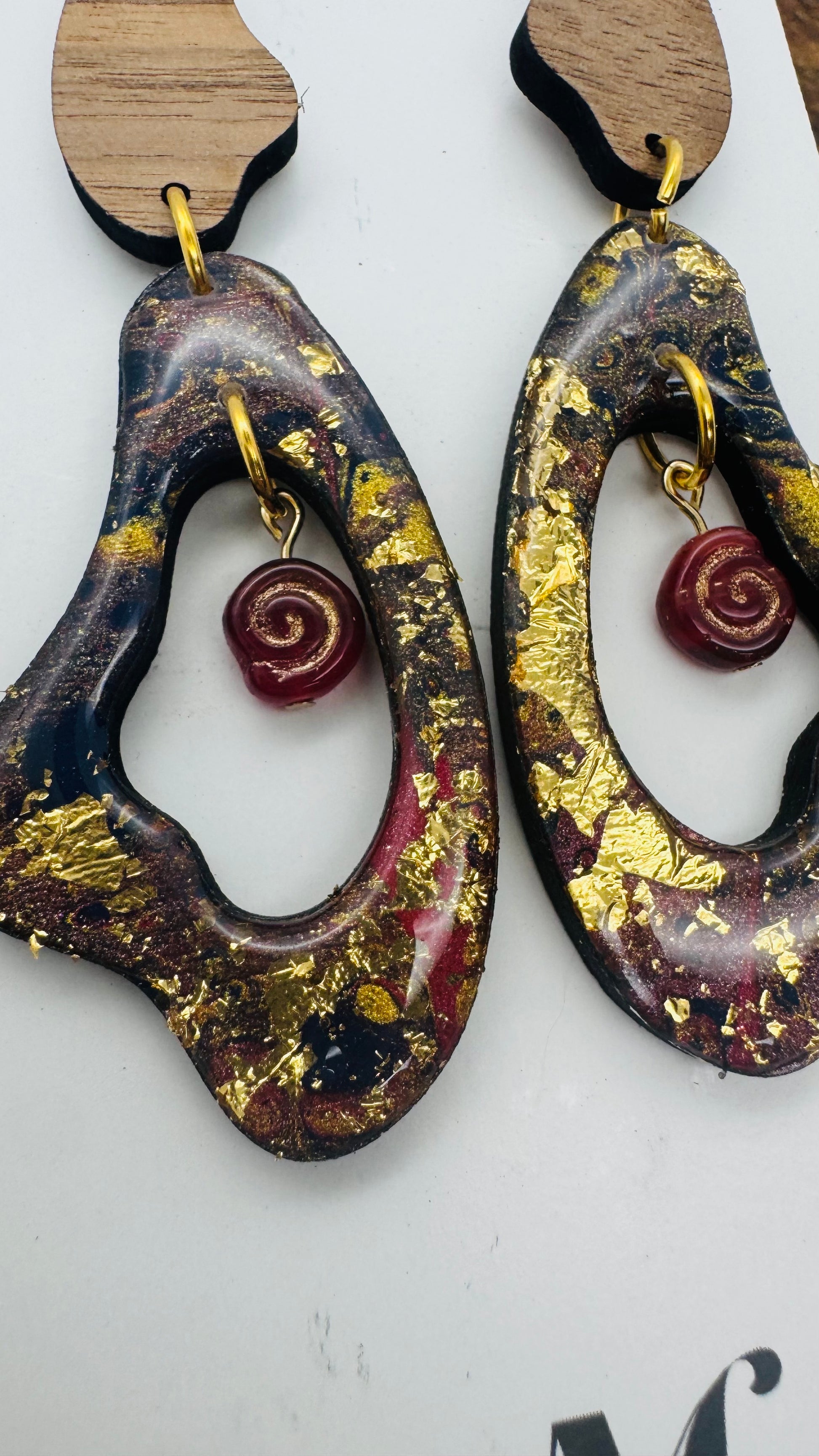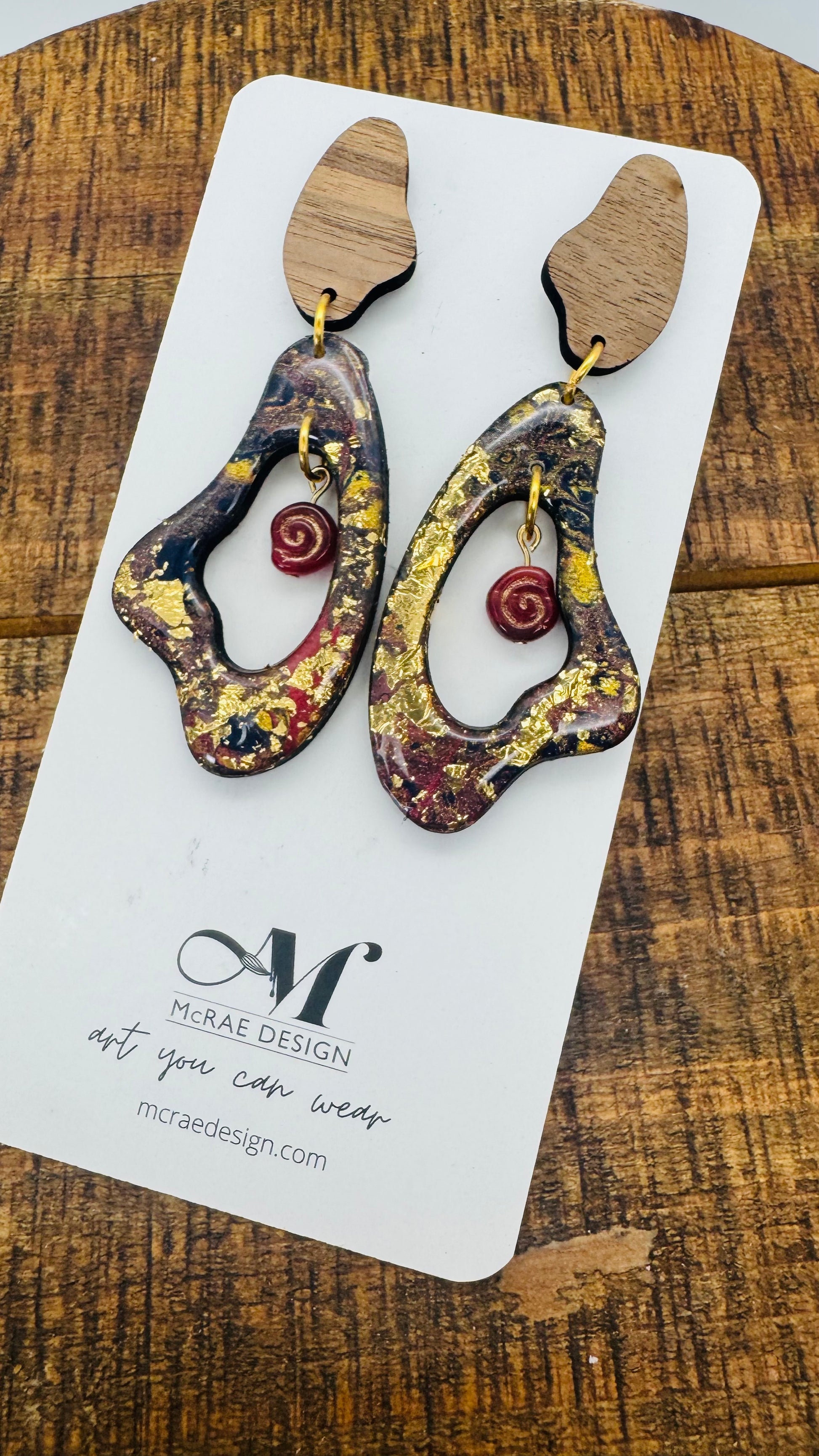 Each piece is hand-painted on black walnut and accented with shimmering gold leaf, creating a one-of-a-kind balance of organic form and radiant shine. These earrings catch the light—and the compliments—with every turn.