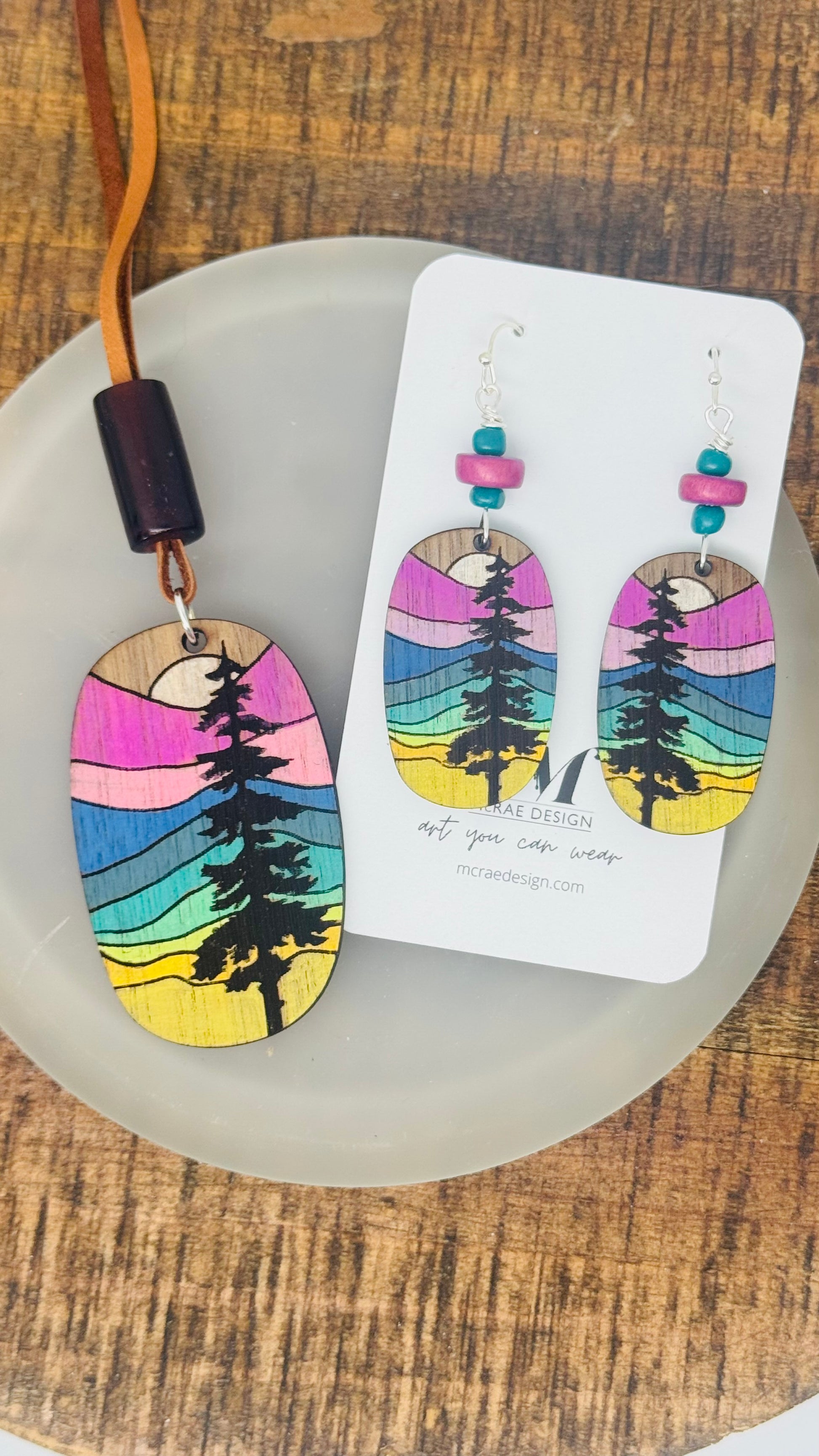 Step into a world where color meets calm. Each earring in the Painted Pines collection is a tiny, wearable painting—handcrafted on black walnut wood and adorned with hand-painted wooden and coconut beads. The vibrant skies and silhouetted pines evoke the magic of golden hour in the mountains, just before the stars take over.