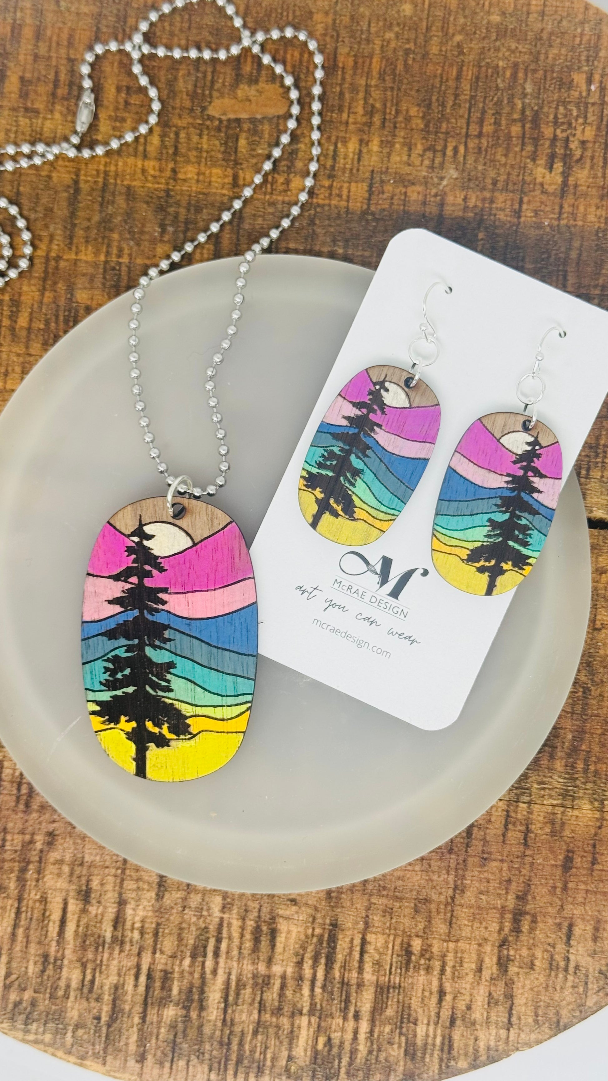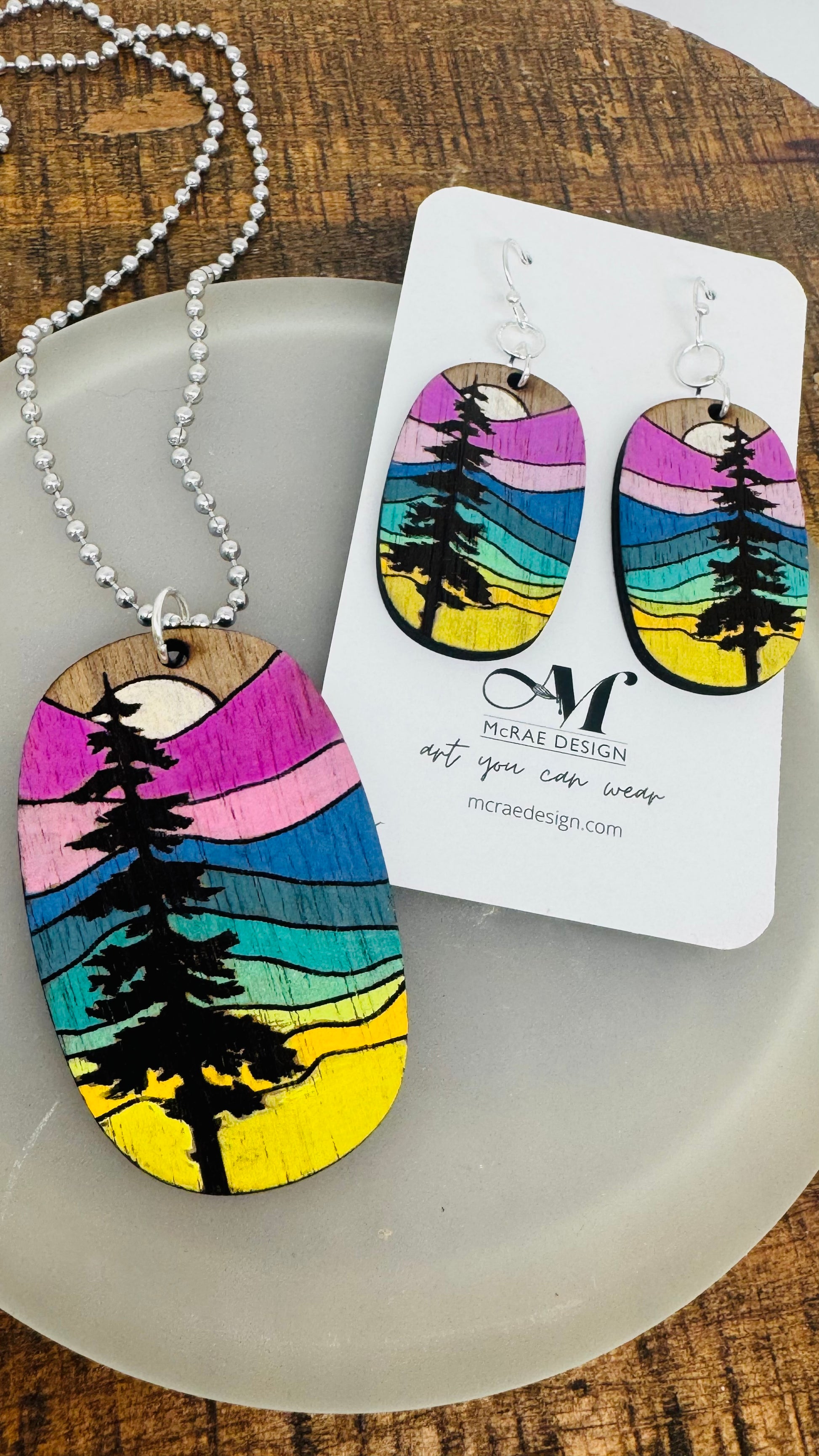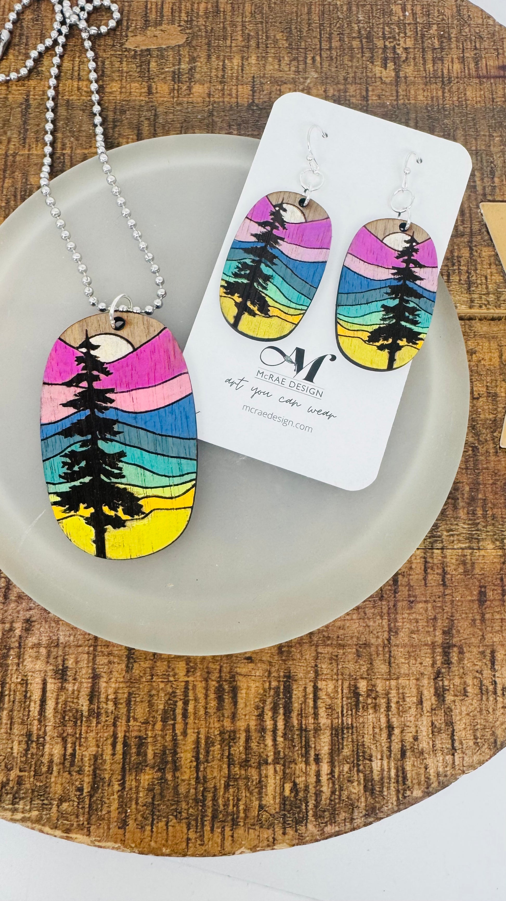 Step into a world where color meets calm. Each earring in the Painted Pines collection is a tiny, wearable painting—handcrafted on black walnut wood and adorned with hand-painted wooden and coconut beads. The vibrant skies and silhouetted pines evoke the magic of golden hour in the mountains, just before the stars take over.