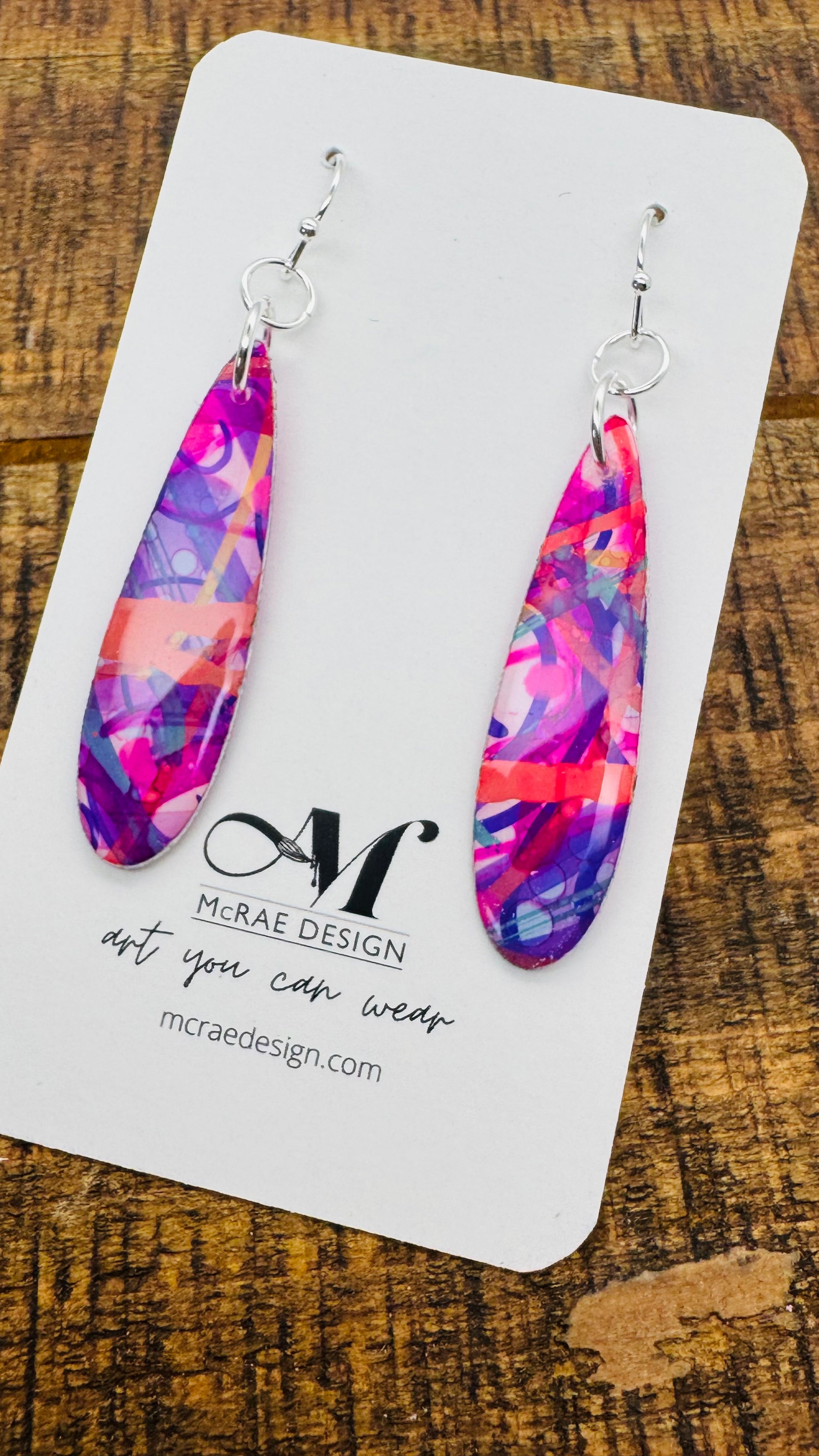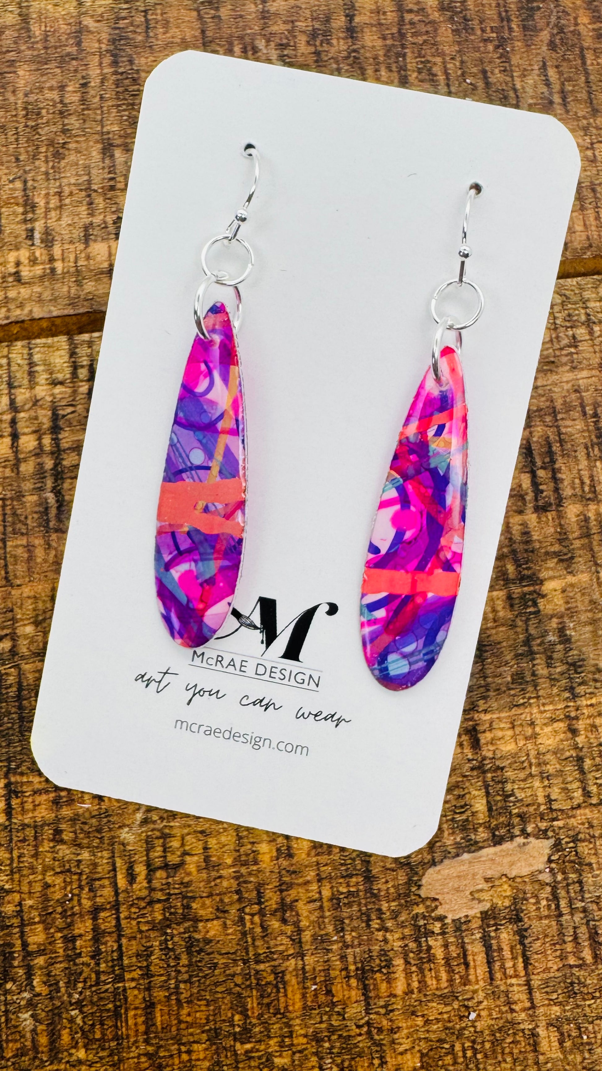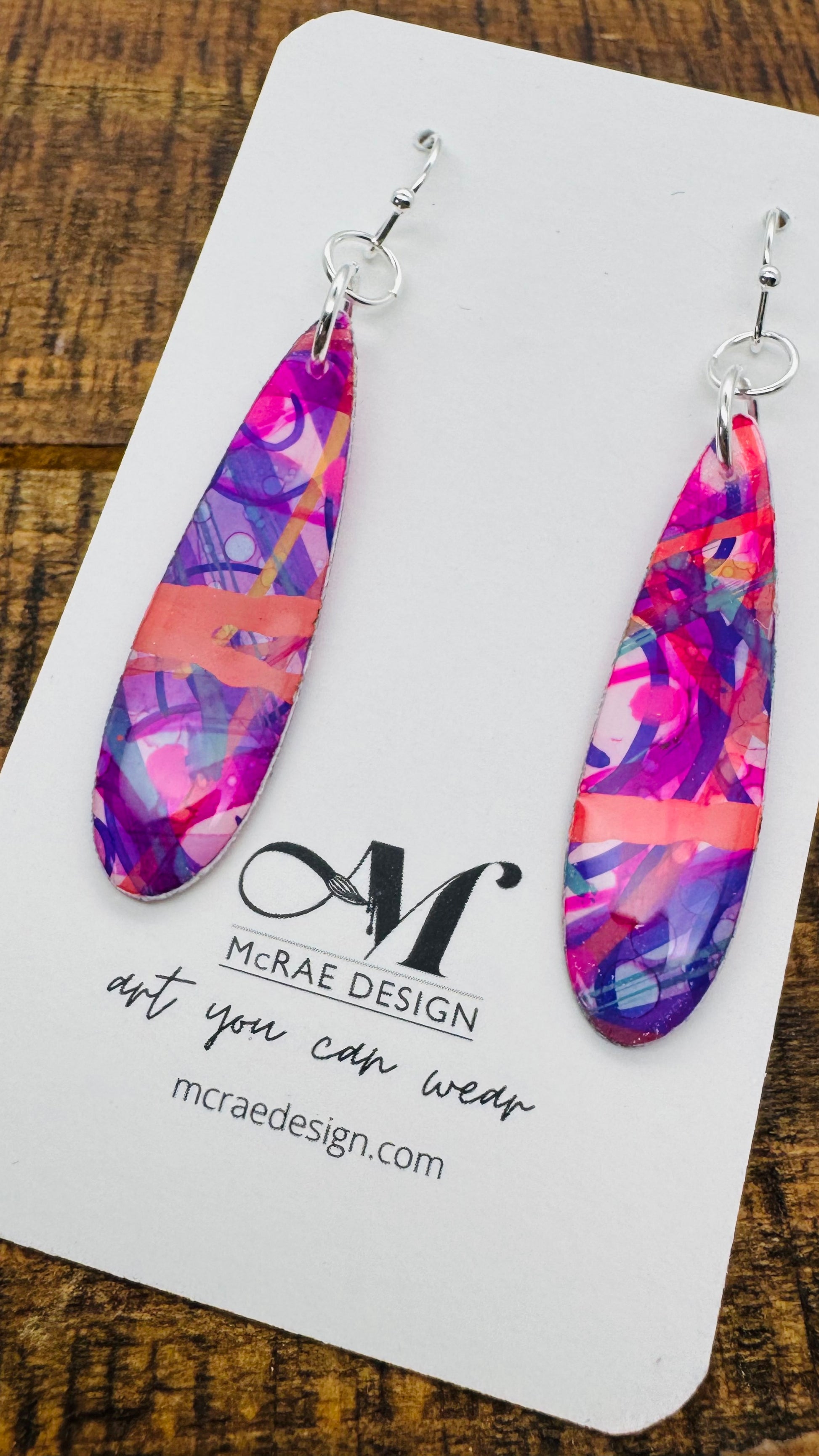 Step into a kaleidoscope of color with the Purple Haze Collection. Each earring is hand-painted on paper and sealed in resin and transformed into a one-of-a-kind work of art, blending vibrant purples, pinks, corals, and playful patterns.