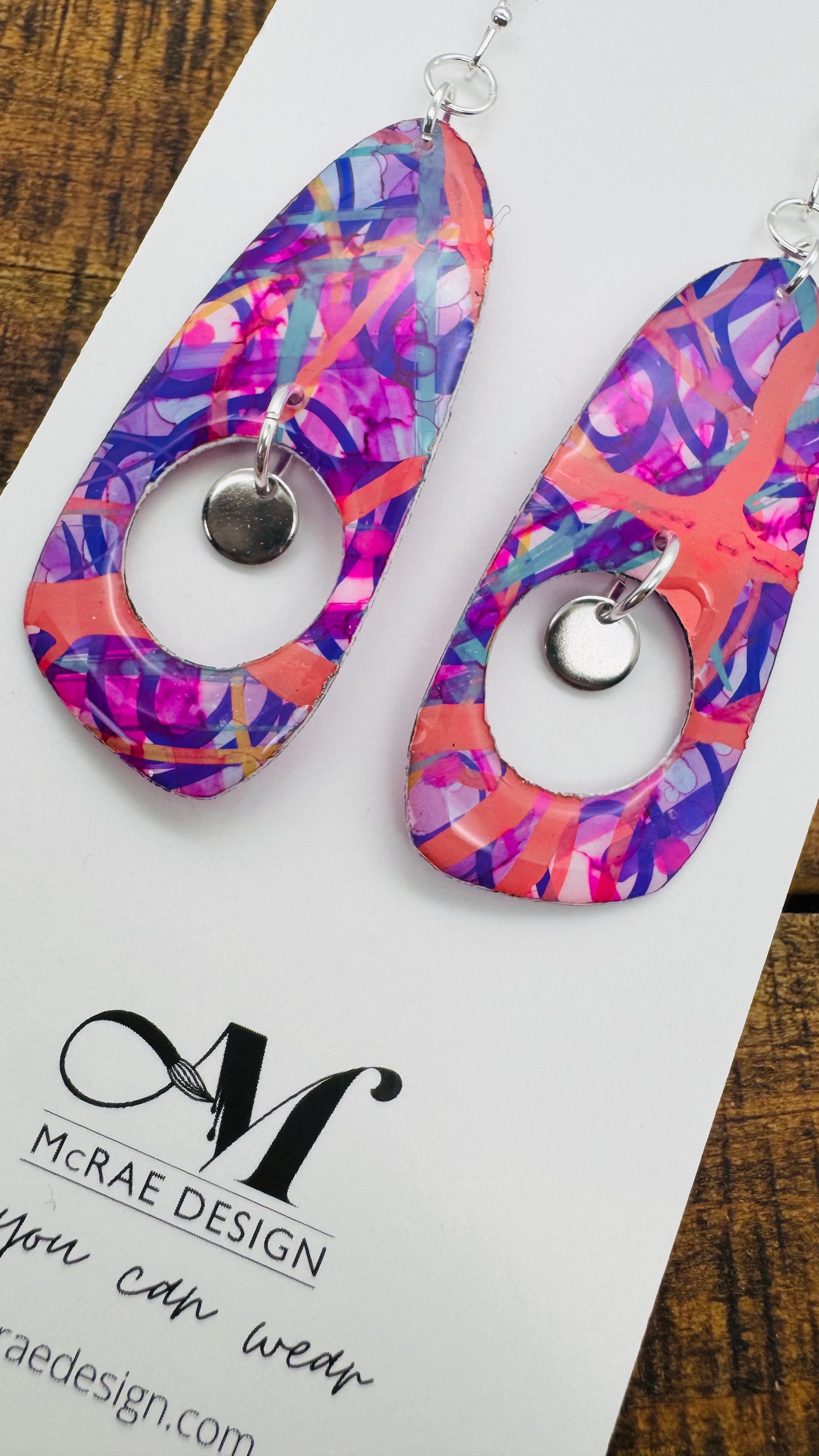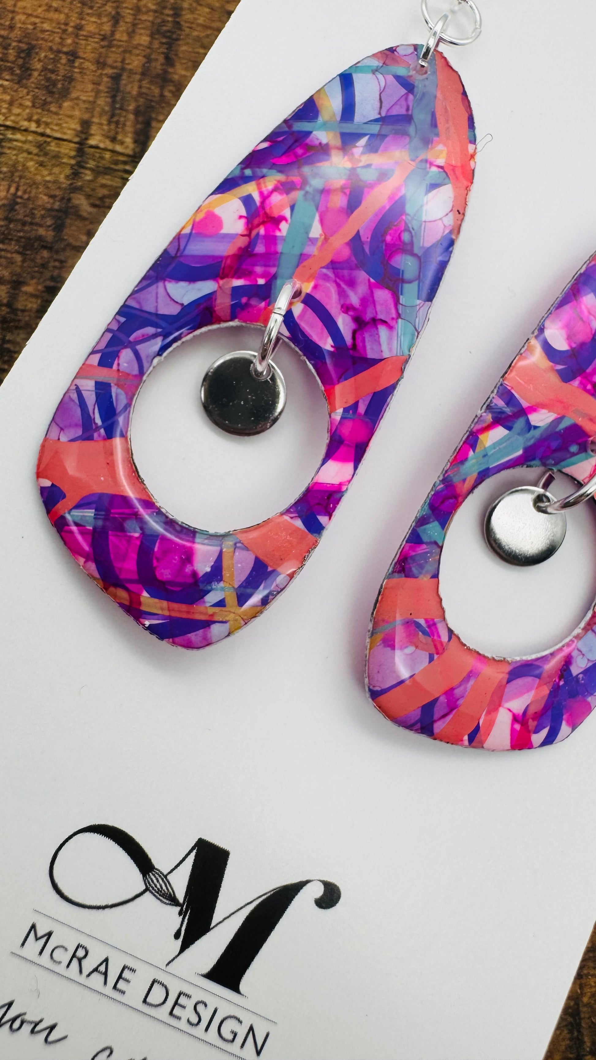 Step into a kaleidoscope of color with the Purple Haze Collection. Each earring is hand-painted on paper and sealed in resin and transformed into a one-of-a-kind work of art, blending vibrant purples, pinks, corals, and playful patterns.