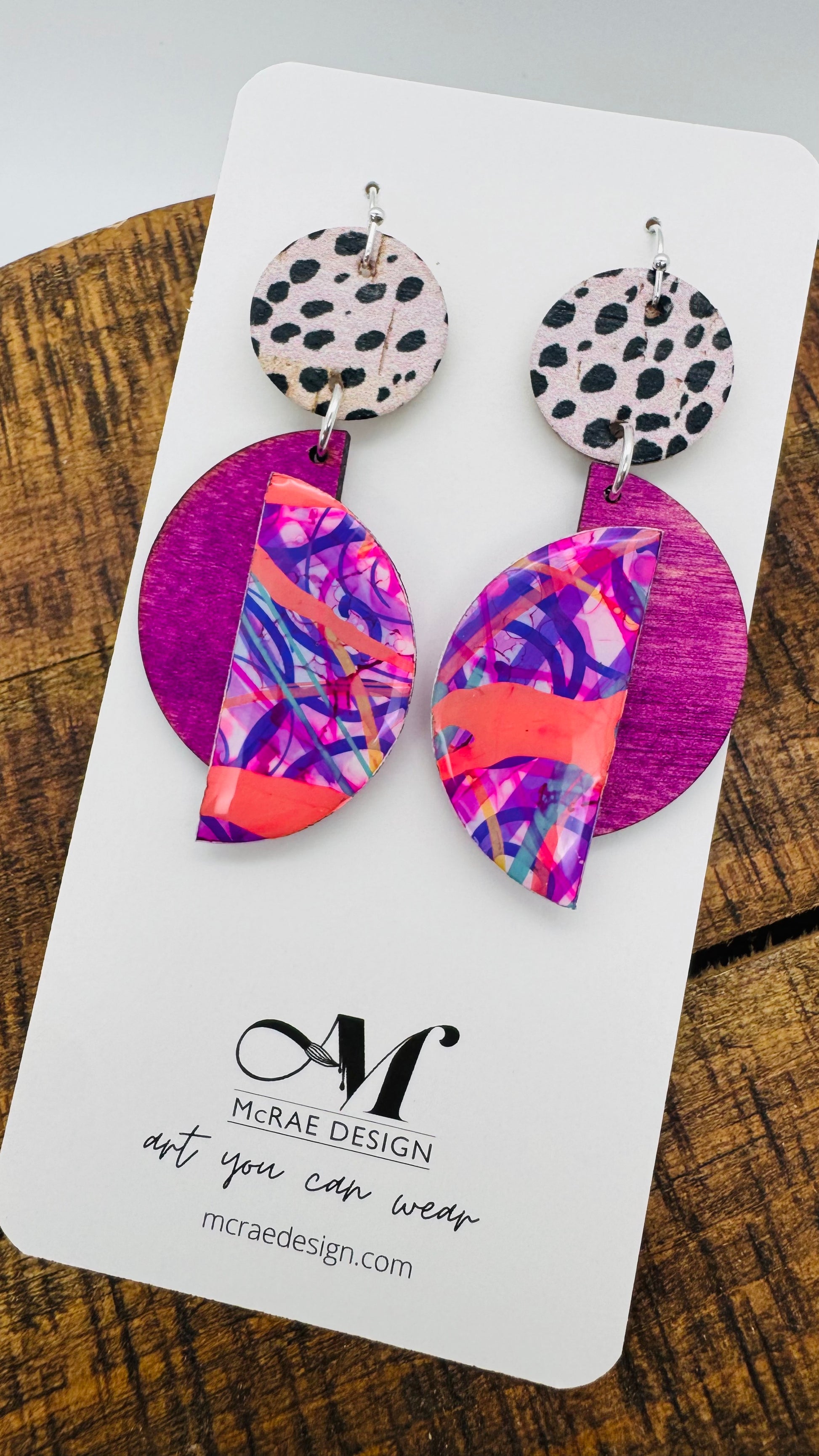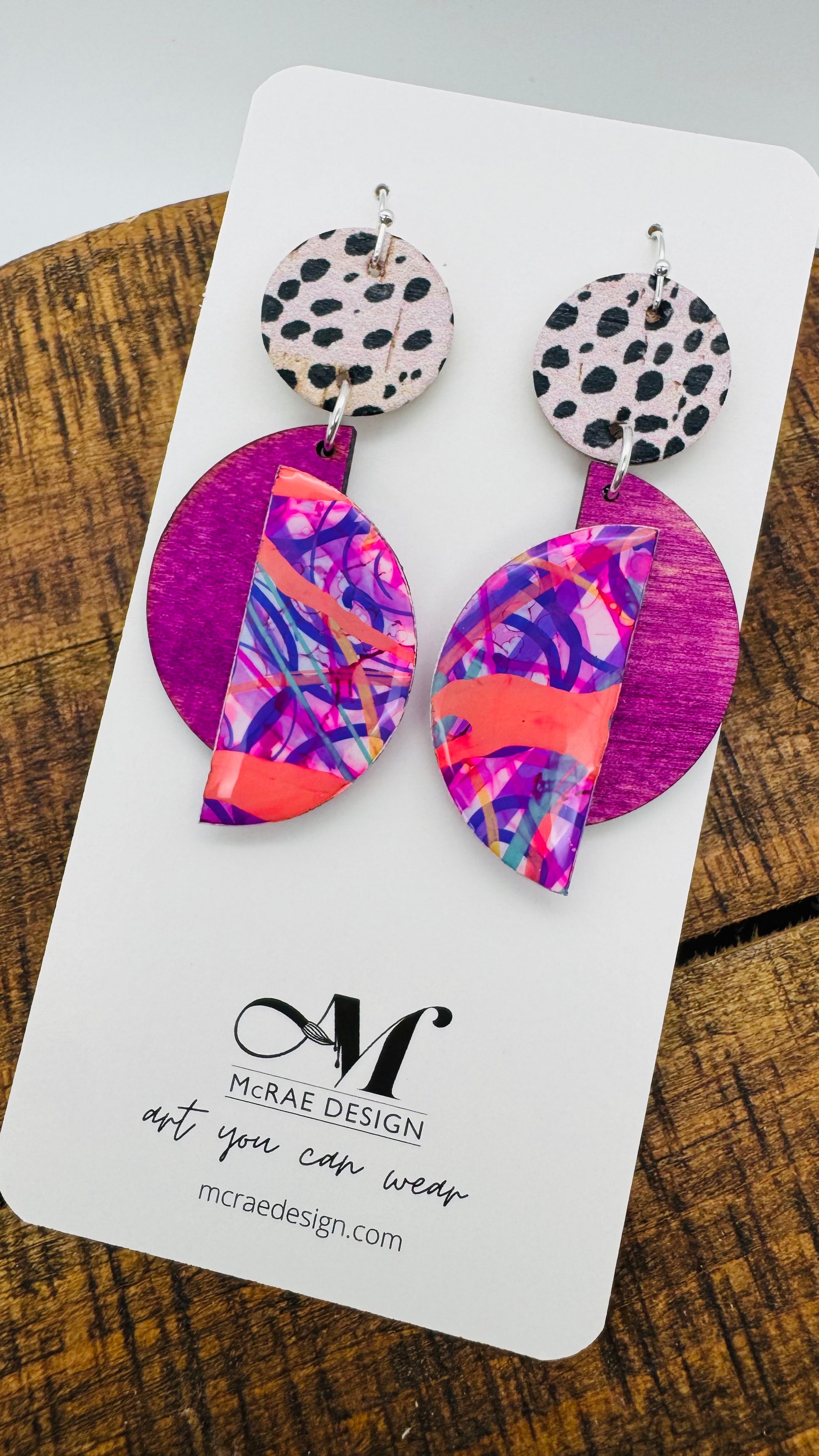Step into a kaleidoscope of color with the Purple Haze Collection. Each earring is hand-painted on paper and sealed in resin and transformed into a one-of-a-kind work of art, blending vibrant purples, pinks, corals, and playful patterns.