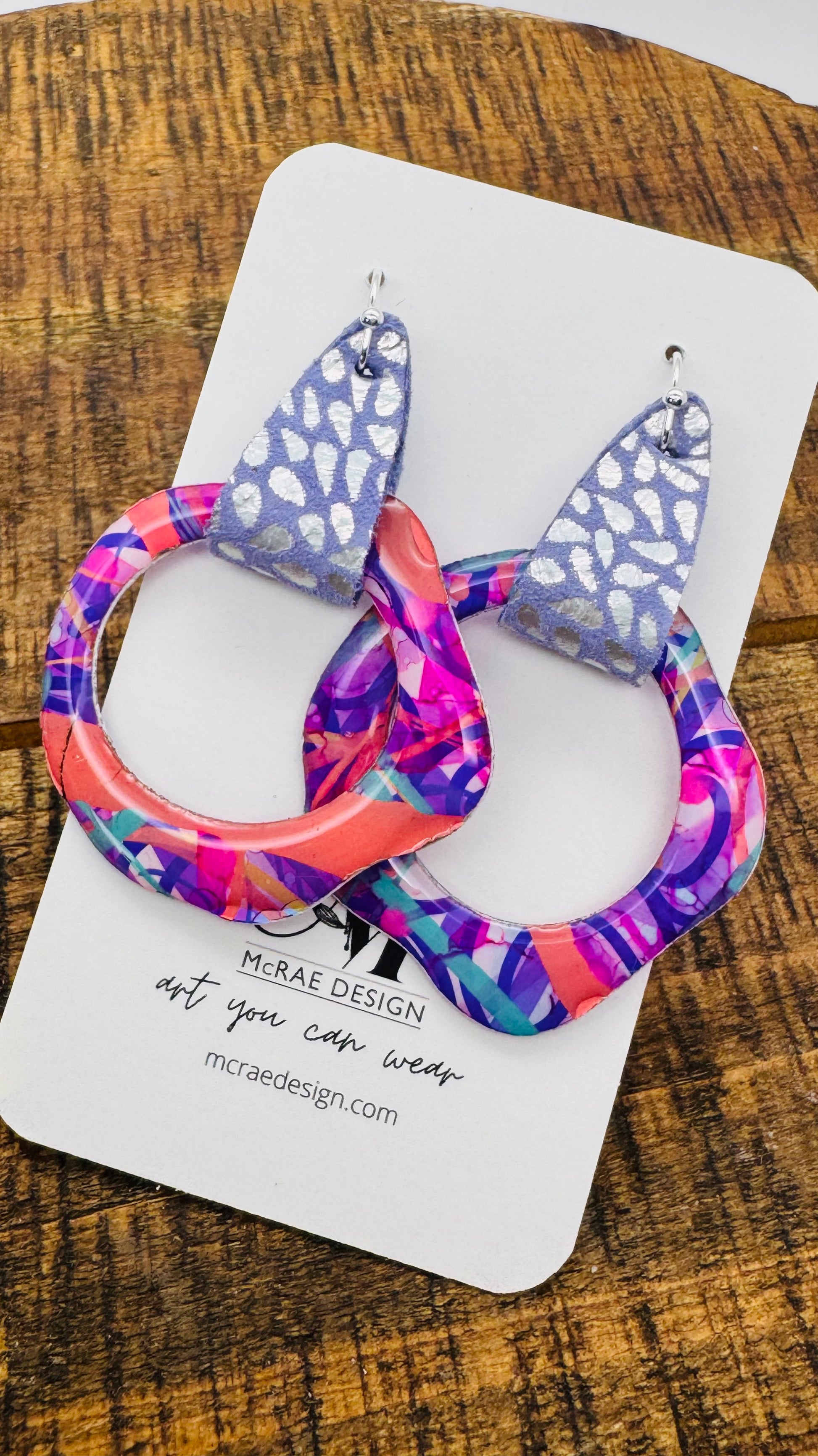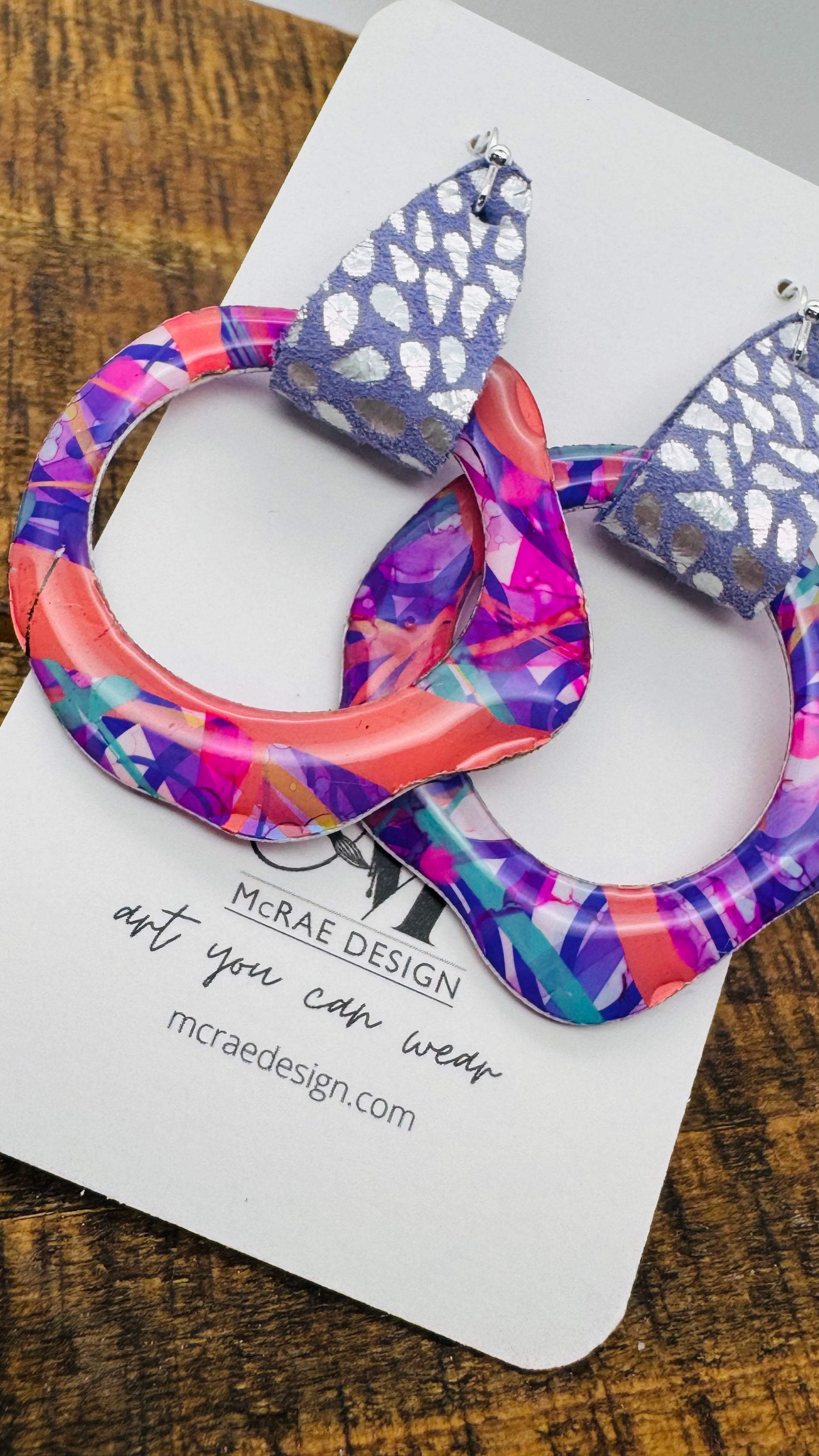 Step into a kaleidoscope of color with the Purple Haze Collection. Each earring is hand-painted on paper and sealed in resin and transformed into a one-of-a-kind work of art, blending vibrant purples, pinks, corals, and playful patterns.