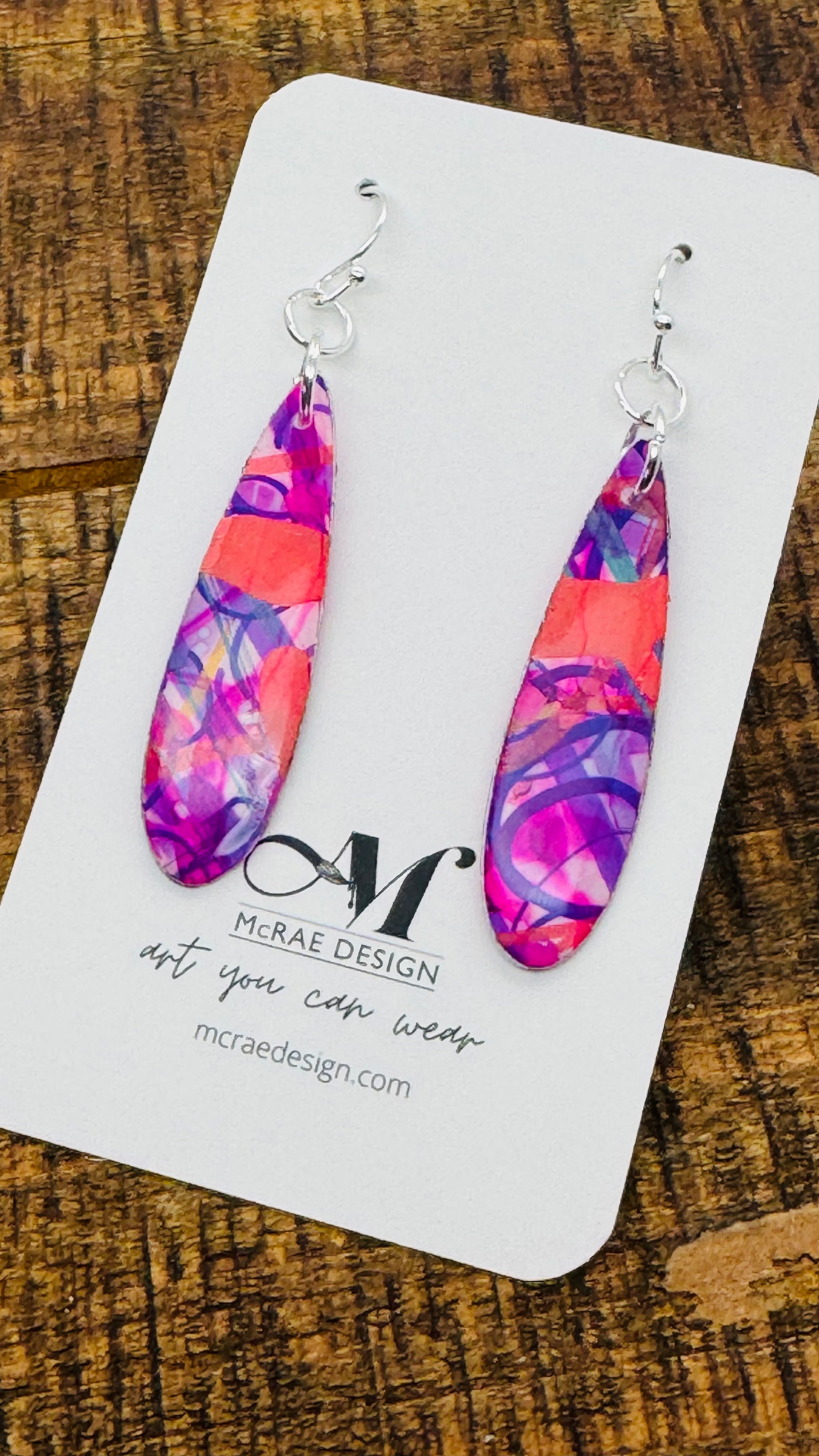 Step into a kaleidoscope of color with the Purple Haze Collection. Each earring is hand-painted on paper and sealed in resin and transformed into a one-of-a-kind work of art, blending vibrant purples, pinks, corals, and playful patterns.