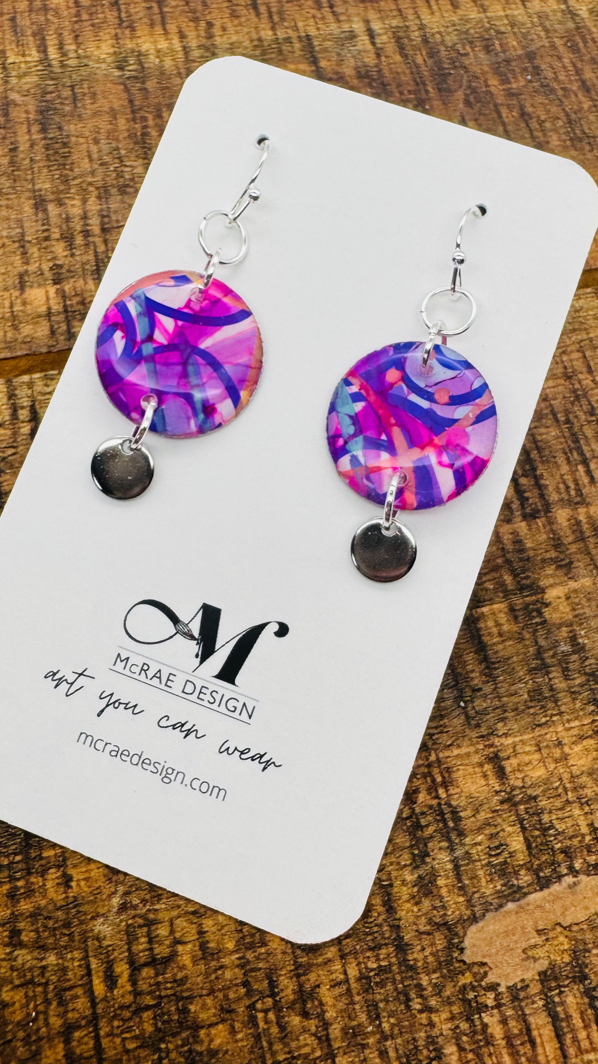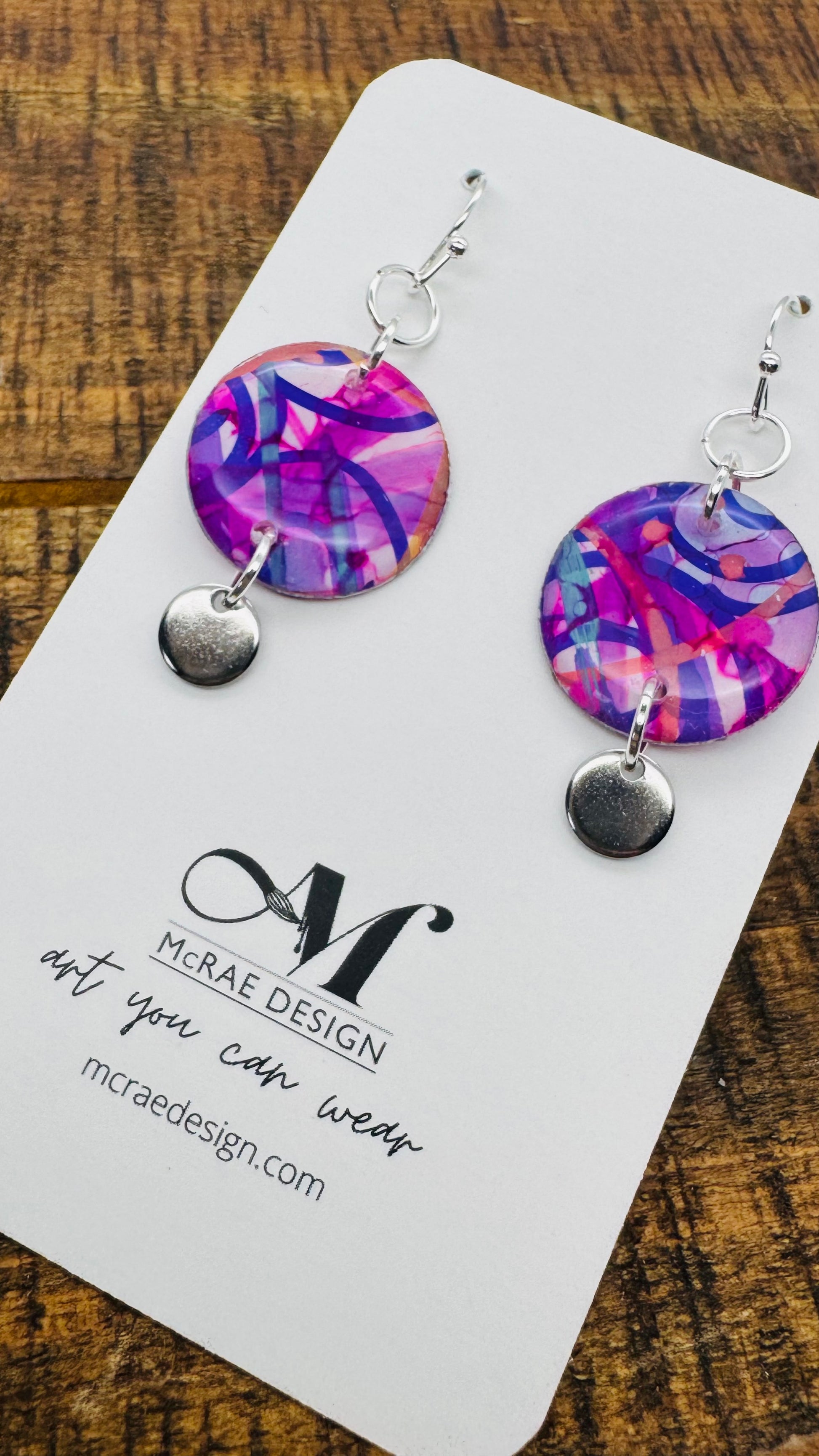 Step into a kaleidoscope of color with the Purple Haze Collection. Each earring is hand-painted on paper and sealed in resin and transformed into a one-of-a-kind work of art, blending vibrant purples, pinks, corals, and playful patterns.