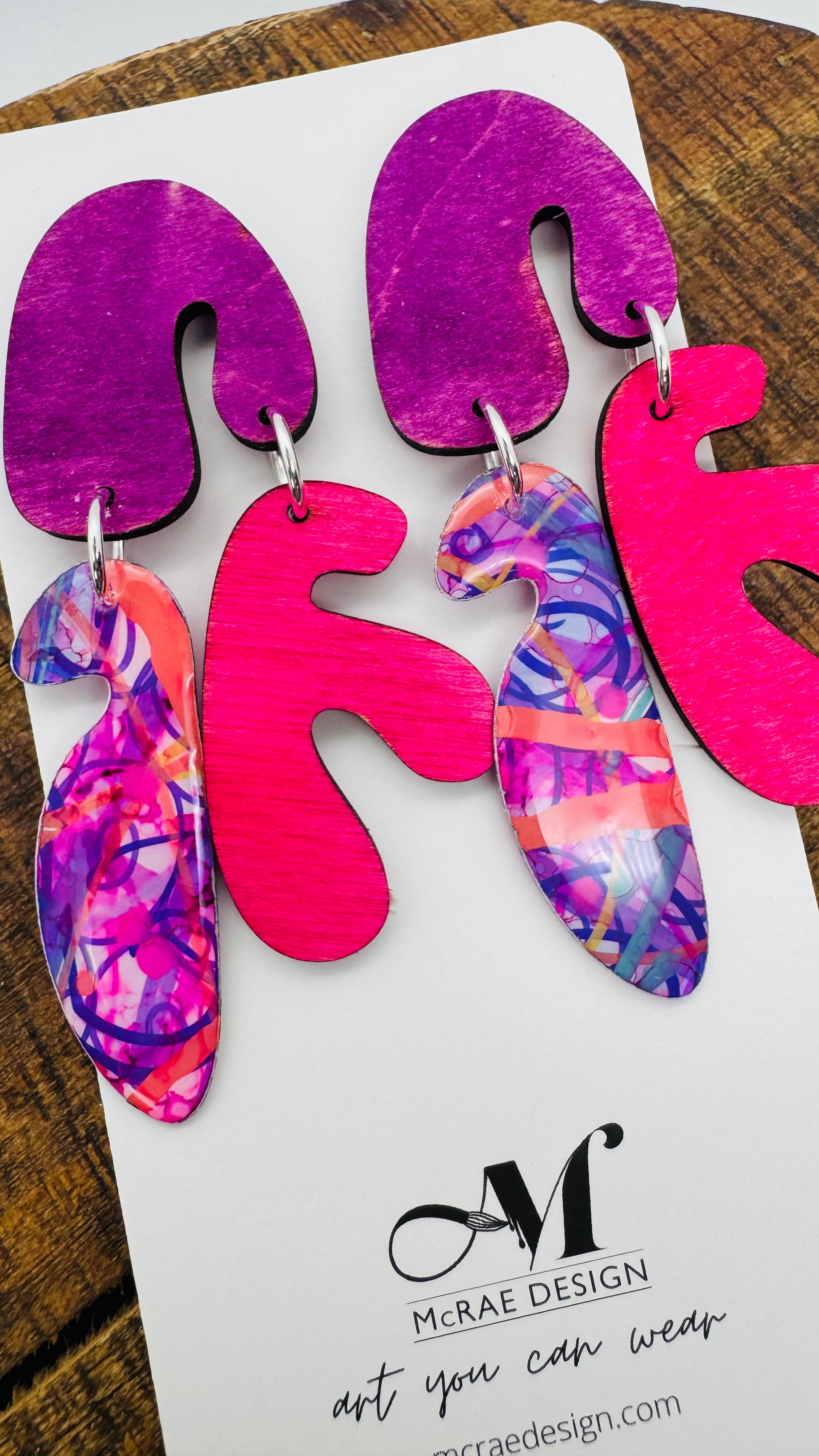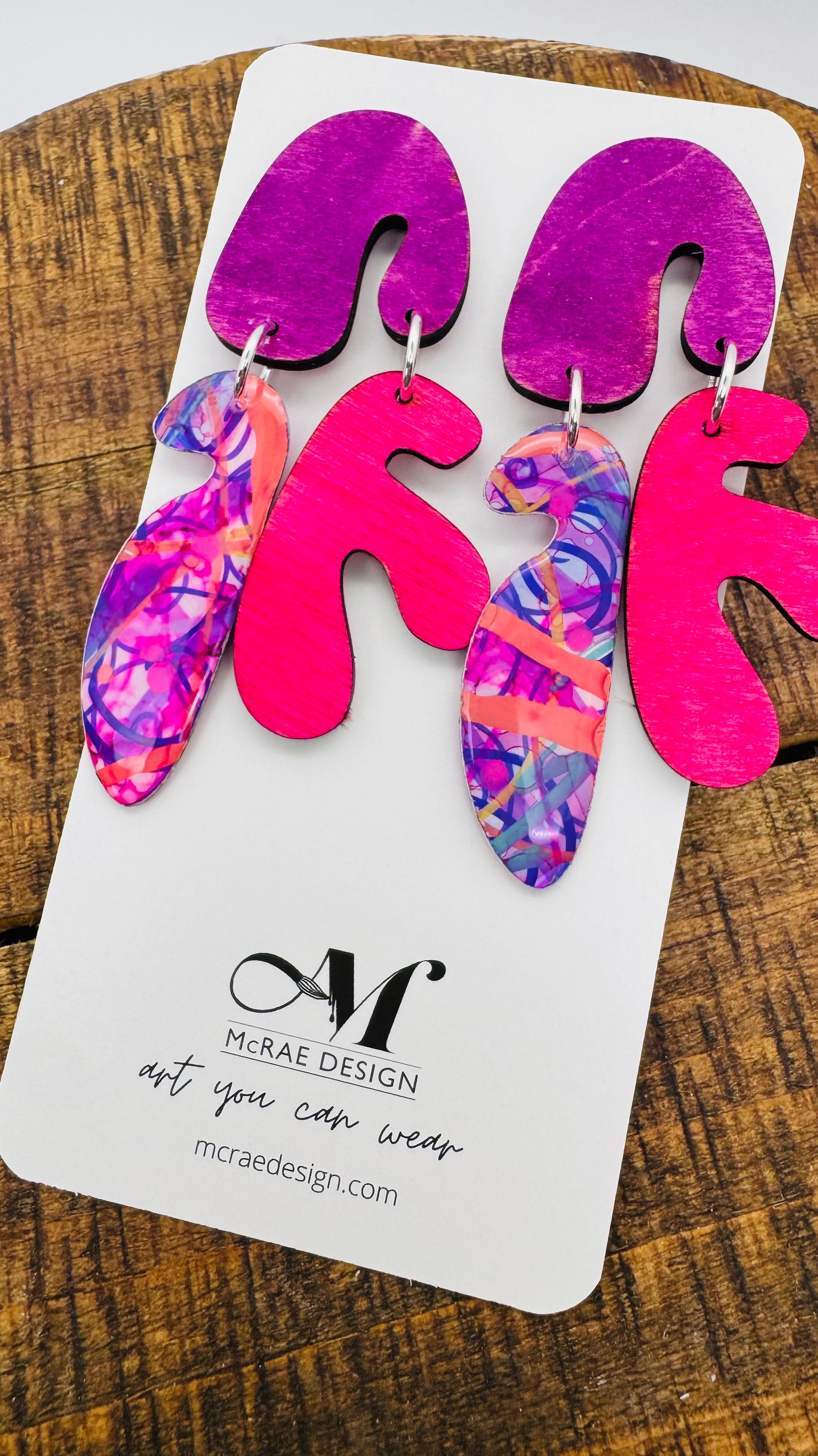 Step into a kaleidoscope of color with the Purple Haze Collection. Each earring is hand-painted on paper and sealed in resin and transformed into a one-of-a-kind work of art, blending vibrant purples, pinks, corals, and playful patterns.