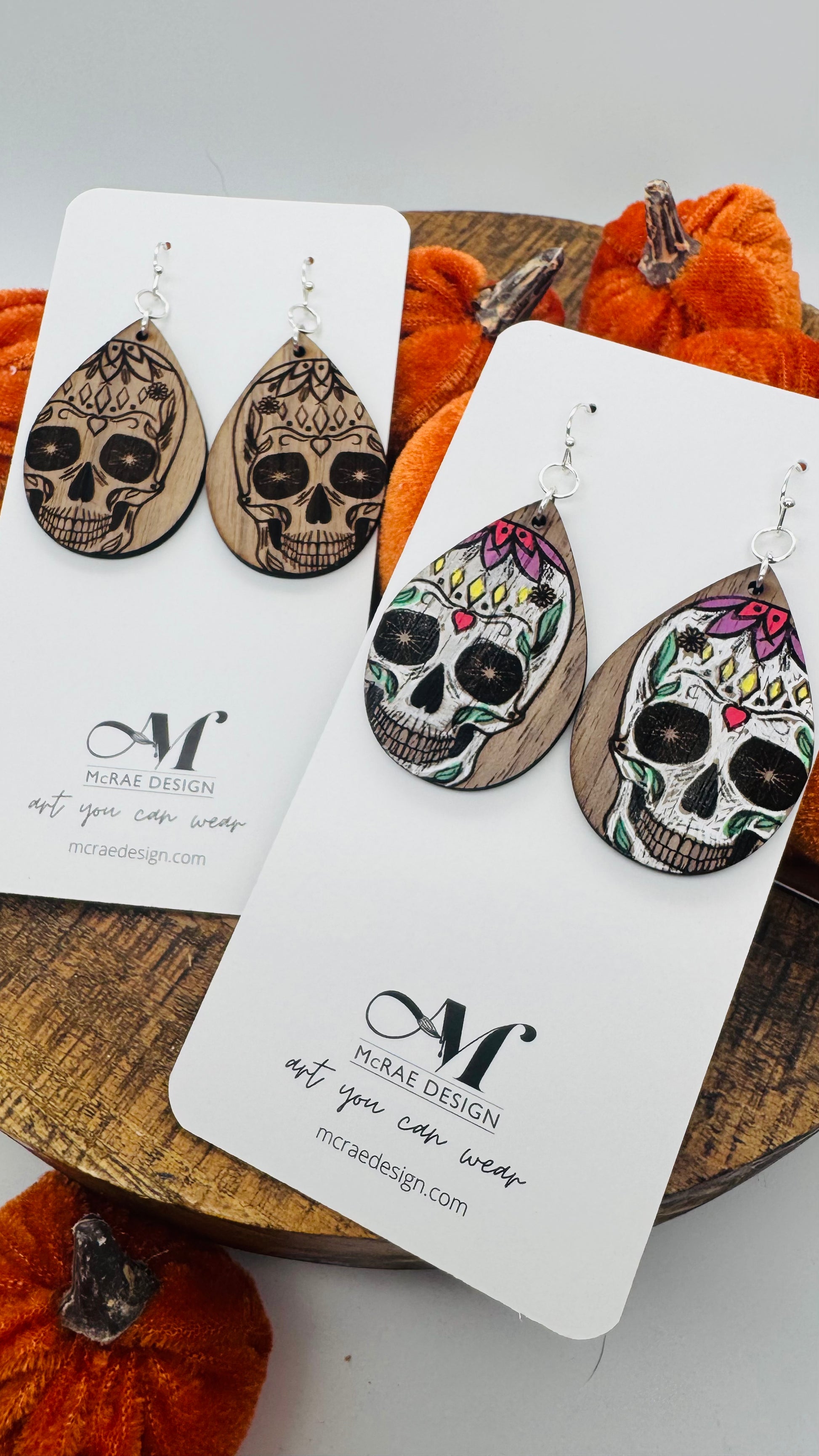 Crafted from rich black walnut and painted on birchwood, these lightweight designs blend playful charm with intricate detail. From sugar skulls to whimsical little framed ghosts and colorful polka-dotted pumpkins, no two pairs are ever exactly alike.