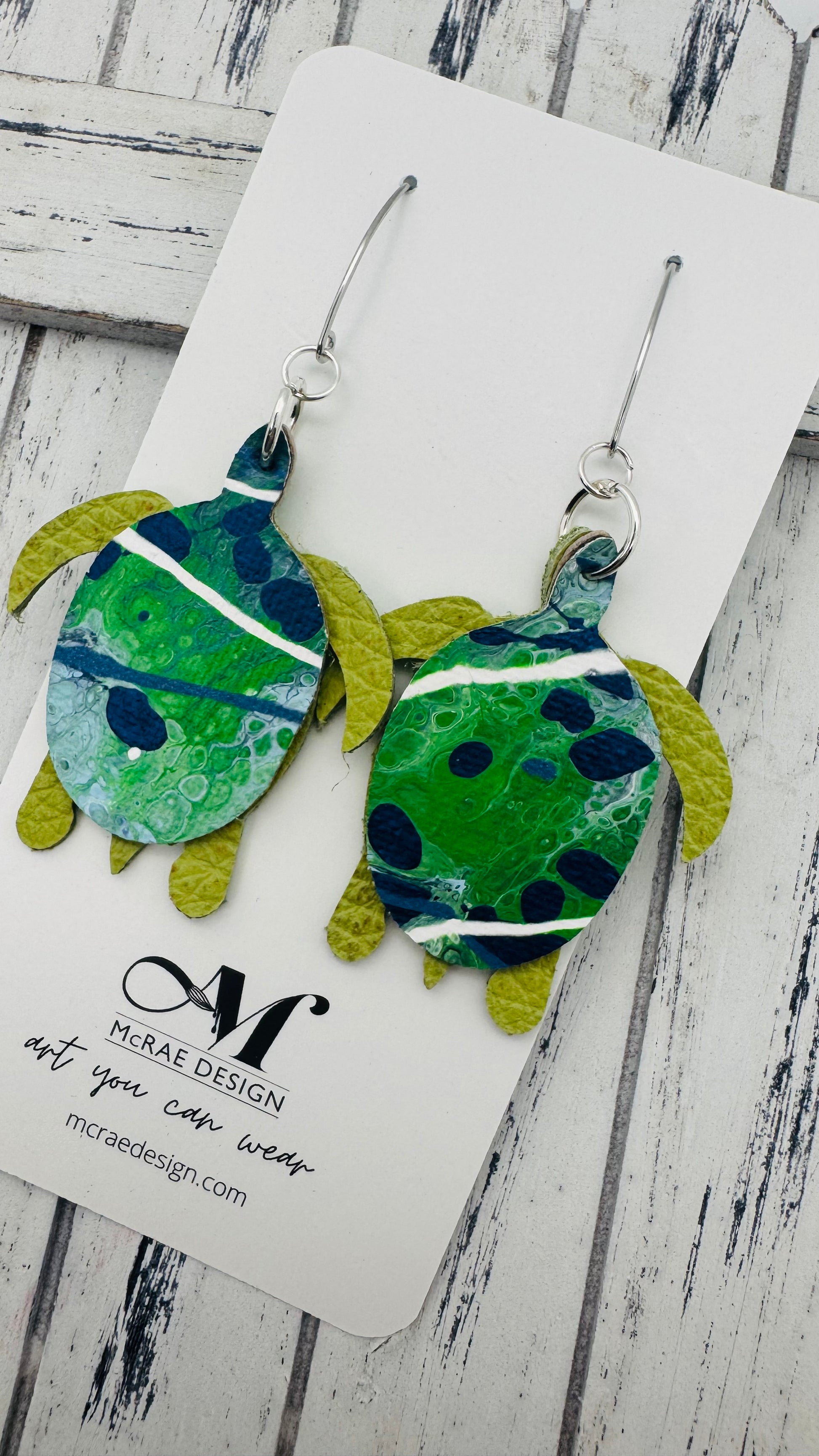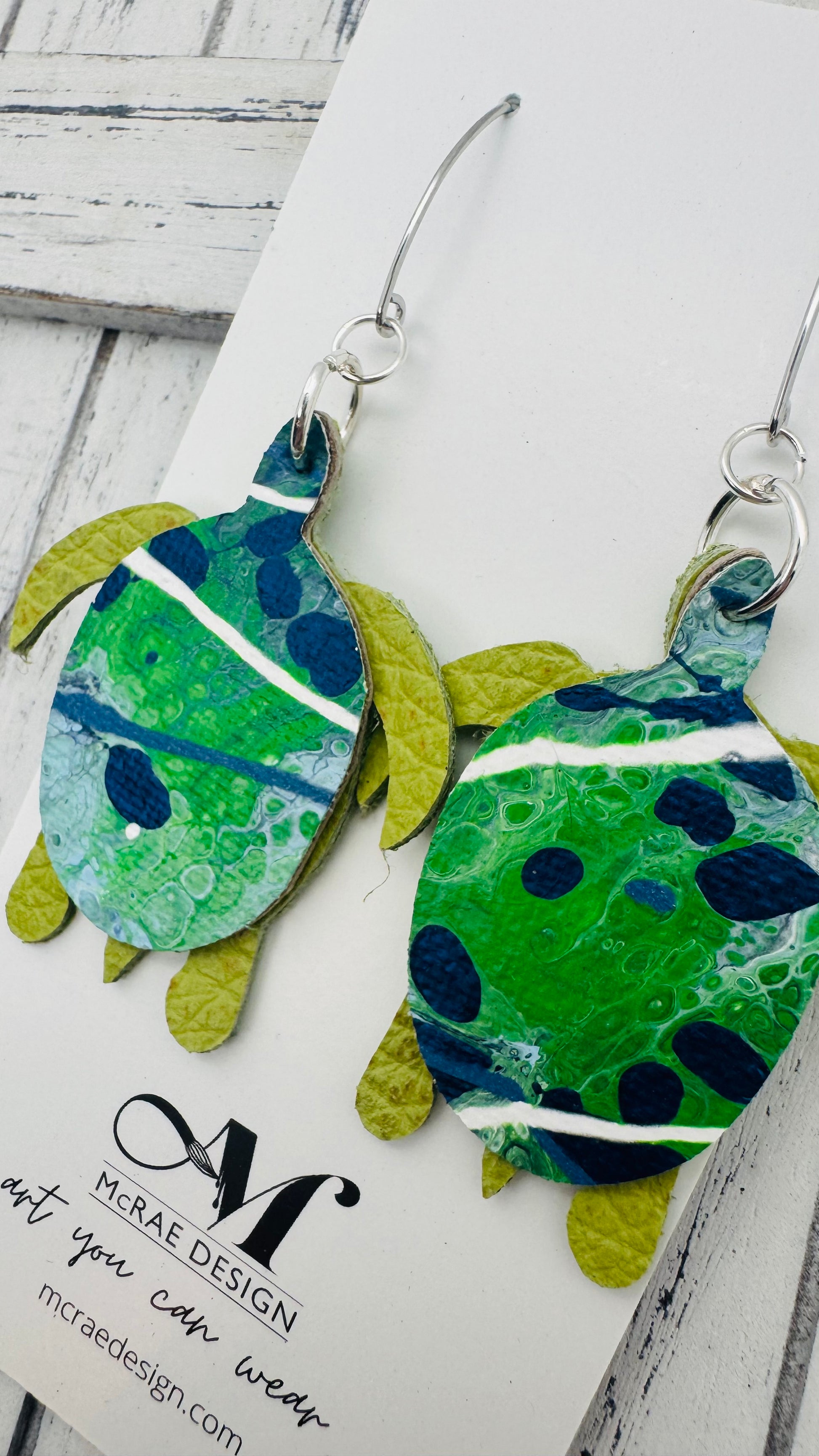 Meet Surfer Girl — a dreamy, salt-kissed collection of wearable art inspired by the shimmer of ocean waves and the nostalgia of endless summer days. Every pair begins as a hand-painted canvas, then carefully cut into oceanic silhouettes like mermaid tails, turtles, and sand dollars. With metallic navy blues, vibrant kelly greens, soft Carolina blue, and bright whites, these earrings echo the rhythm of tides and the sparkle of sunlight on the sea.
