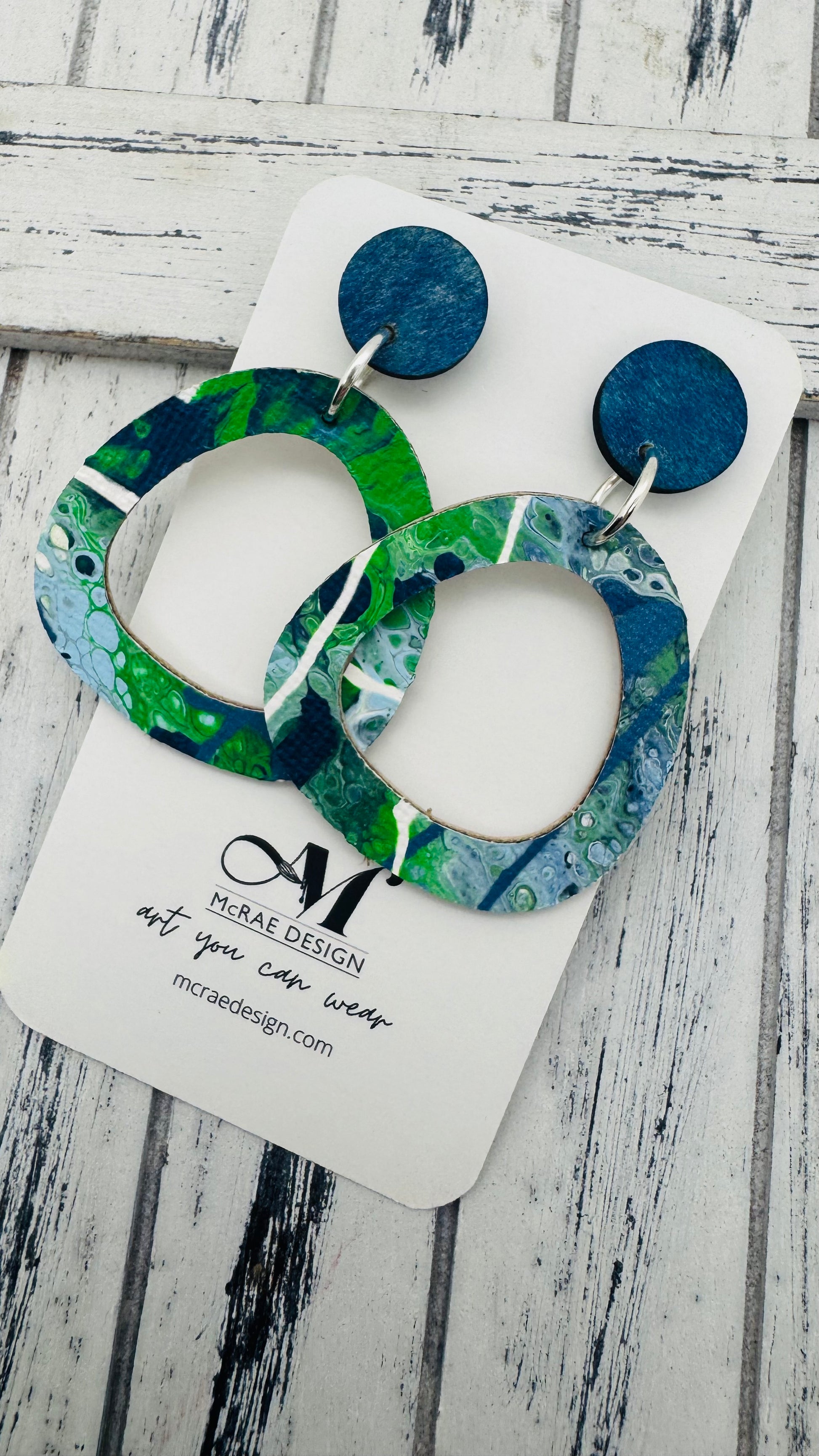 Meet Surfer Girl — a dreamy, salt-kissed collection of wearable art inspired by the shimmer of ocean waves and the nostalgia of endless summer days. Every pair begins as a hand-painted canvas, then carefully cut into oceanic silhouettes like mermaid tails, turtles, and sand dollars. With metallic navy blues, vibrant kelly greens, soft Carolina blue, and bright whites, these earrings echo the rhythm of tides and the sparkle of sunlight on the sea.