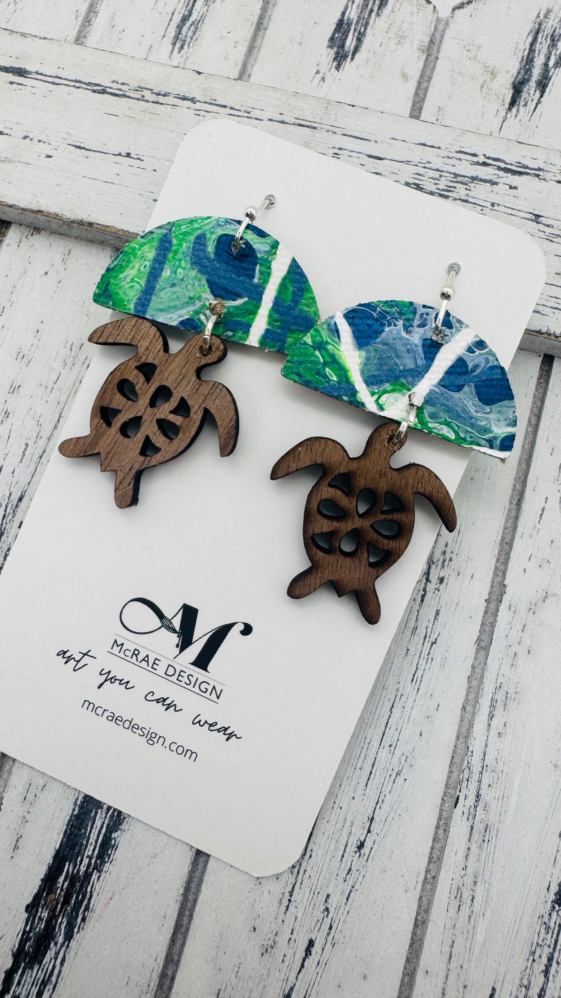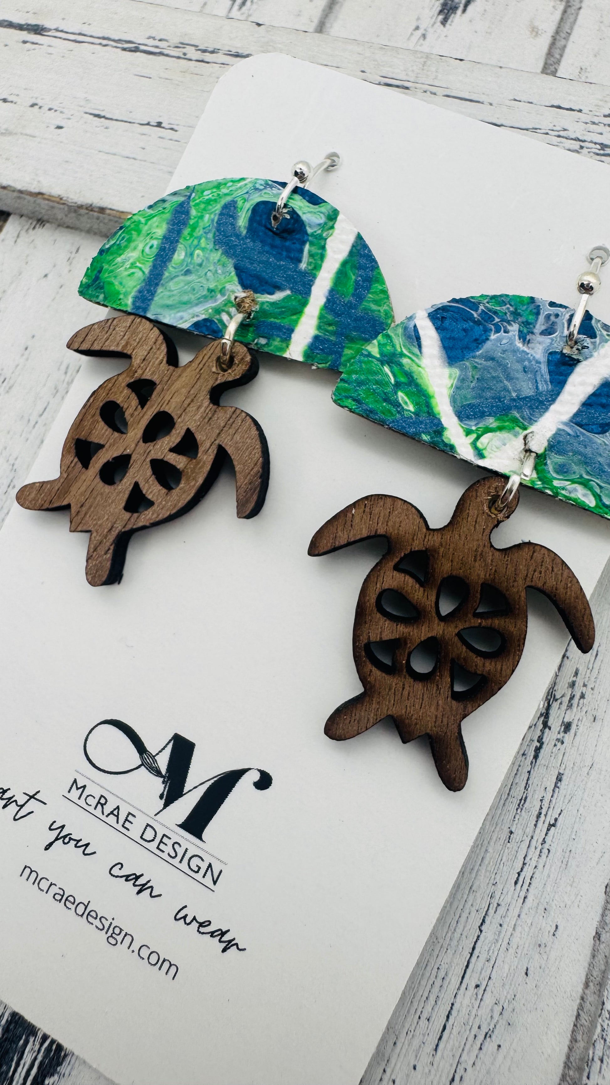 Meet Surfer Girl — a dreamy, salt-kissed collection of wearable art inspired by the shimmer of ocean waves and the nostalgia of endless summer days. Every pair begins as a hand-painted canvas, then carefully cut into oceanic silhouettes like mermaid tails, turtles, and sand dollars. With metallic navy blues, vibrant kelly greens, soft Carolina blue, and bright whites, these earrings echo the rhythm of tides and the sparkle of sunlight on the sea.