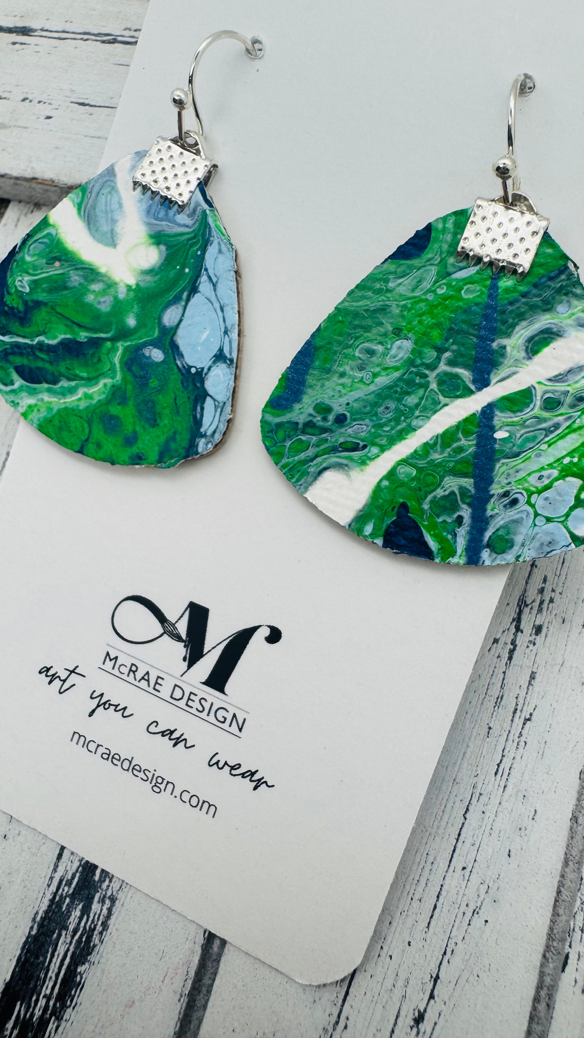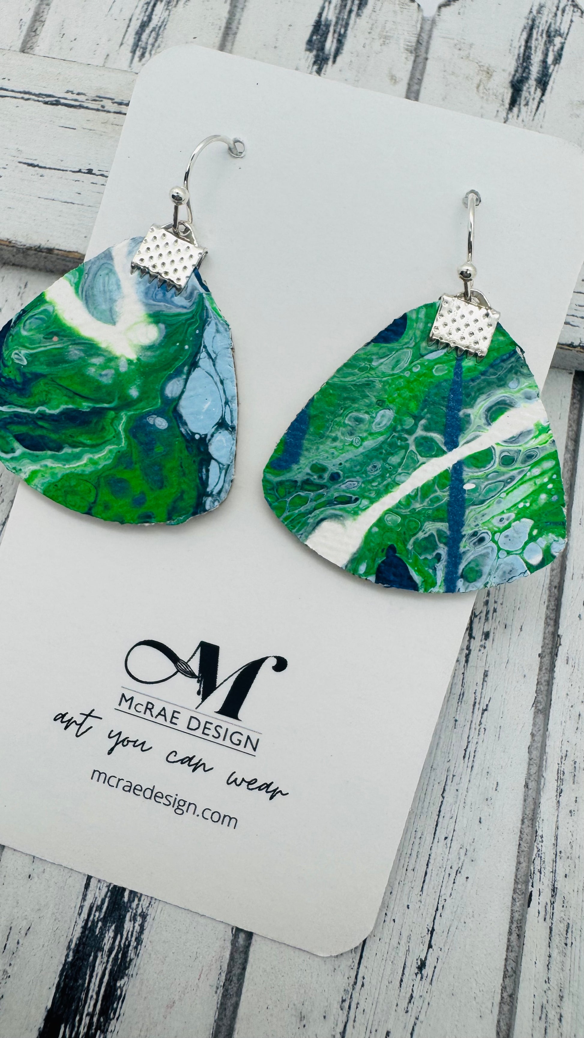 Meet Surfer Girl — a dreamy, salt-kissed collection of wearable art inspired by the shimmer of ocean waves and the nostalgia of endless summer days. Every pair begins as a hand-painted canvas, then carefully cut into oceanic silhouettes like mermaid tails, turtles, and sand dollars. With metallic navy blues, vibrant kelly greens, soft Carolina blue, and bright whites, these earrings echo the rhythm of tides and the sparkle of sunlight on the sea.